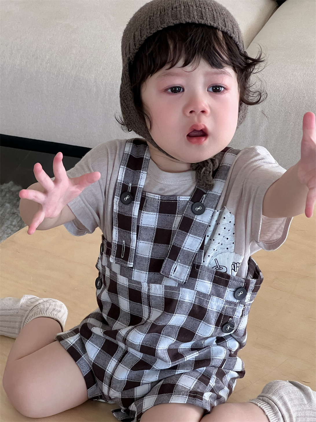 薄手の素材を使用しているため、暑い日でもお子様が快適に過ごせるよう、通気性と肌触りにこだわりました。ゆったりとした作りなので、ベビーの活発な動きを妨げずにのびのびと過ごせます。上下セットで着用することで、簡単に統一感のあるおしゃれなコーディネートが完成します。また、それぞれのアイテムを別々に着回すこともできるため、お手持ちの服と組み合わせて様々なスタイルをお楽しみいただけます。この半袖Tシャツとブロックチェックサスペンダーパンツサロペットのセットアップは、お子様の日常の装いに彩りを添える一着です。