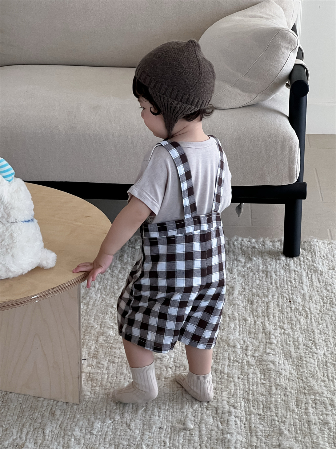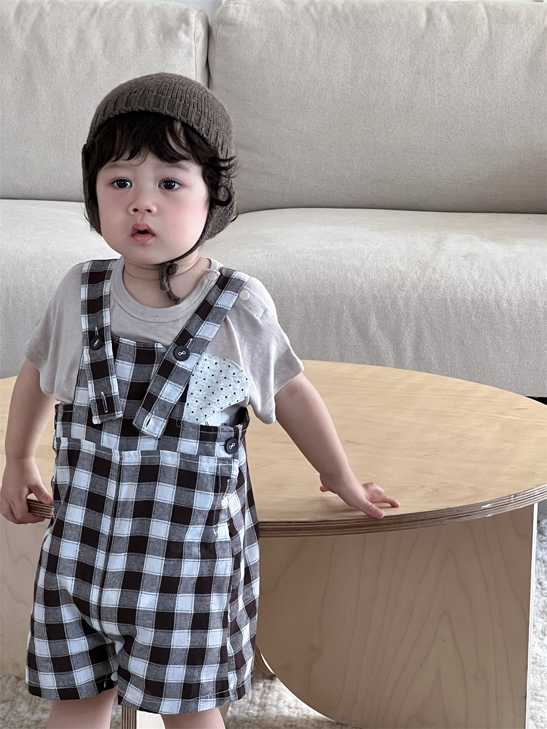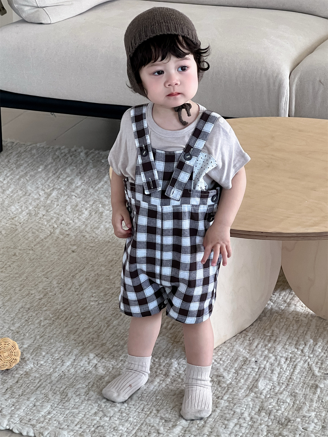 ブロックチェックサスペンダーパンツサロペットと半袖Tシャツのセットアップです。Tシャツはシンプルながらも涼しげな半袖デザインで、サロペットはレトロなブロックチェック柄が特徴です。肩紐のあるサスペンダータイプで、お子様の可愛らしさを引き立てます。