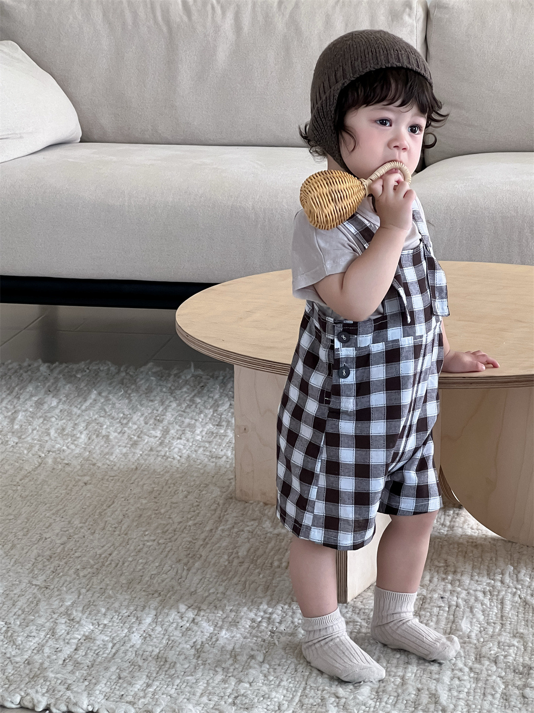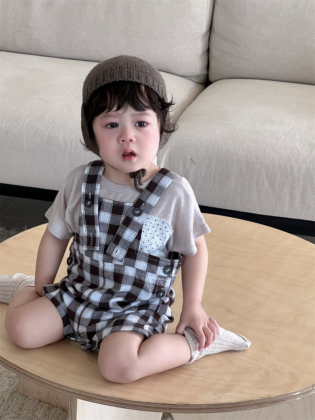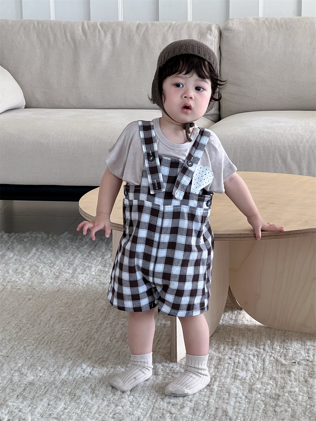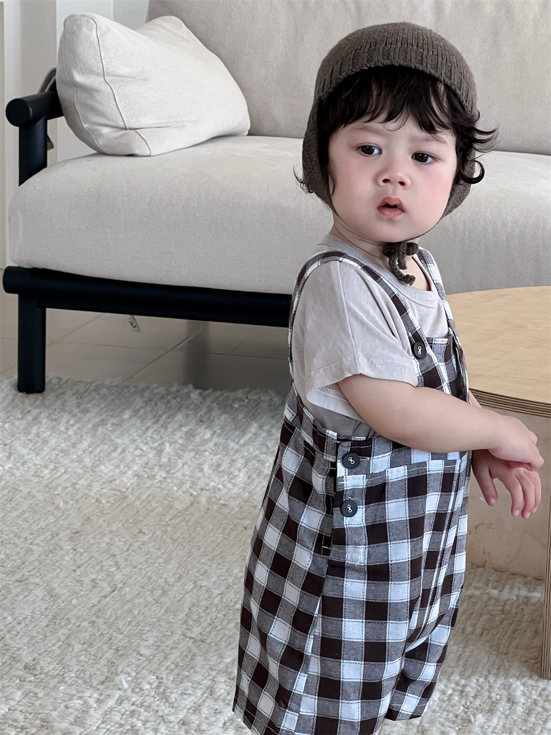 ブロックチェックサスペンダーパンツサロペットと半袖Tシャツのセットアップです。Tシャツはシンプルながらも涼しげな半袖デザインで、サロペットはレトロなブロックチェック柄が特徴です。肩紐のあるサスペンダータイプで、お子様の可愛らしさを引き立てます。