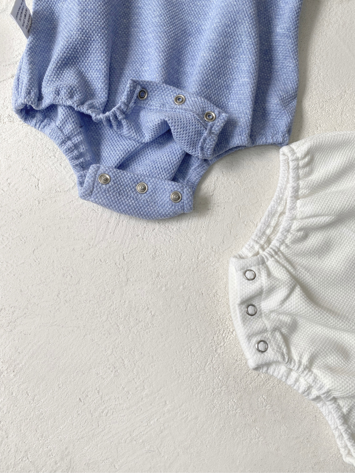 Aクラスの肌触りの良いコットン素材で仕立てられているため、デリケートな赤ちゃんの肌に優しく、通気性も抜群です。夏の暑い日でも、赤ちゃんが快適に過ごせるよう配慮されています。おむつをすっぽり包む三角形のシルエットで、活発に動き回る赤ちゃんも安心です。普段使いはもちろん、ちょっとしたお出かけや記念撮影にもぴったりの、上品で可愛らしいロンパースです。
