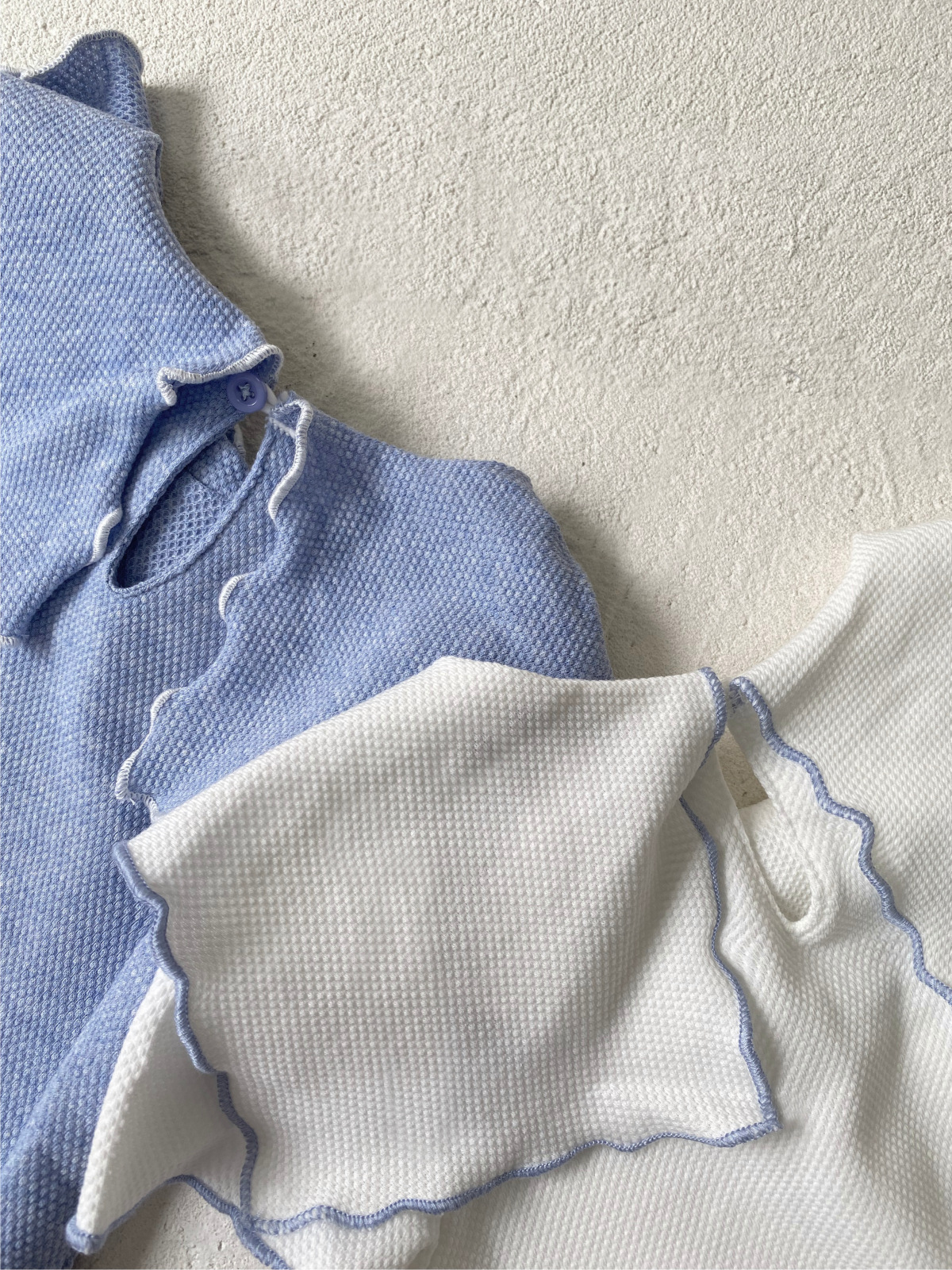 大きなフリルが目を引くメロフリルショールカラー半袖ロンパースです。波打つようなメロウフリルが襟元と袖にあしらわれ、赤ちゃんの可愛らしさを一層引き立てます。