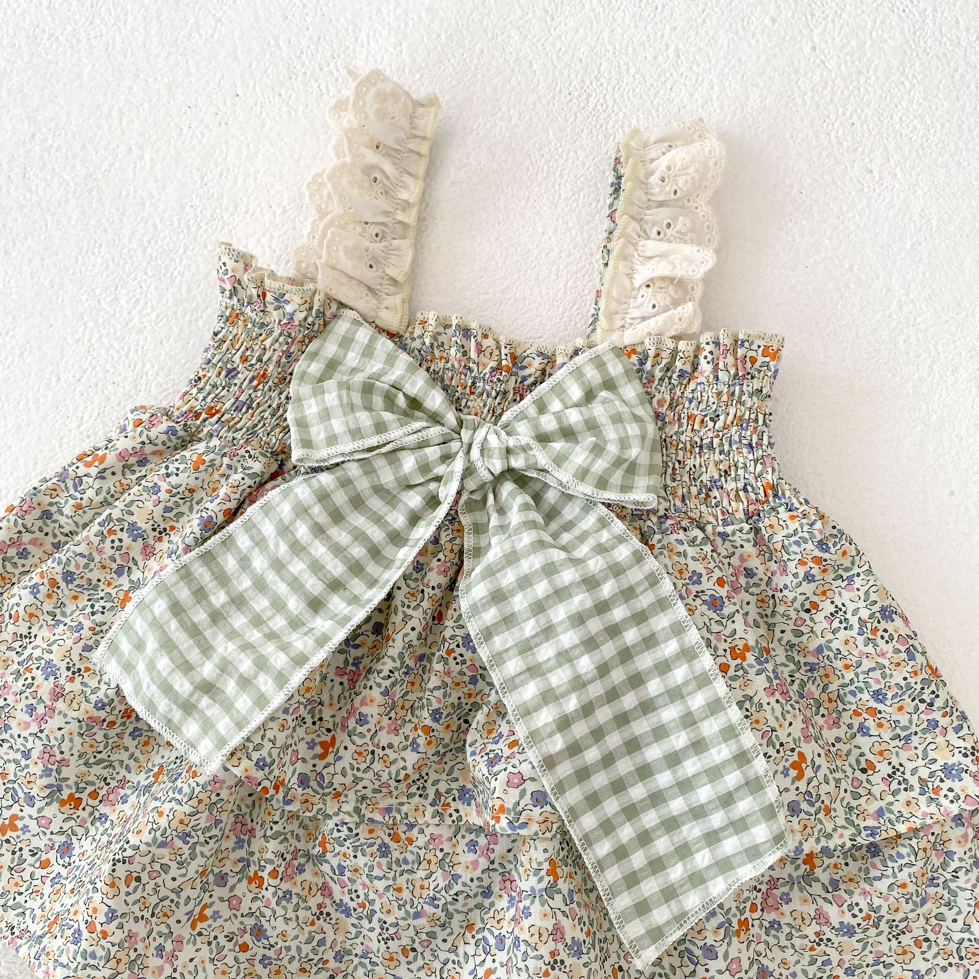 大きなリボンとフリルが愛らしい、夏にぴったりのビッグリボンキャミソールブラウス+フリルブルマパンツセットアップです。まるで海外のベビー服のような、おしゃれでキュートな2点セット。