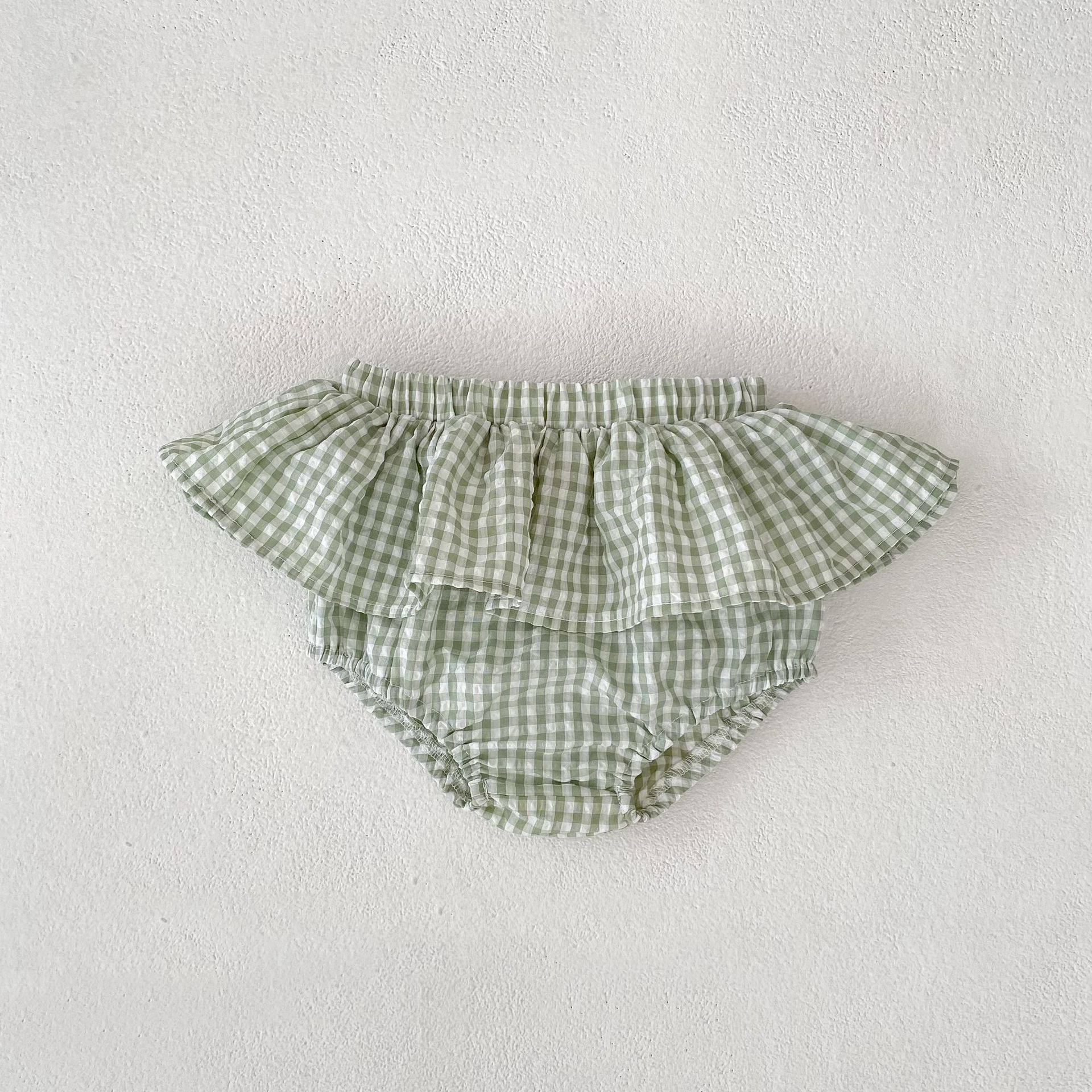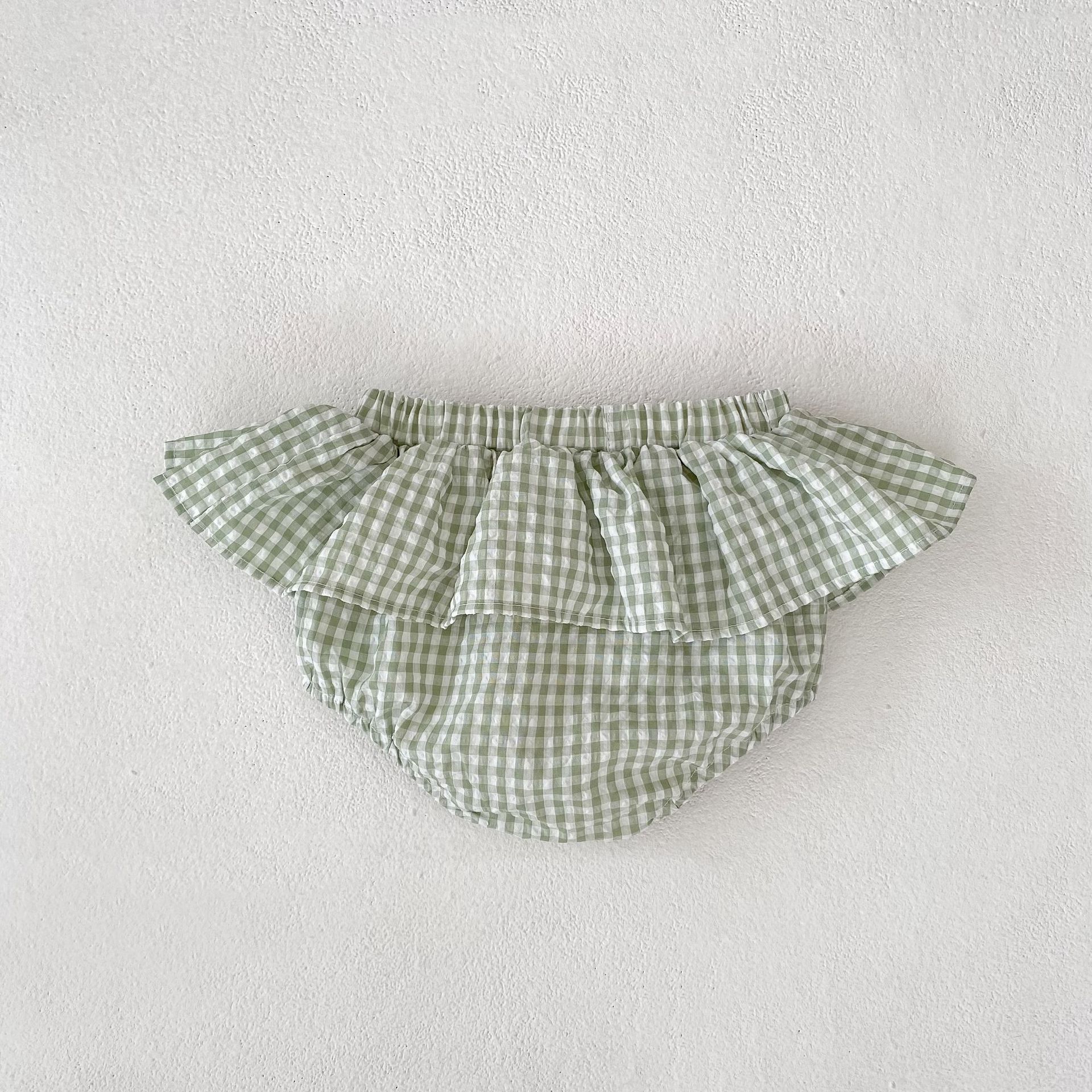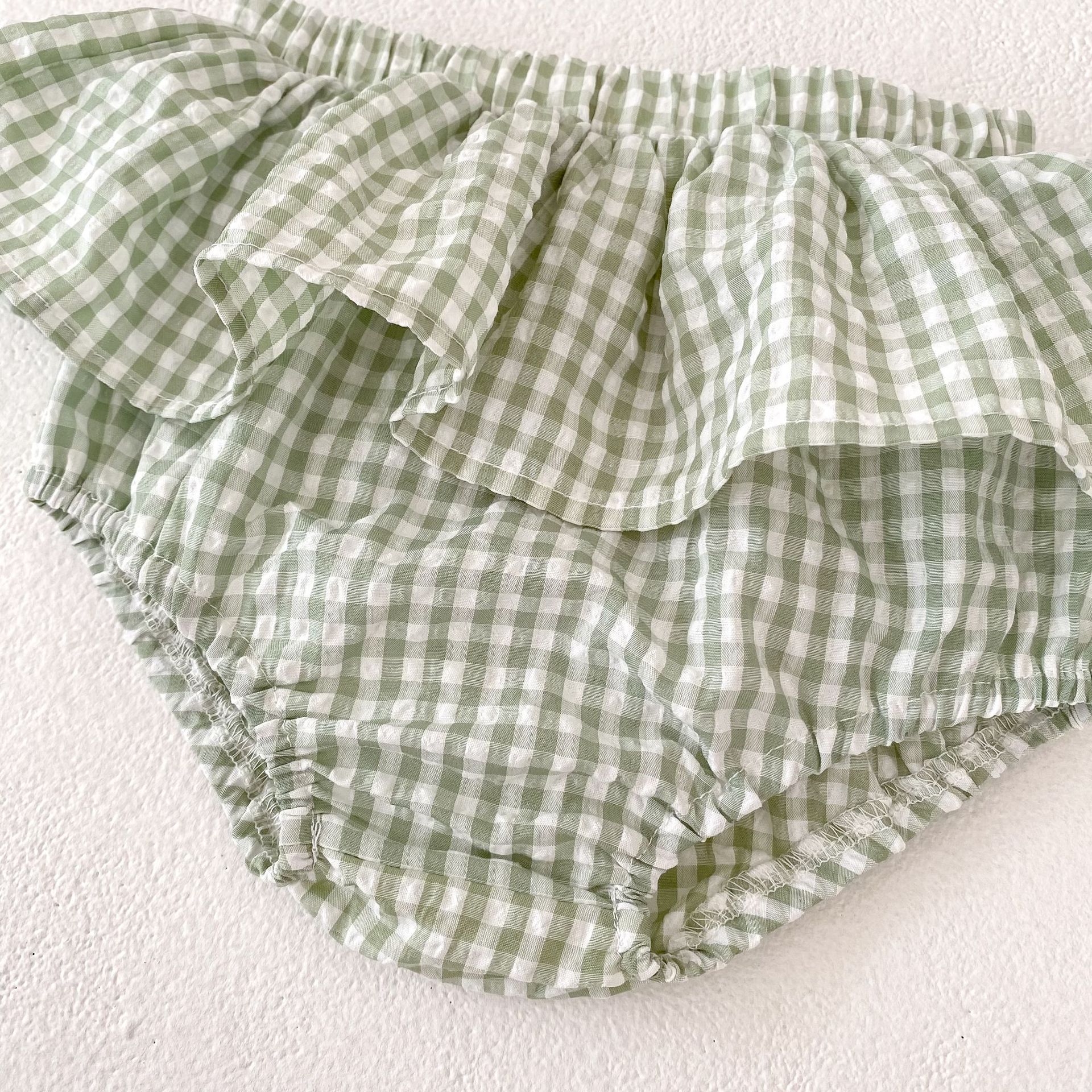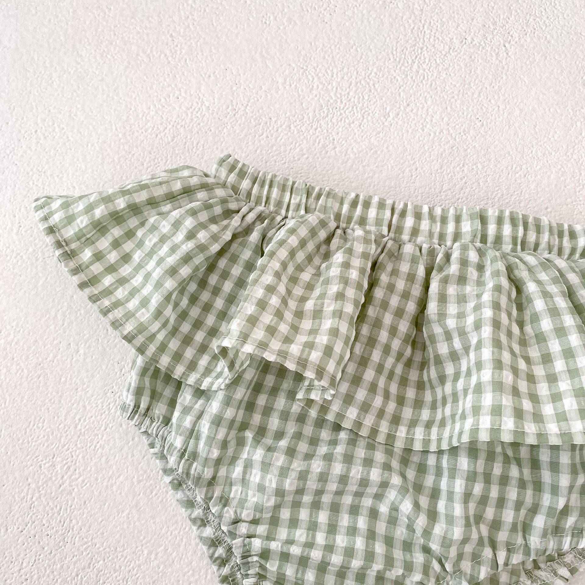 トップスは、背中の大きなリボンが目を引くキャミソールブラウス。涼しげなコットン素材で、暑い夏でもお子さんが快適に過ごせます。ボトムスは、足元にフリルがあしらわれたブルマパンツ。おむつを履いたベビーもすっきりとしたシルエットで、動きやすさも抜群です。セットで着用すると統一感のある愛らしいスタイルが完成し、それぞれ単品でも着回しが楽しめます。