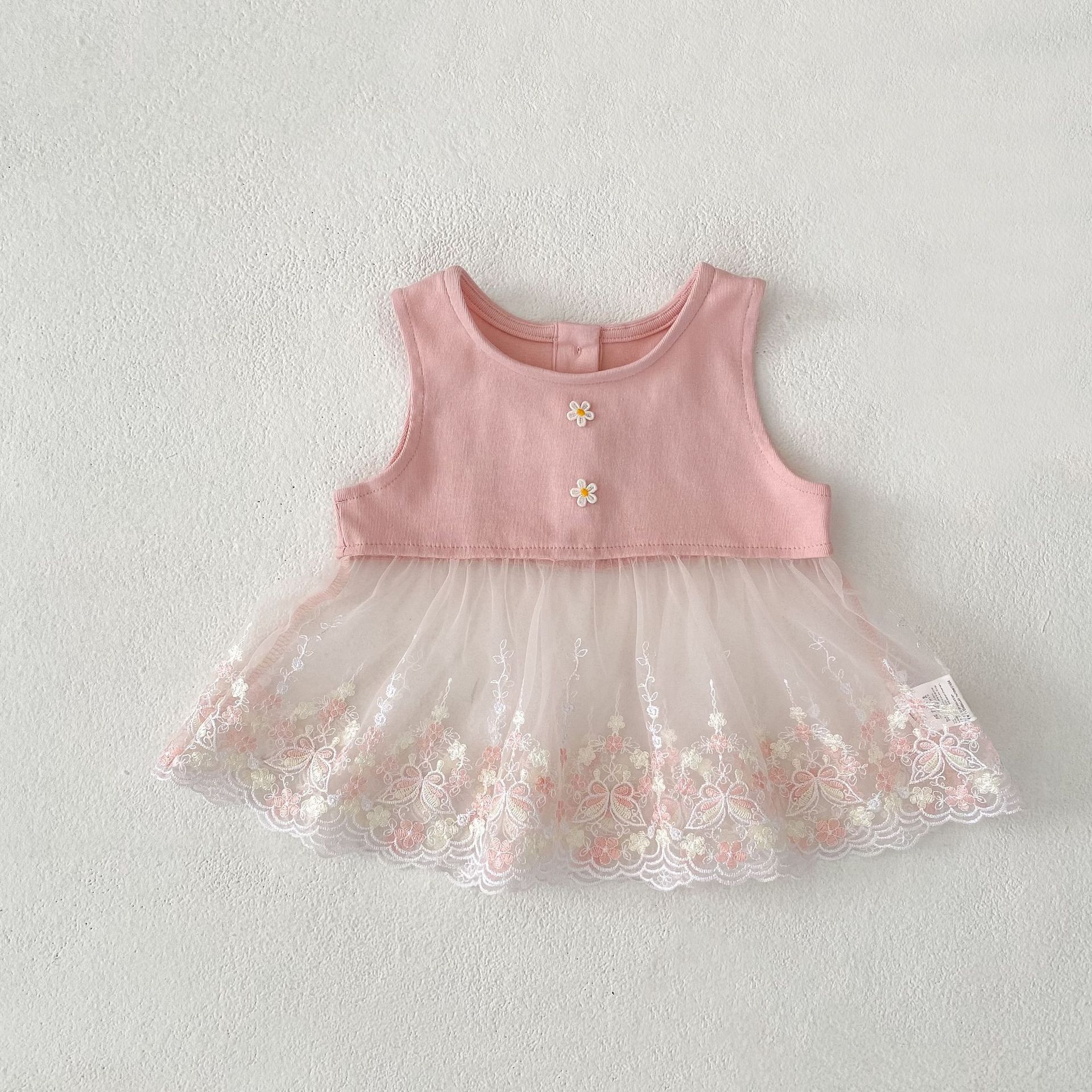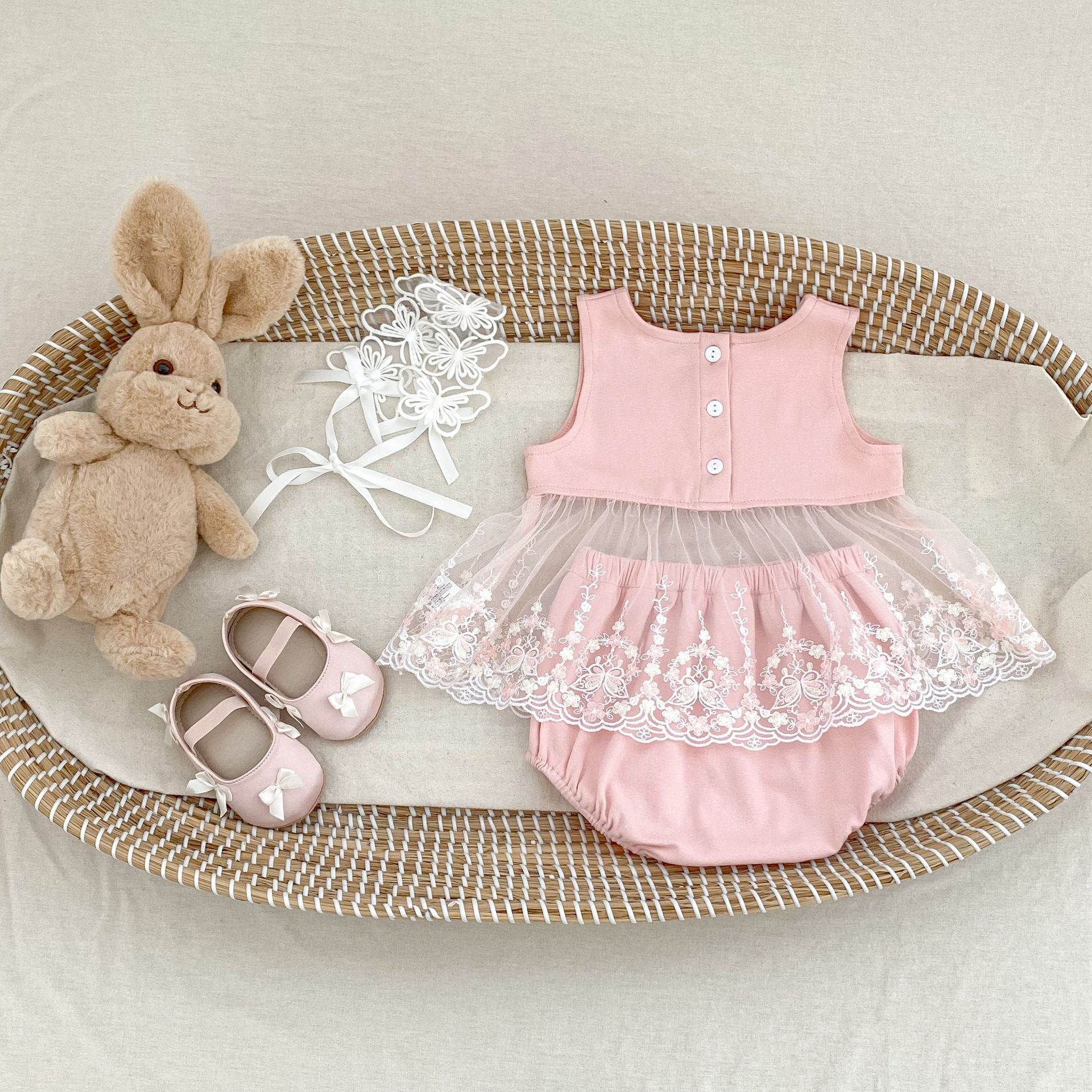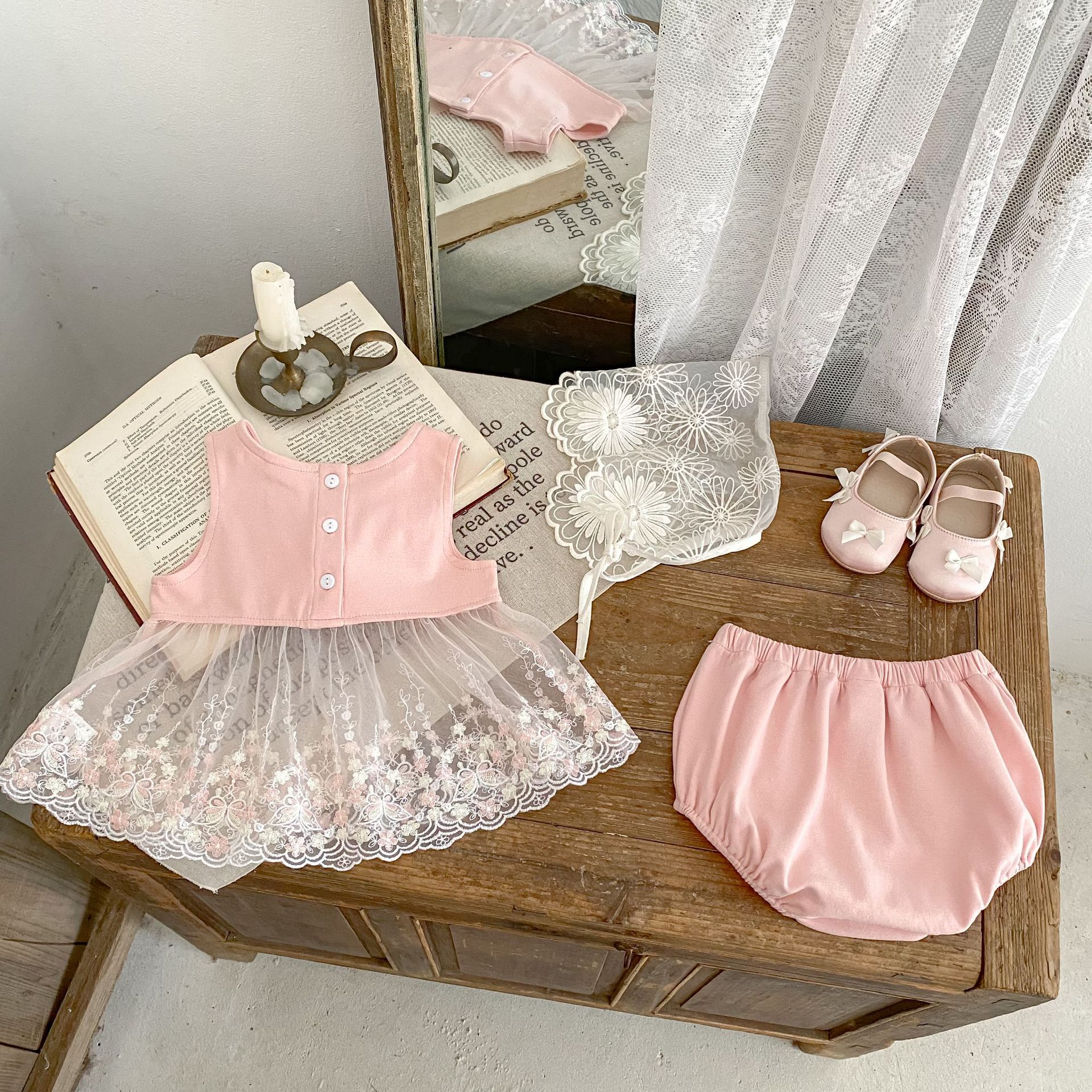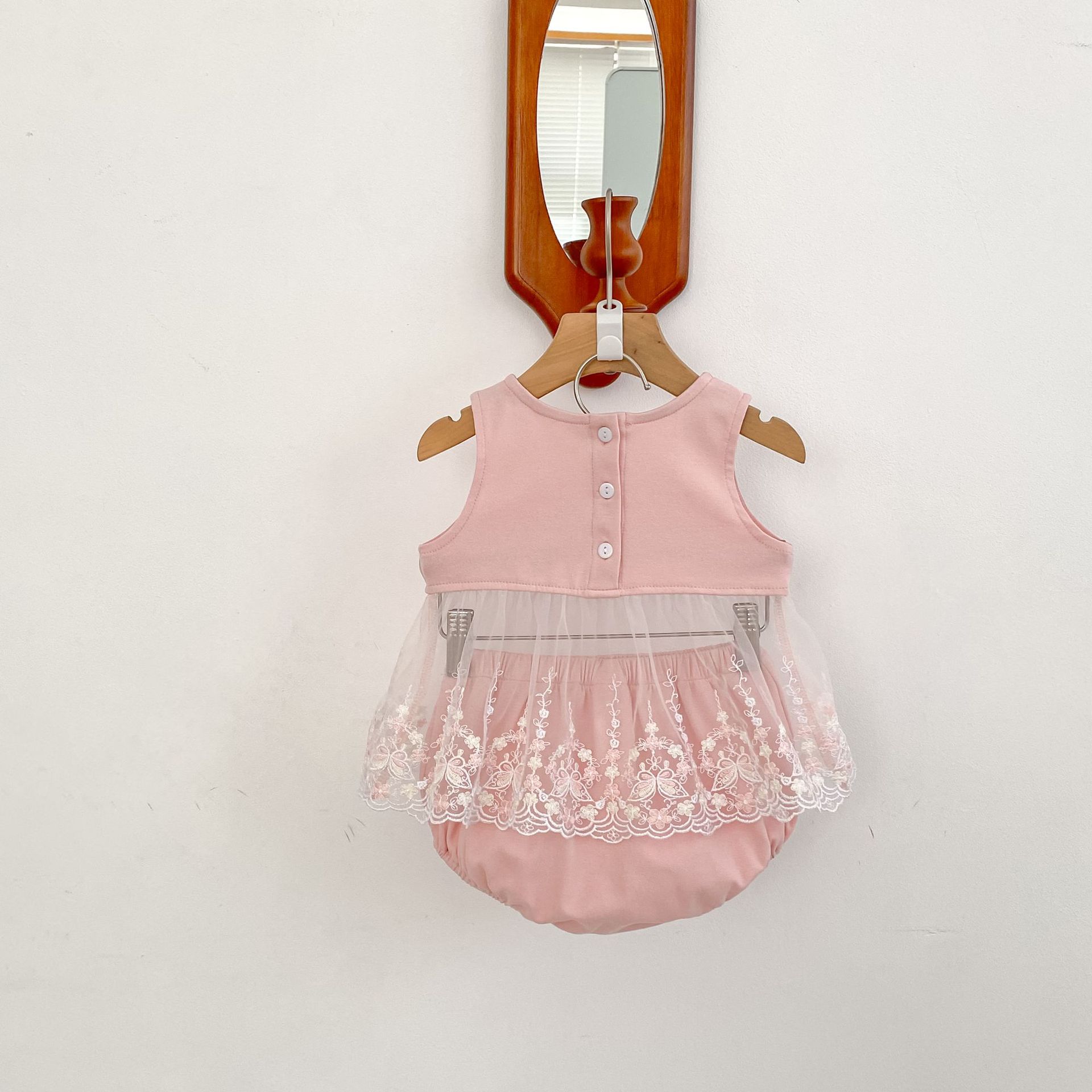 柔らかなチュールとレースがドッキングされた、夏のベビー向けノースリーブブラウスとブルマパンツのセットアップです。生後100日のベビーにもぴったりな、スイートな2点セット。