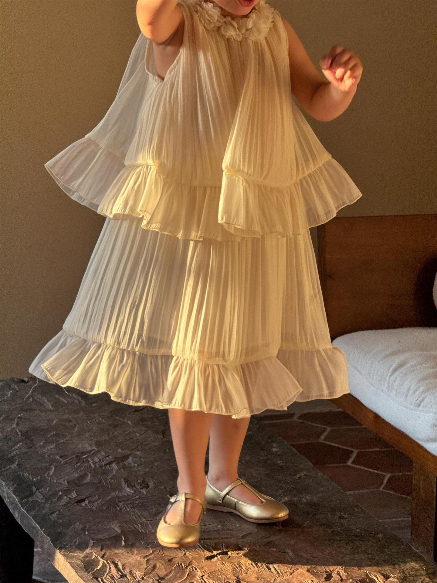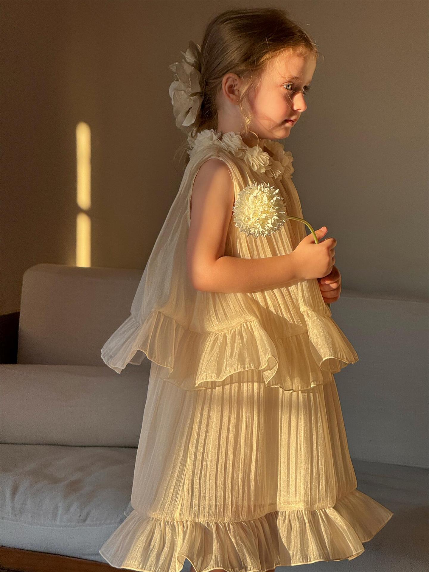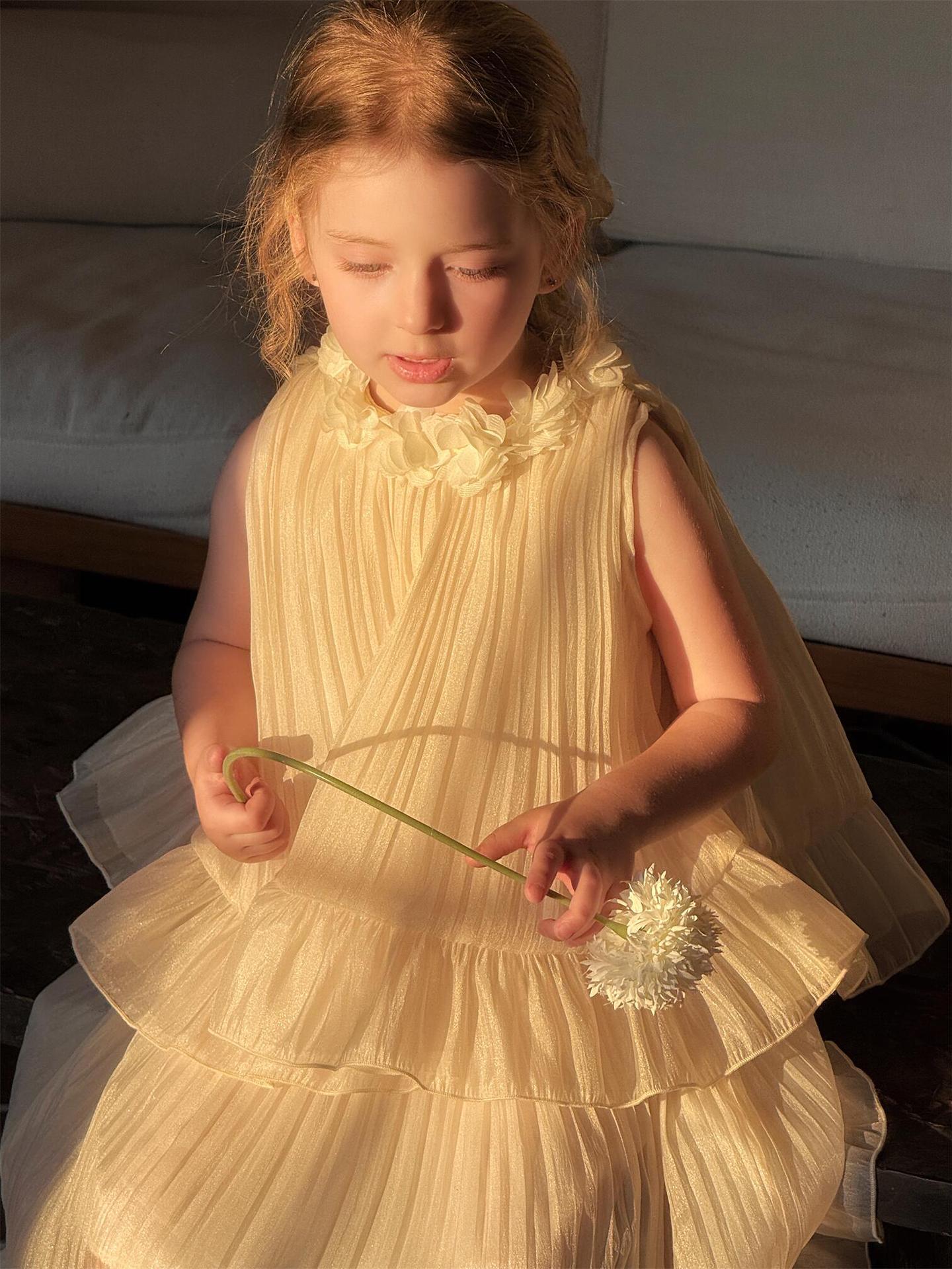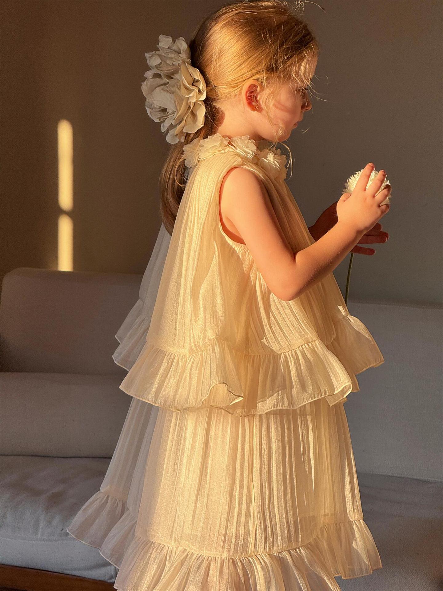 光沢感のあるクラッシュメッシュ素材が特徴で、光の当たり具合で表情を変え、幻想的な雰囲気を演出します。何層にも重なったガーゼスカートがふんわりと広がり、動くたびに軽やかに揺れて、まるでおとぎ話の世界から飛び出してきたお姫様のよう。お誕生日や記念日の写真撮影、結婚式や発表会などの特別な日にも大活躍する、とびきりキュートな一枚です。