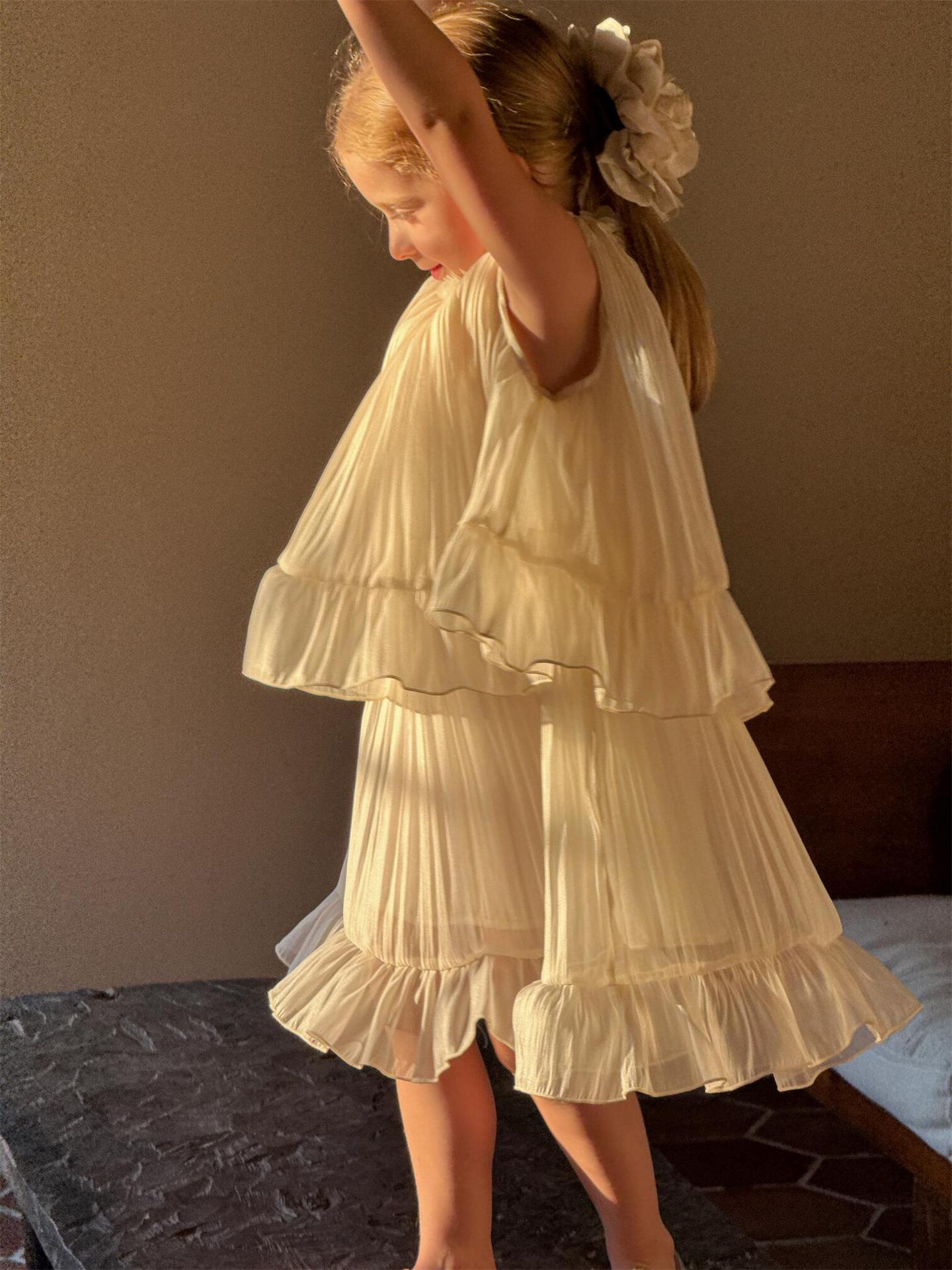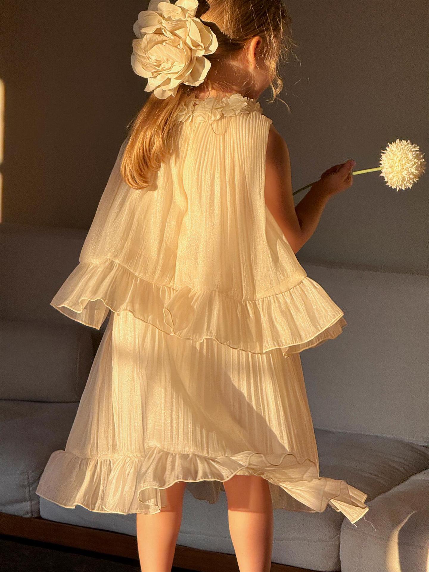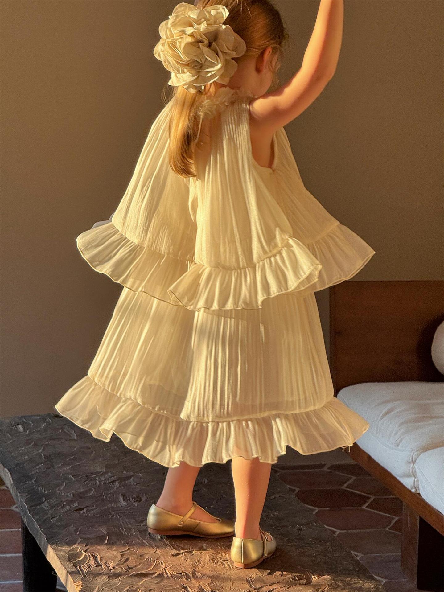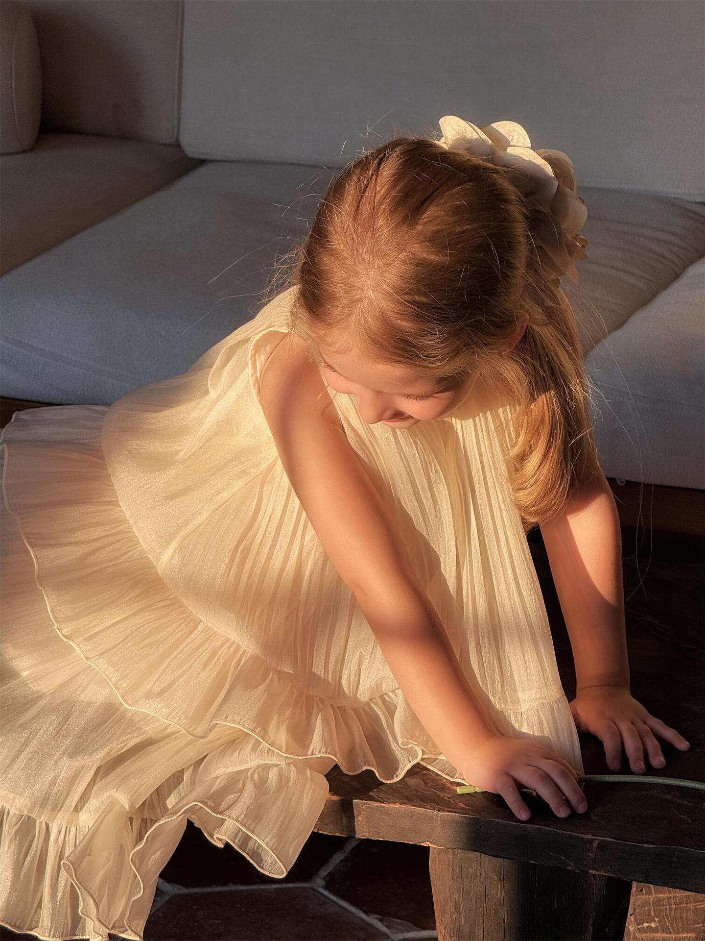 光沢感のあるクラッシュメッシュ素材が特徴で、光の当たり具合で表情を変え、幻想的な雰囲気を演出します。何層にも重なったガーゼスカートがふんわりと広がり、動くたびに軽やかに揺れて、まるでおとぎ話の世界から飛び出してきたお姫様のよう。お誕生日や記念日の写真撮影、結婚式や発表会などの特別な日にも大活躍する、とびきりキュートな一枚です。