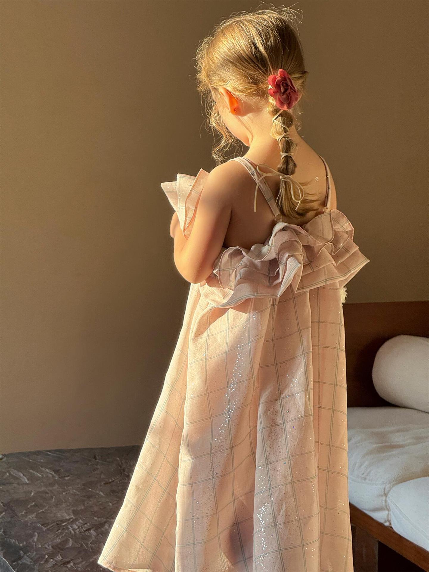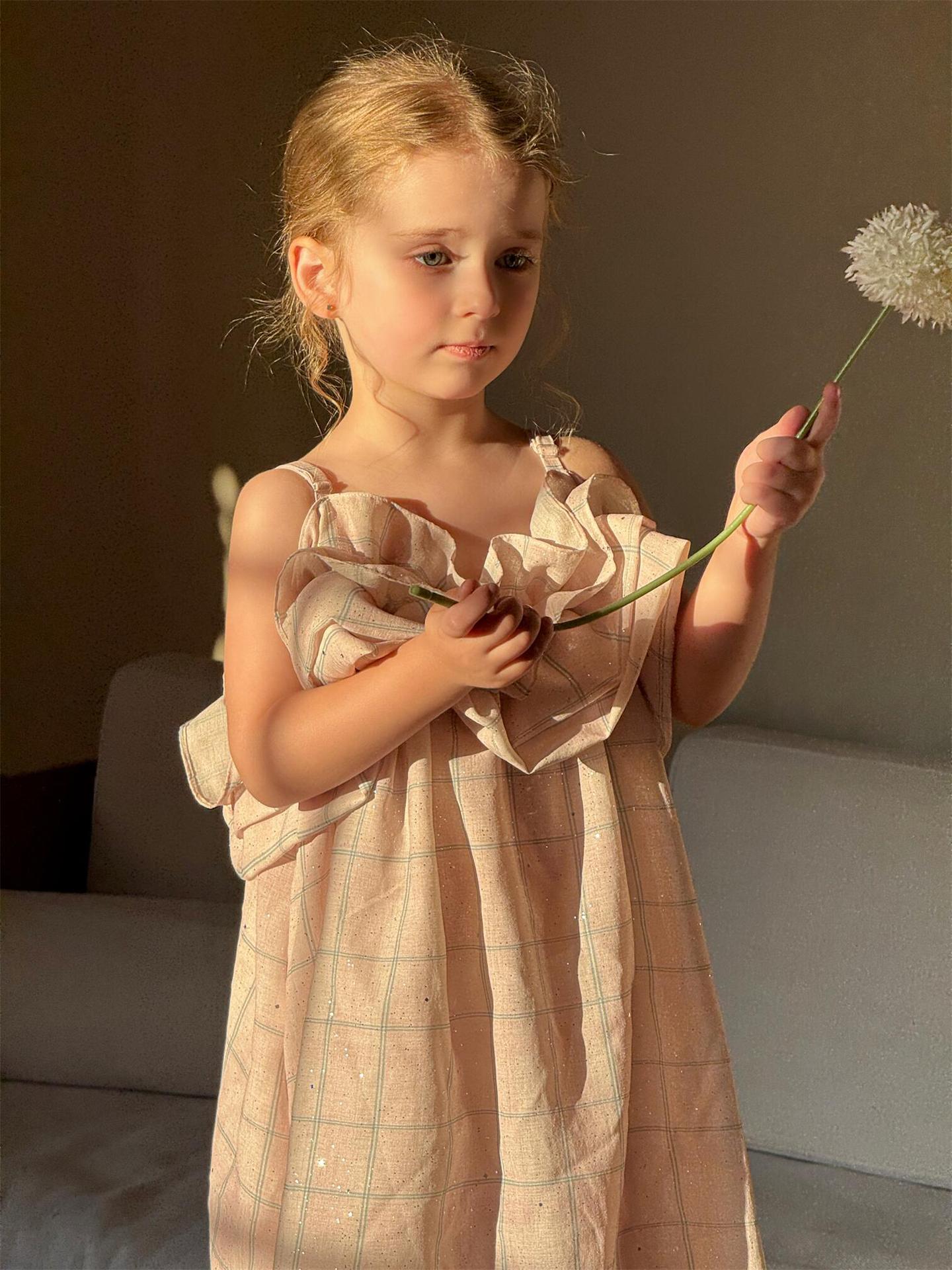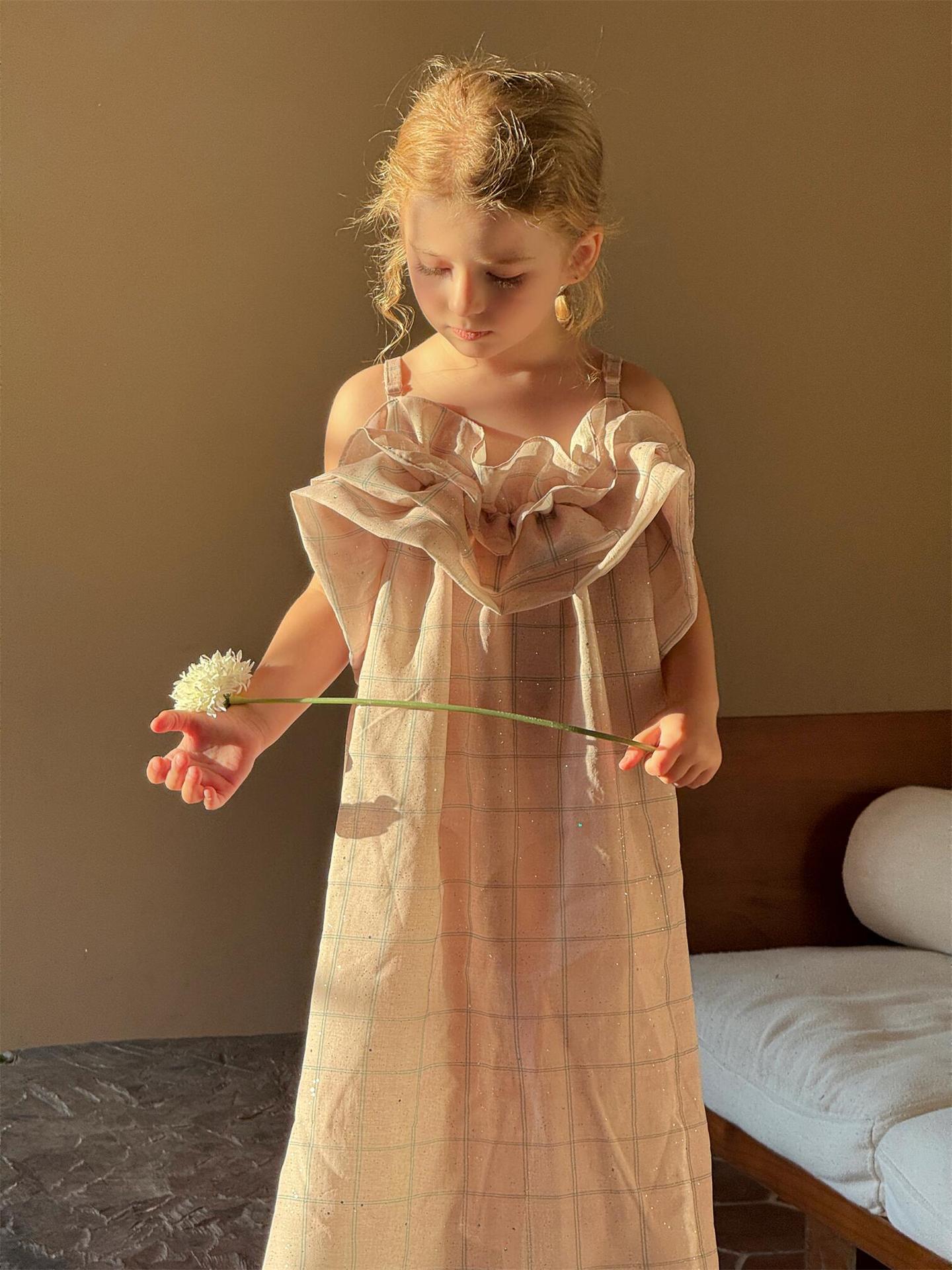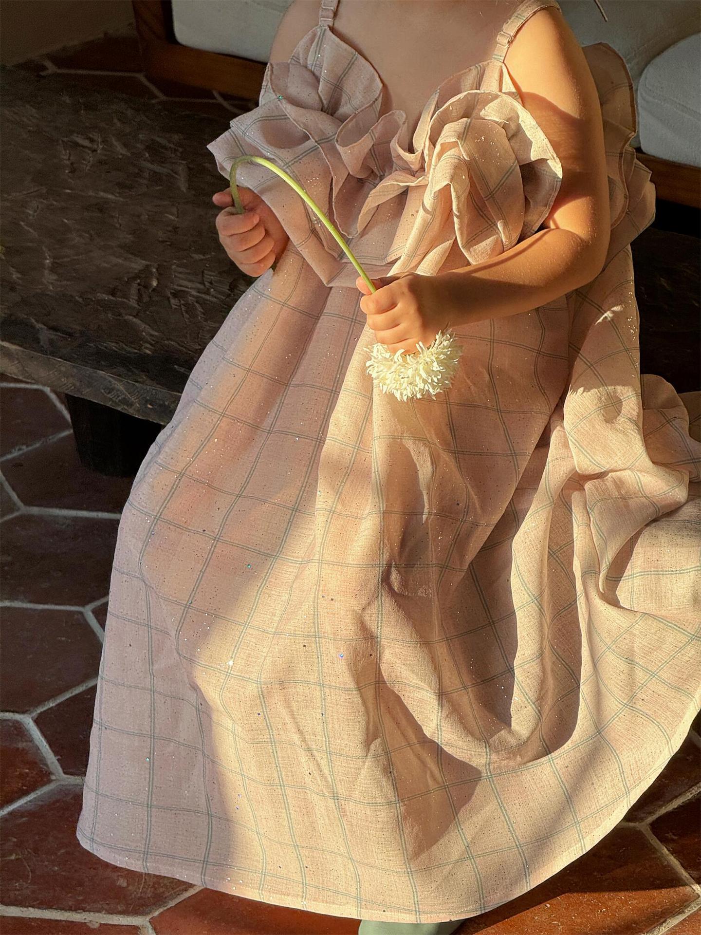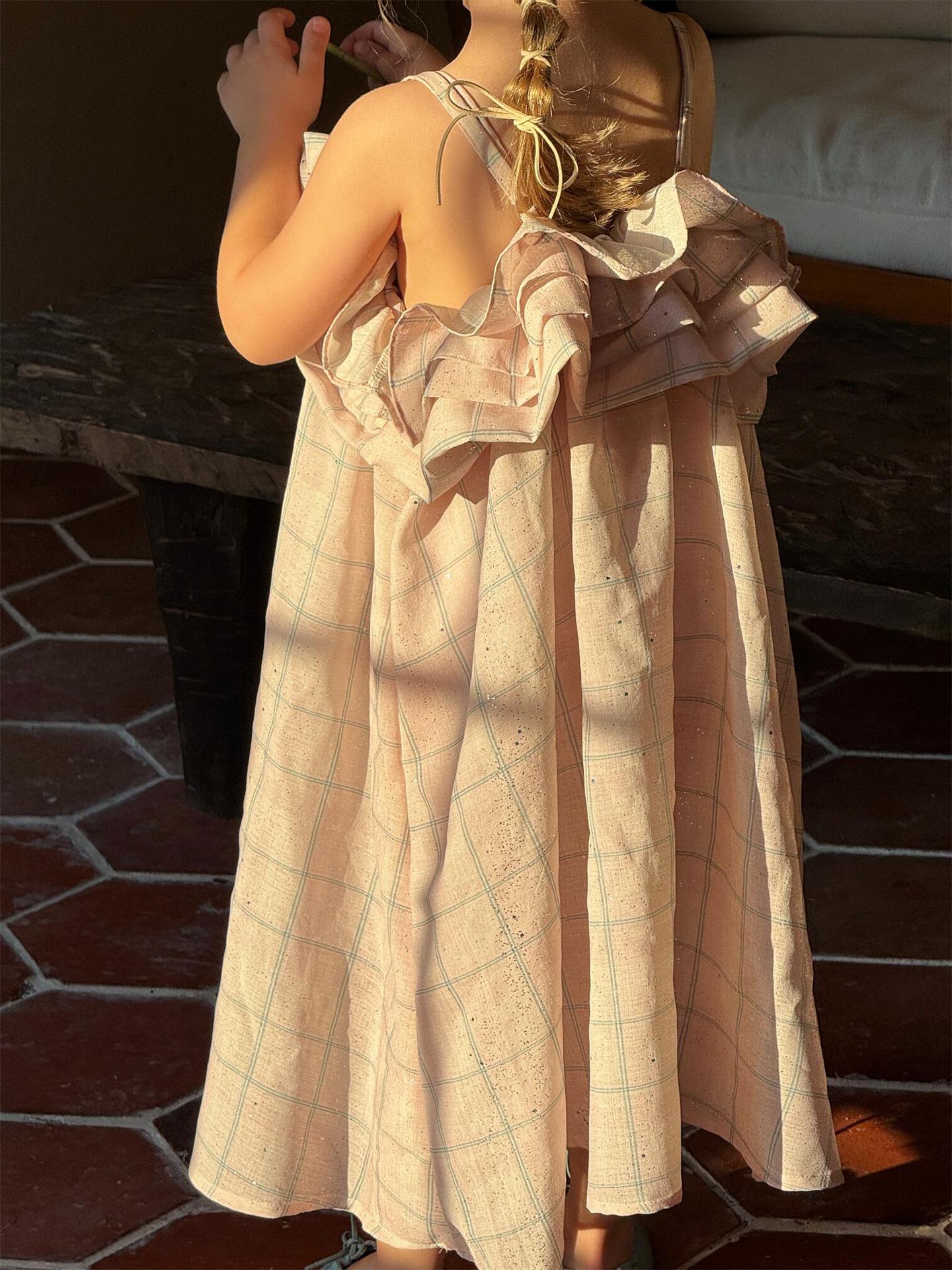 涼しげなキャミソールデザインで、暑い夏でもお子さんが快適に過ごせます。全体にあしらわれたチェック柄がレトロな可愛らしさを演出し、裾に向かってふんわりと広がるバッド(つぼみ)のようなシルエットが特徴です。肩や胸元にあしらわれたフリルが、女の子らしさを一層引き立てます。普段使いはもちろん、ちょっとしたお出かけにも大活躍する、とびきりキュートな一枚です。