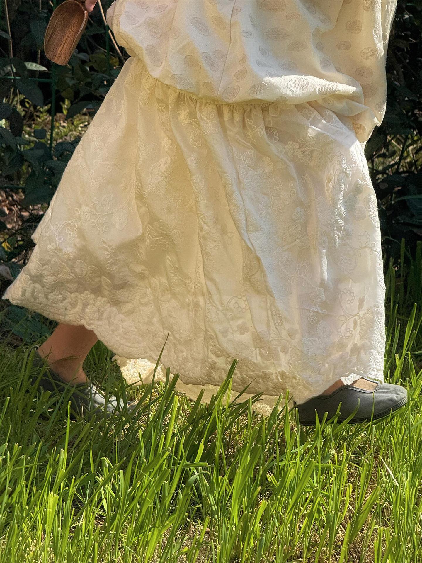 繊細な刺繍レースが可愛らしい、刺繍レースガーリースカートです。夏の女の子にぴったりの、甘く涼しげな一枚。
