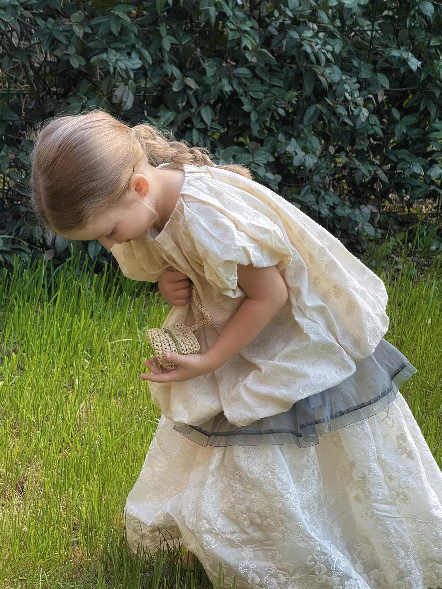 しっとりとした肌触りのテンセル素材を使用しているので、通気性も良く、暑い夏でもお子さんが快適に過ごせます。裾にあしらわれた繊細な刺繍レースと、可愛らしいかぎ針編みのデザインが、シンプルながらも上品な雰囲気を演出します。ふんわりとしたシルエットが女の子らしさを一層引き立て、普段使いはもちろん、ちょっとしたお出かけにも大活躍するでしょう。
