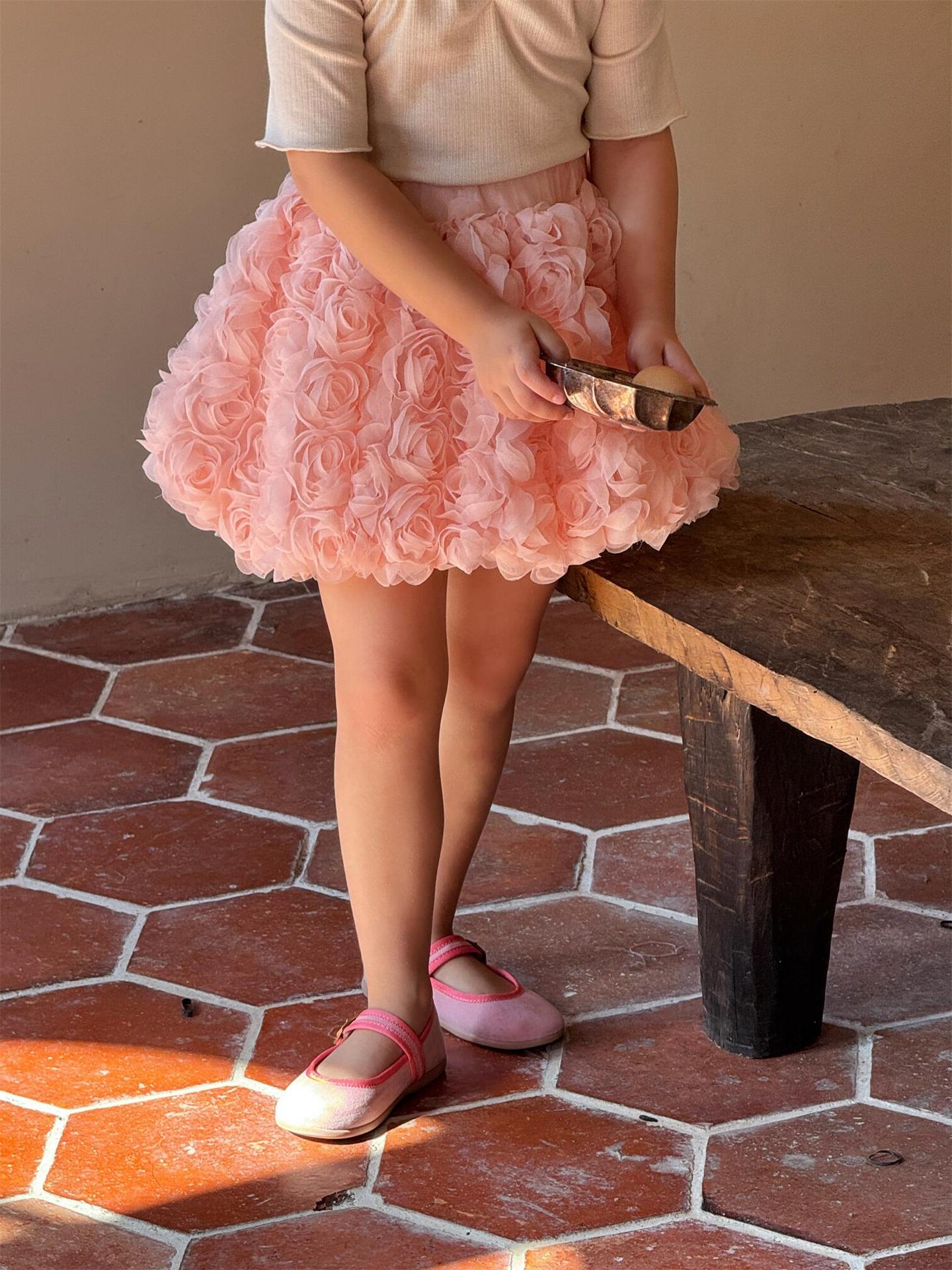 ふんわりとしたガーゼ素材で軽やか。立体的なバラのモチーフがスカート全体に散りばめられており、動くたびに優雅に揺れて、まるでお花畑のよう。短めの丈が可愛らしさを引き立て、元気な女の子にぴったりです。お誕生日や記念日の写真撮影、結婚式や発表会などの特別な日にも大活躍する、とびきりキュートな一枚です。