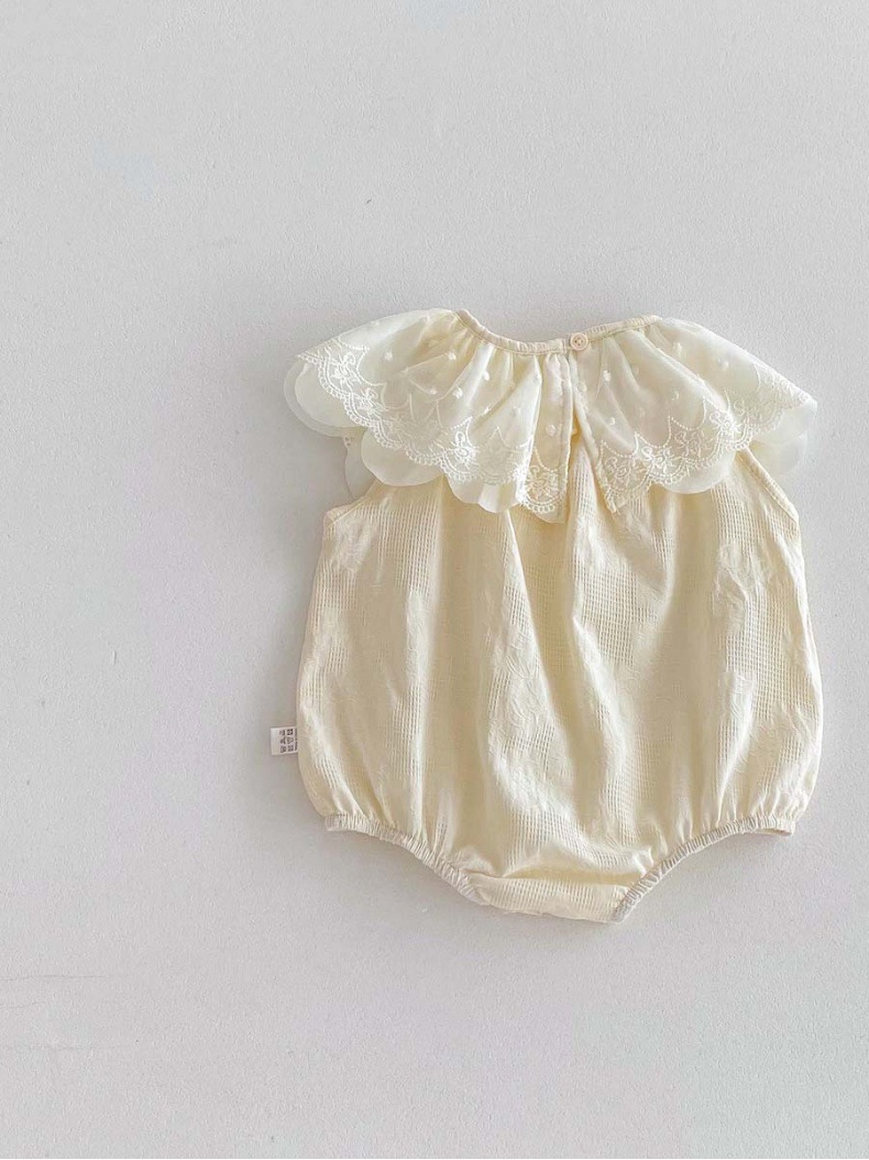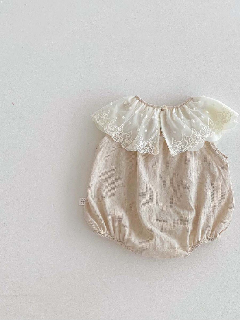 まるで宮殿のお姫様のような、レースビッグラッフル襟ノースリーブロンパースです。夏のベビーガールにぴったりの、優雅で愛らしい一枚。