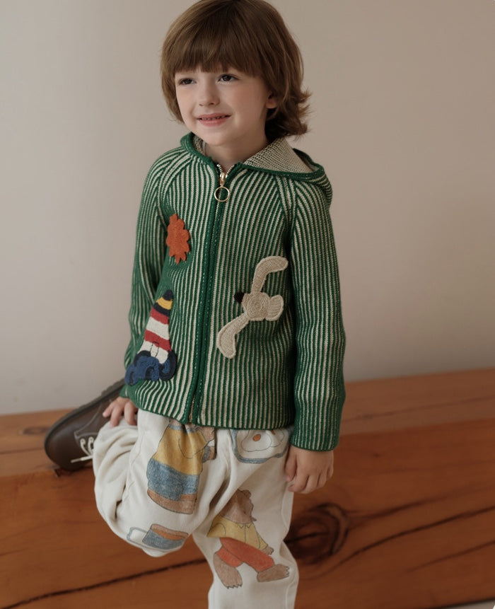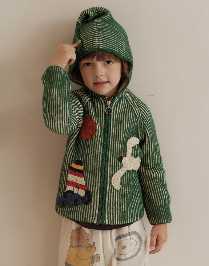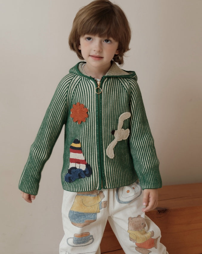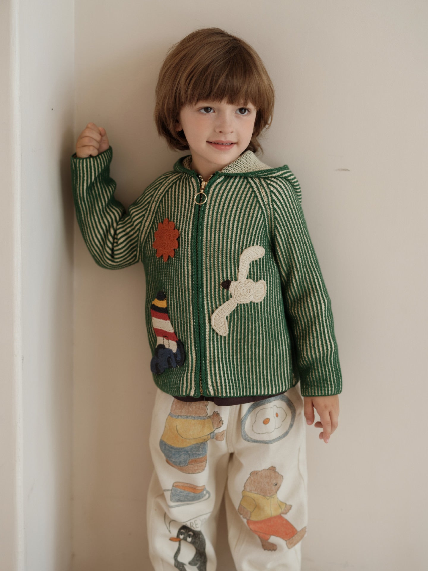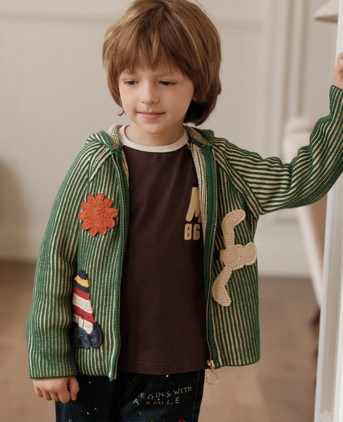 海外デザインを取り入れたニットカーディガンは、立体的なアップリケとフードが特徴の子ども服です。ゆったりとしたシルエットが、動き回るキッズの活動を快適にサポートします。このニットウェアは、男の子にも女の子にもフィットするユニセックスなデザインで、肌寒い日のアウターコートとして活躍します。