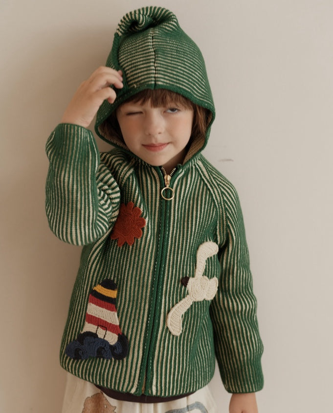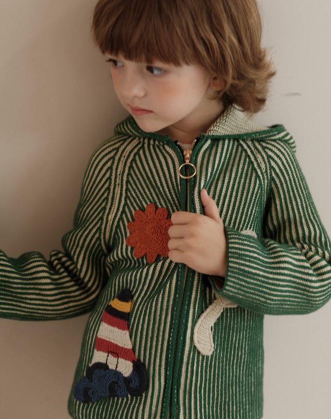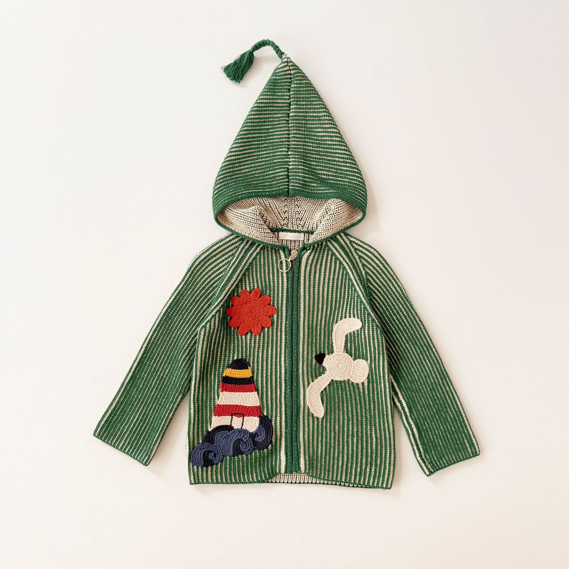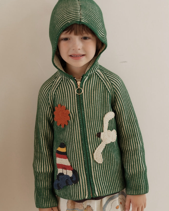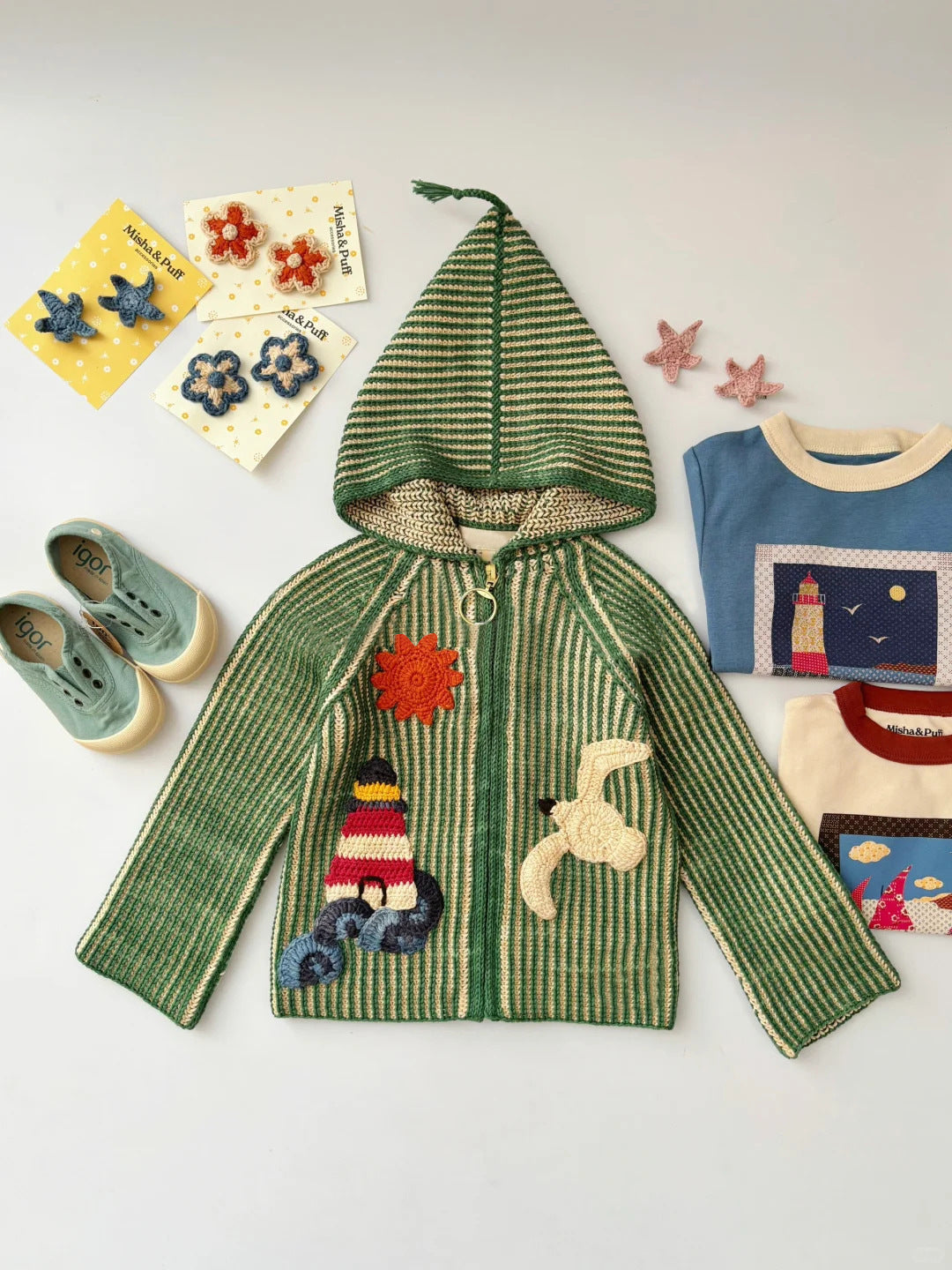 海外デザインを取り入れたニットカーディガンは、立体的なアップリケとフードが特徴の子ども服です。ゆったりとしたシルエットが、動き回るキッズの活動を快適にサポートします。このニットウェアは、男の子にも女の子にもフィットするユニセックスなデザインで、肌寒い日のアウターコートとして活躍します。