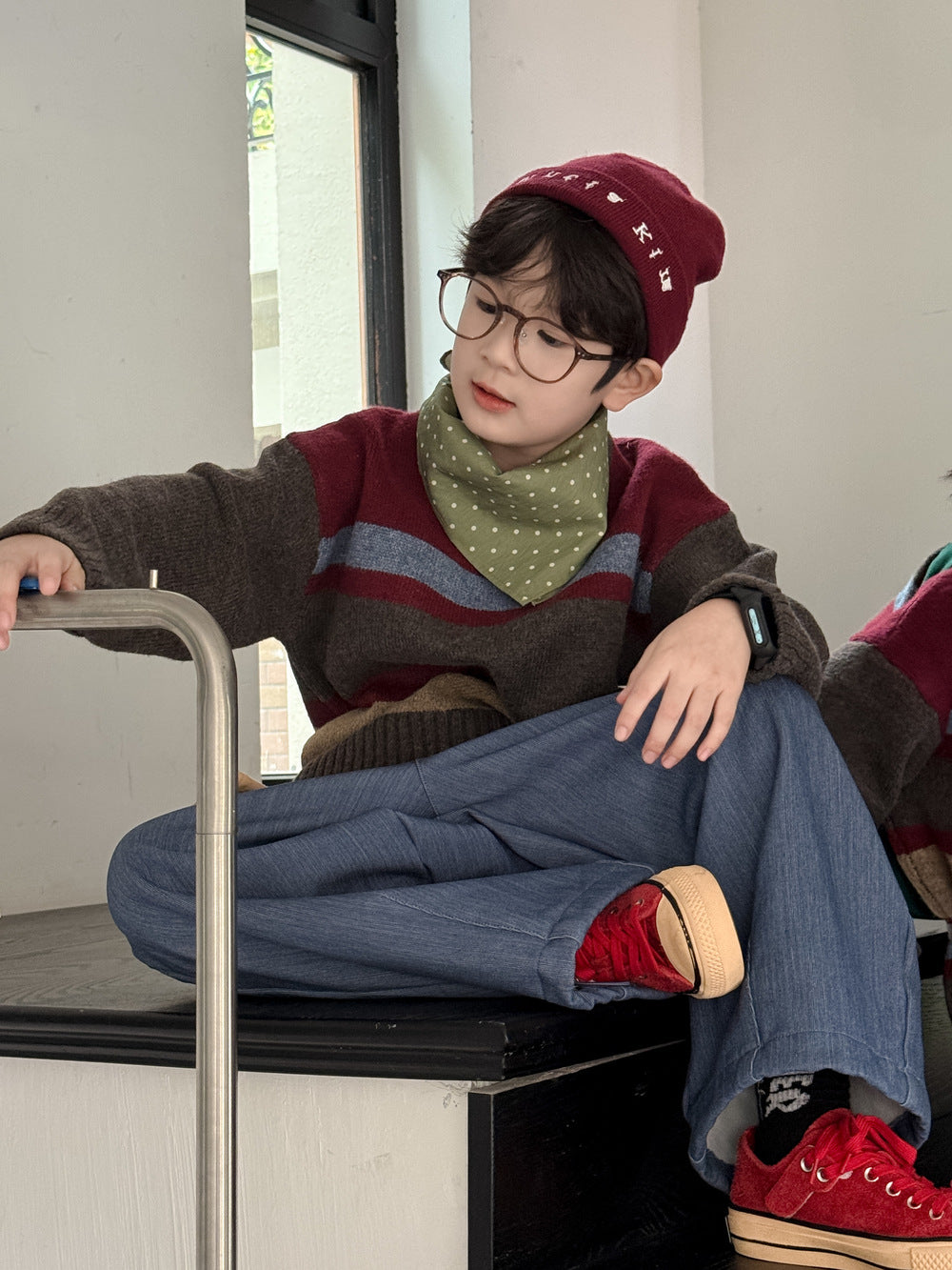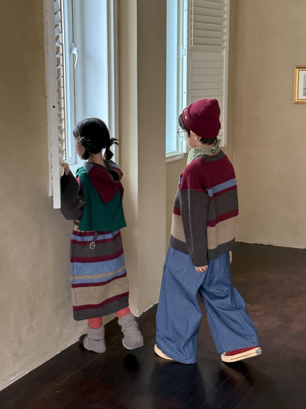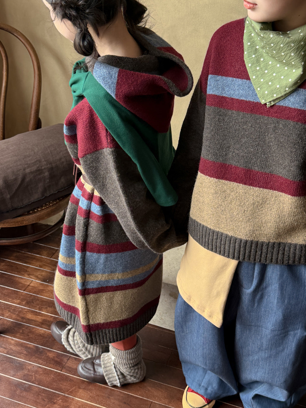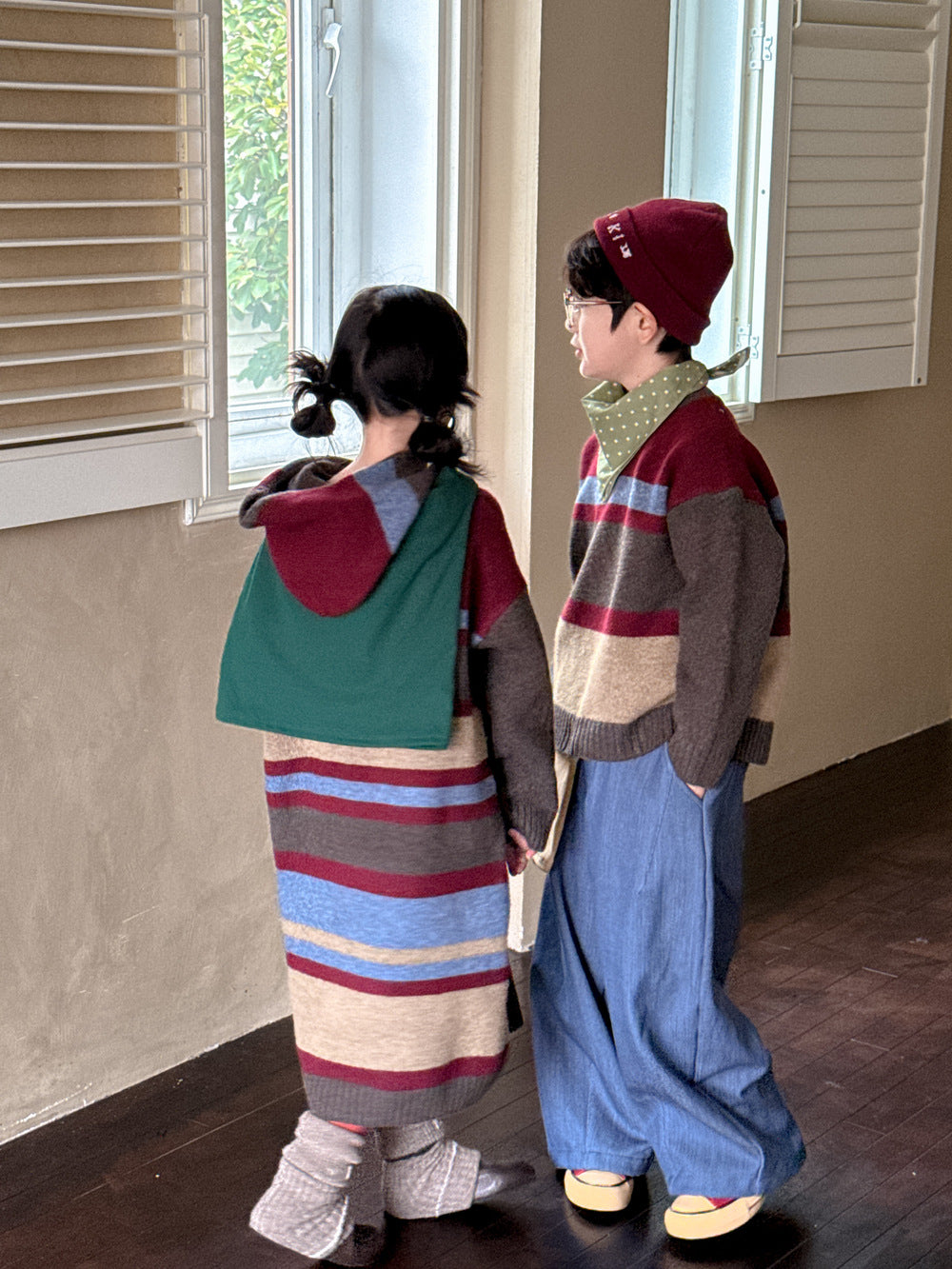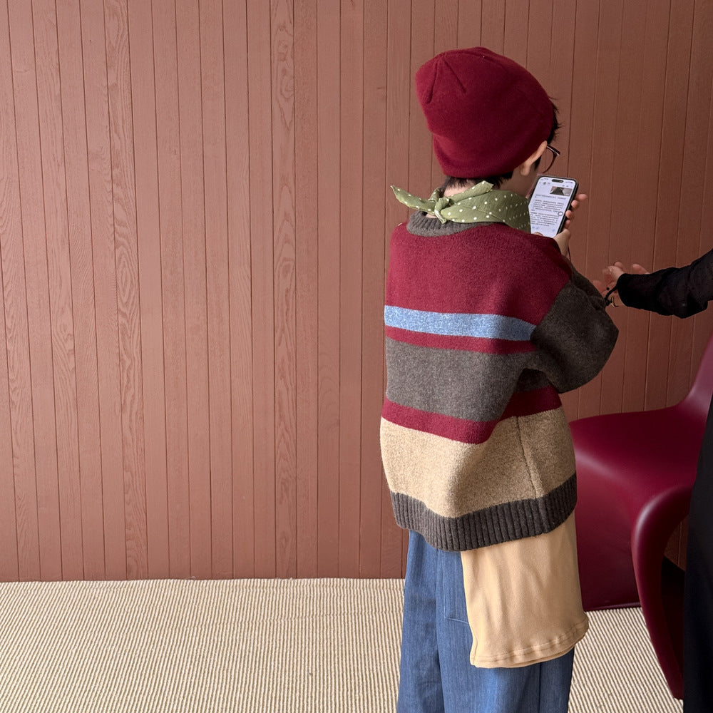 カラフルなボーダー柄が目を引く、ゆったりとしたルーズフィットのニットワンピース(またはセーター)です。厚手のしっかりとした編地で、肌寒い日にも暖かく快適な着心地。長めの丈感が可愛らしいシルエットを作り出し、一枚で主役級の子ども服として活躍します。男の子にも女の子にも着用できるユニセックスなデザインなので、兄弟姉妹でお揃いのリンクコーデが楽しめます。カジュアルながらもおしゃれな印象を与えるプルオーバータイプのドレスは、デイリーユースにぴったりのアイテムです。