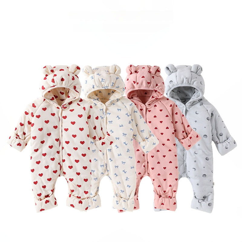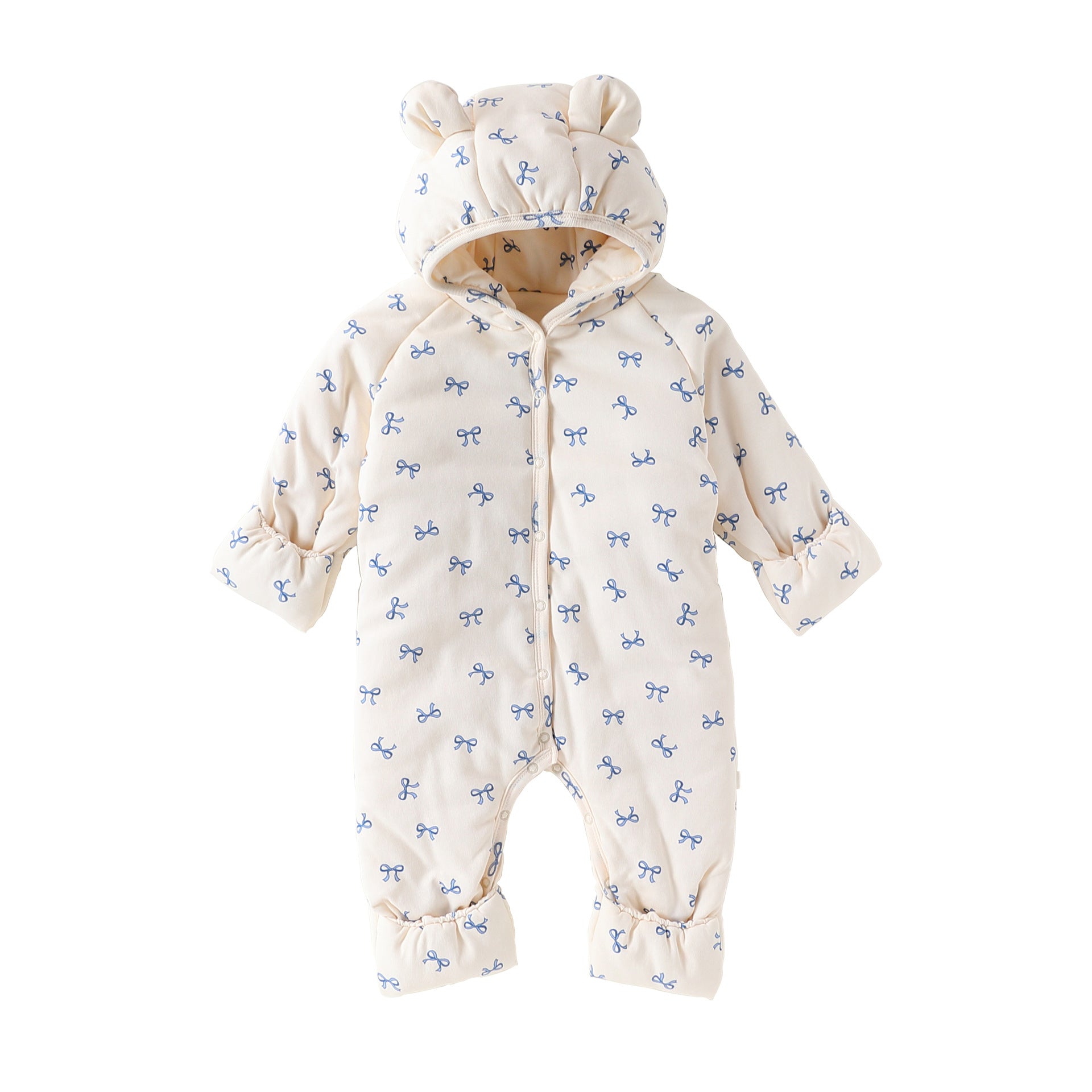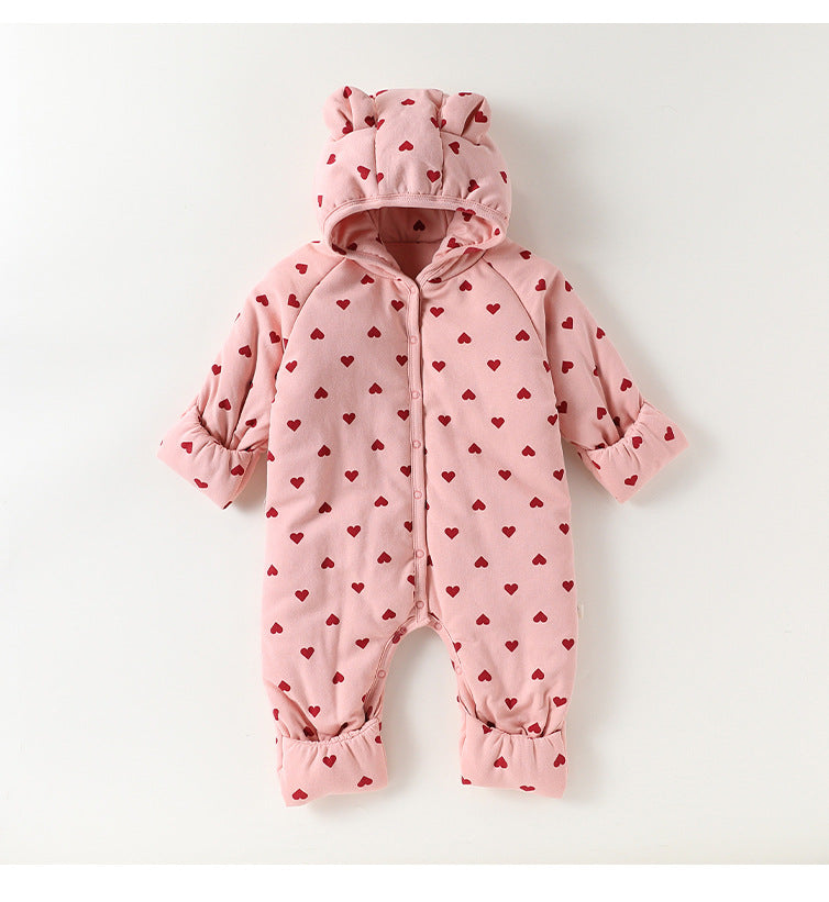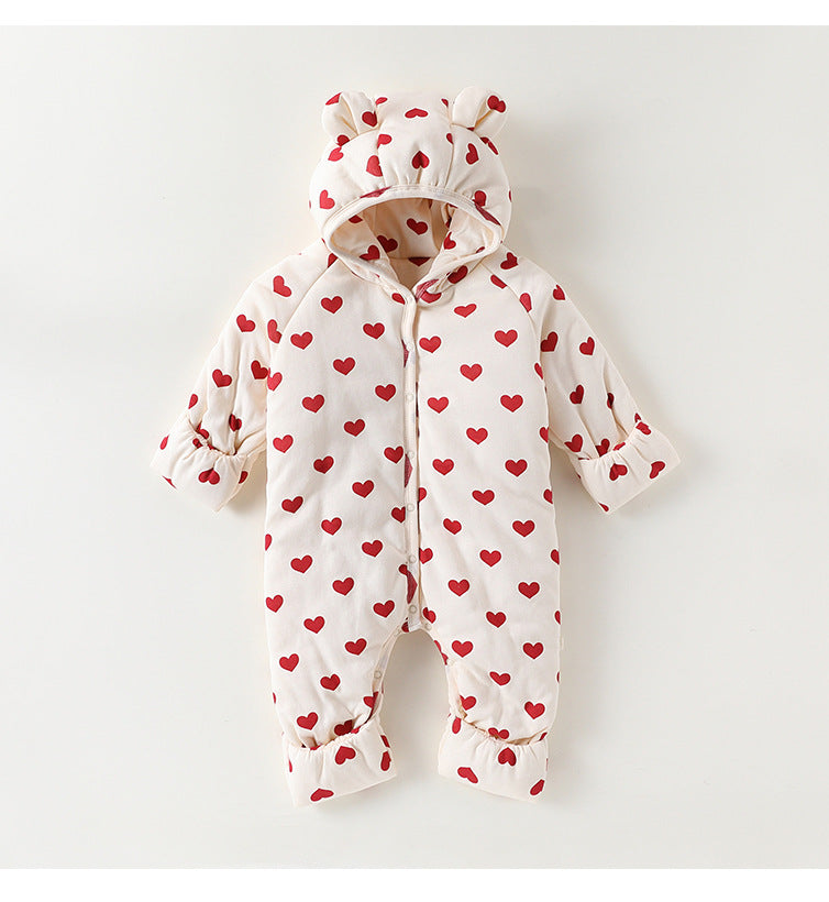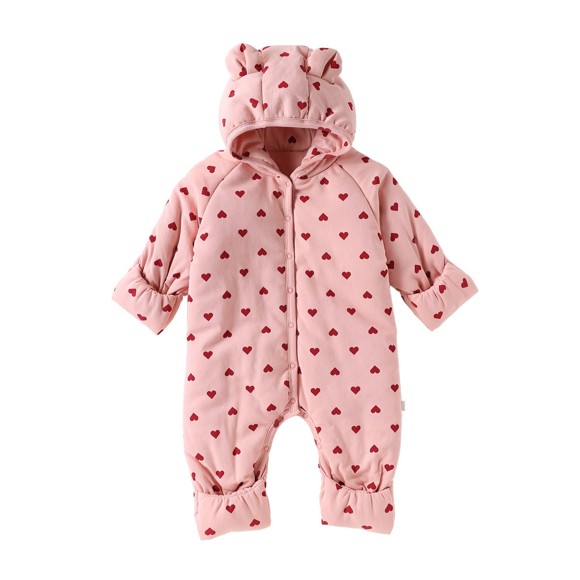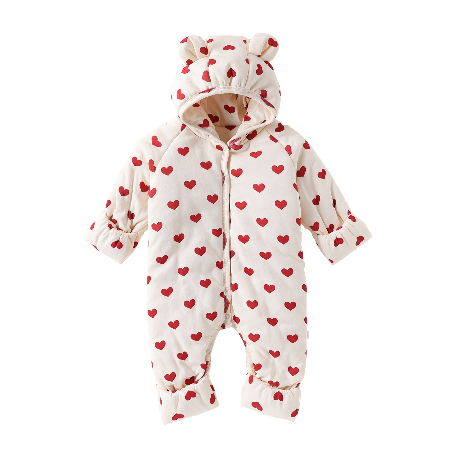 温かい中綿をたっぷりと使用し、寒い日のお出かけに最適なベビー用アウタージャンプスーツです。フードに施された愛らしい耳付きのデザインと、胸元のハートとリボンのモチーフがアクセントになっています。厚手のピュアコットン素材がベビーを優しく包み込み、ロンパース型のボディスーツは、お着替えもスムーズな機能的な子ども服です。