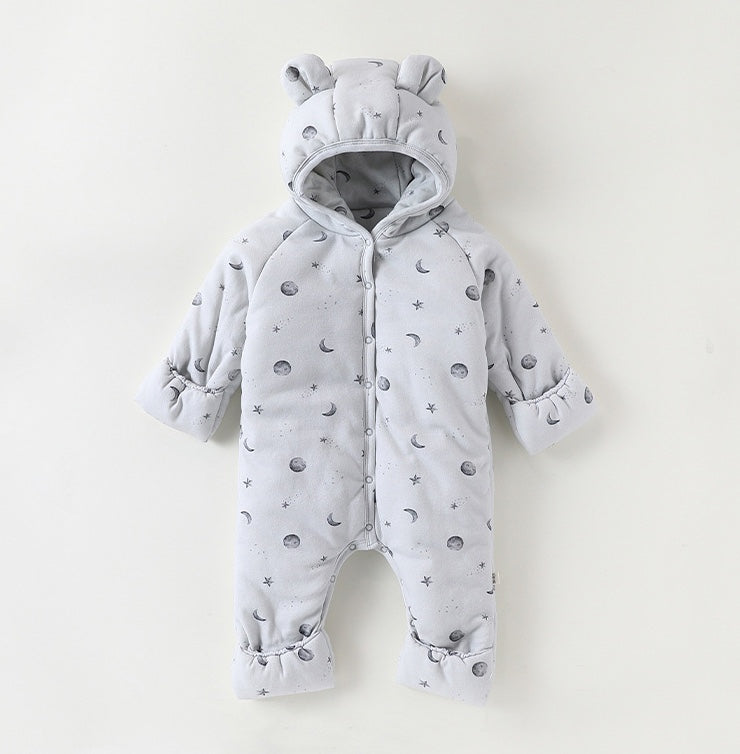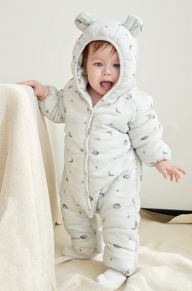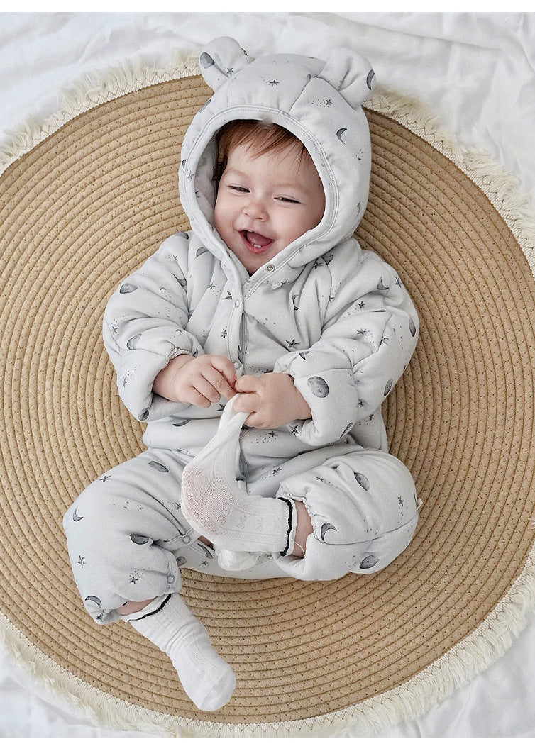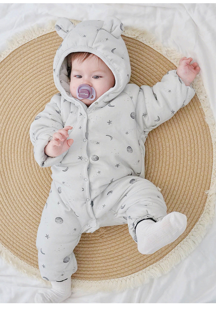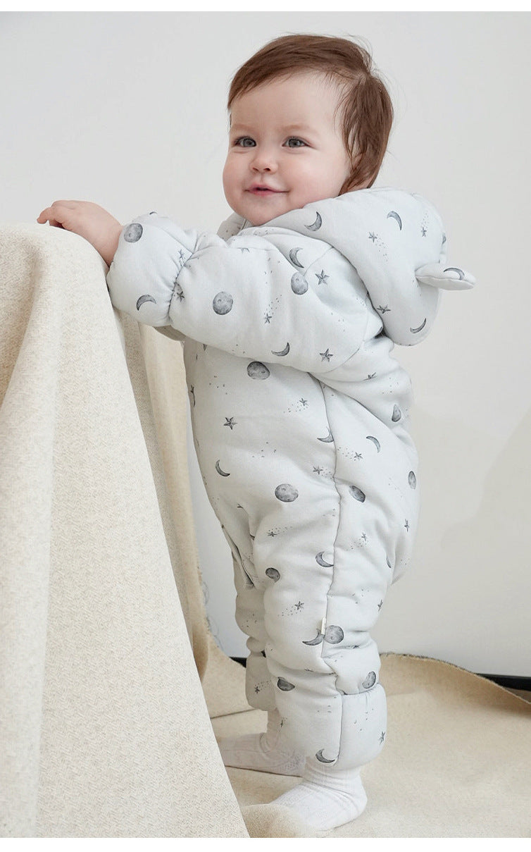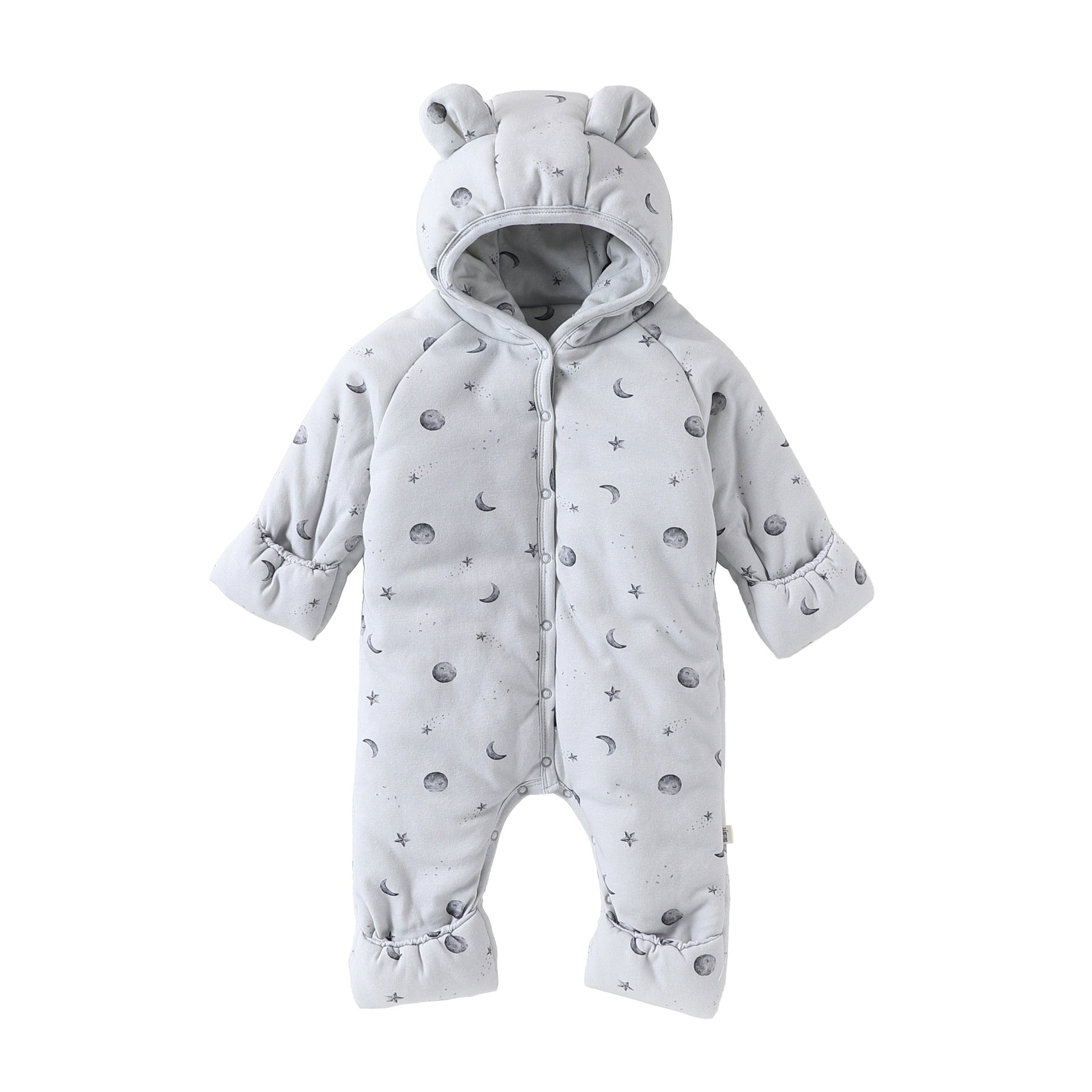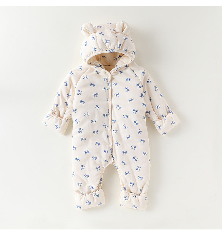 温かい中綿をたっぷりと使用し、寒い日のお出かけに最適なベビー用アウタージャンプスーツです。フードに施された愛らしい耳付きのデザインと、胸元のハートとリボンのモチーフがアクセントになっています。厚手のピュアコットン素材がベビーを優しく包み込み、ロンパース型のボディスーツは、お着替えもスムーズな機能的な子ども服です。