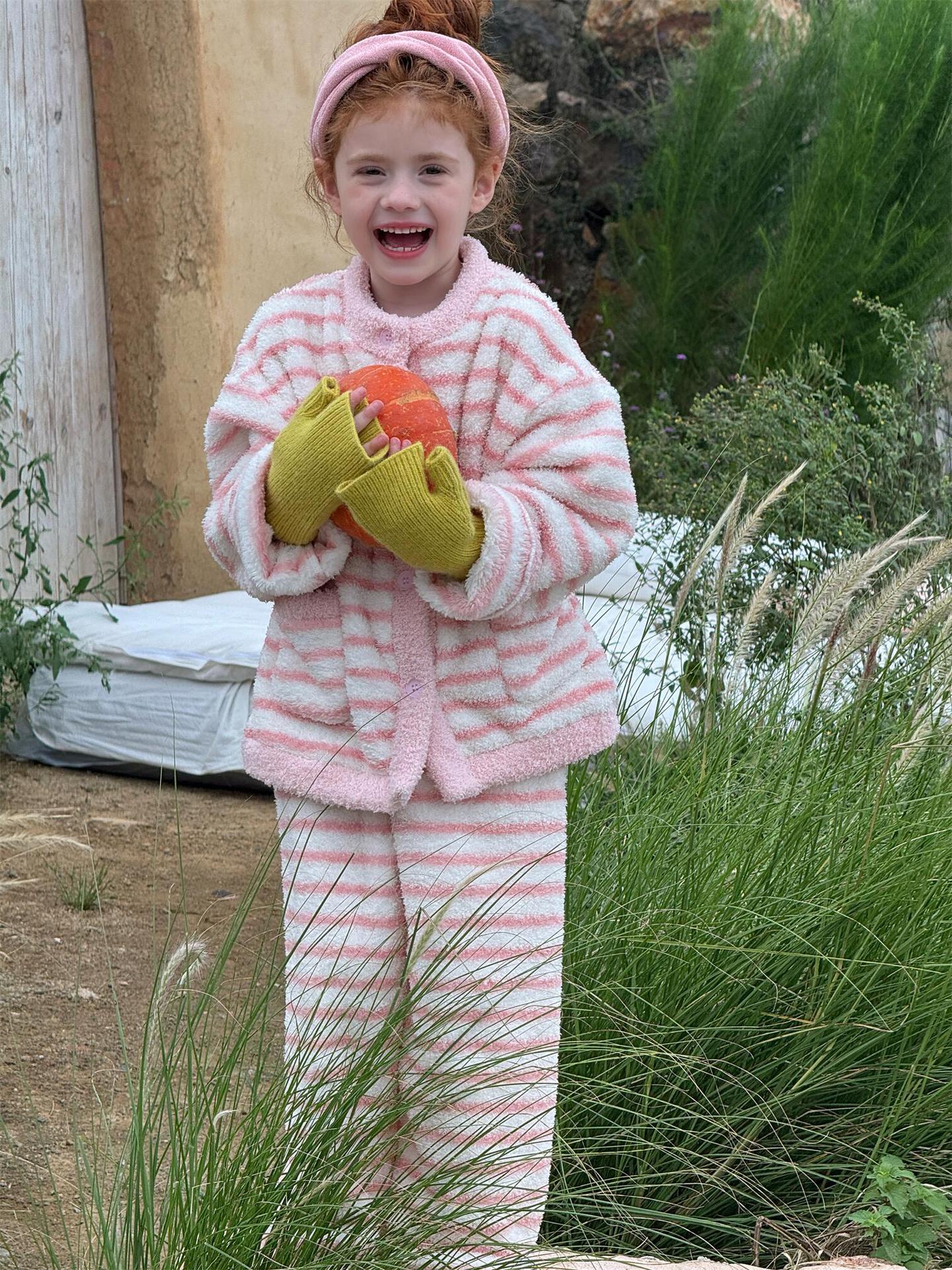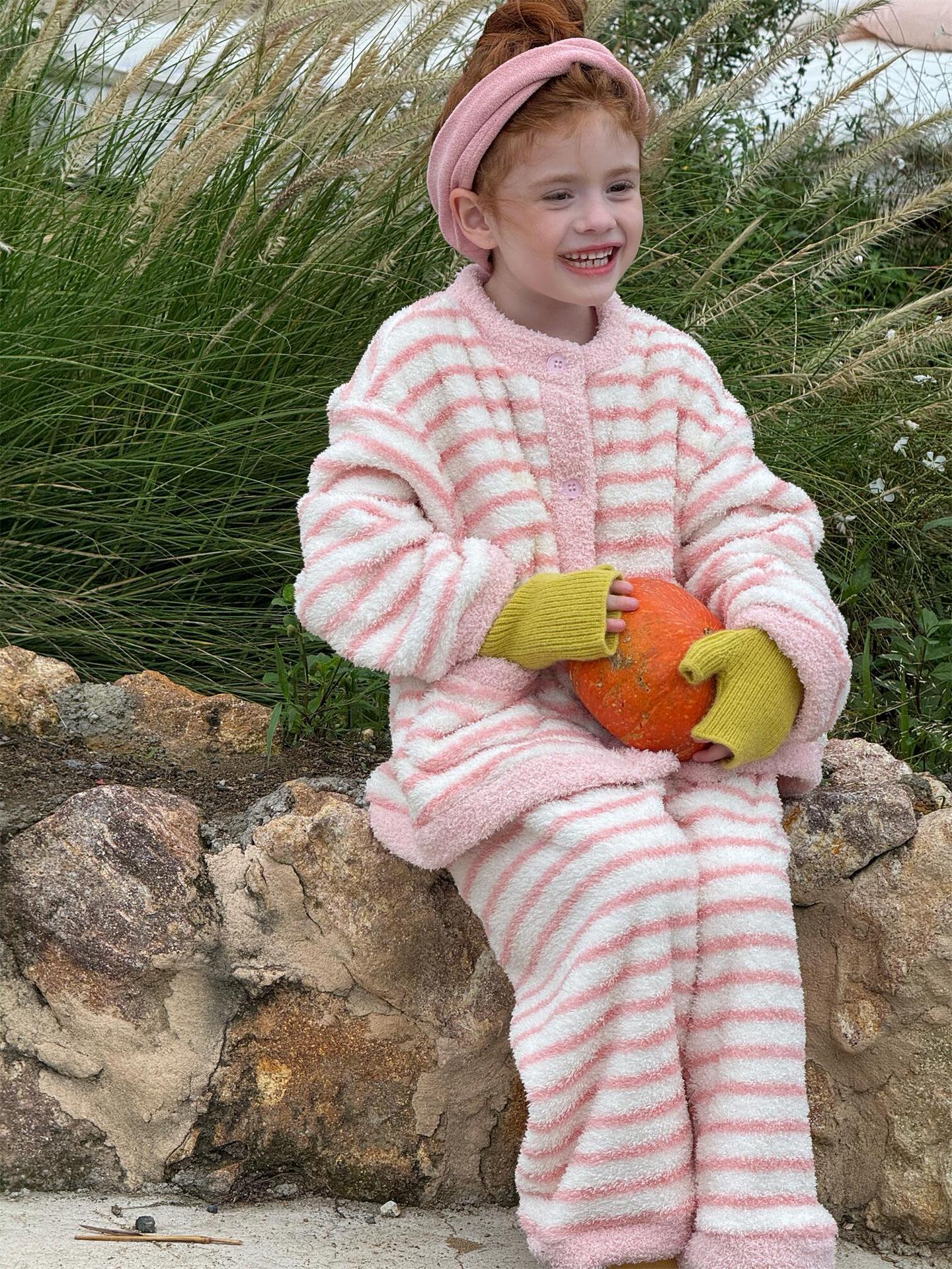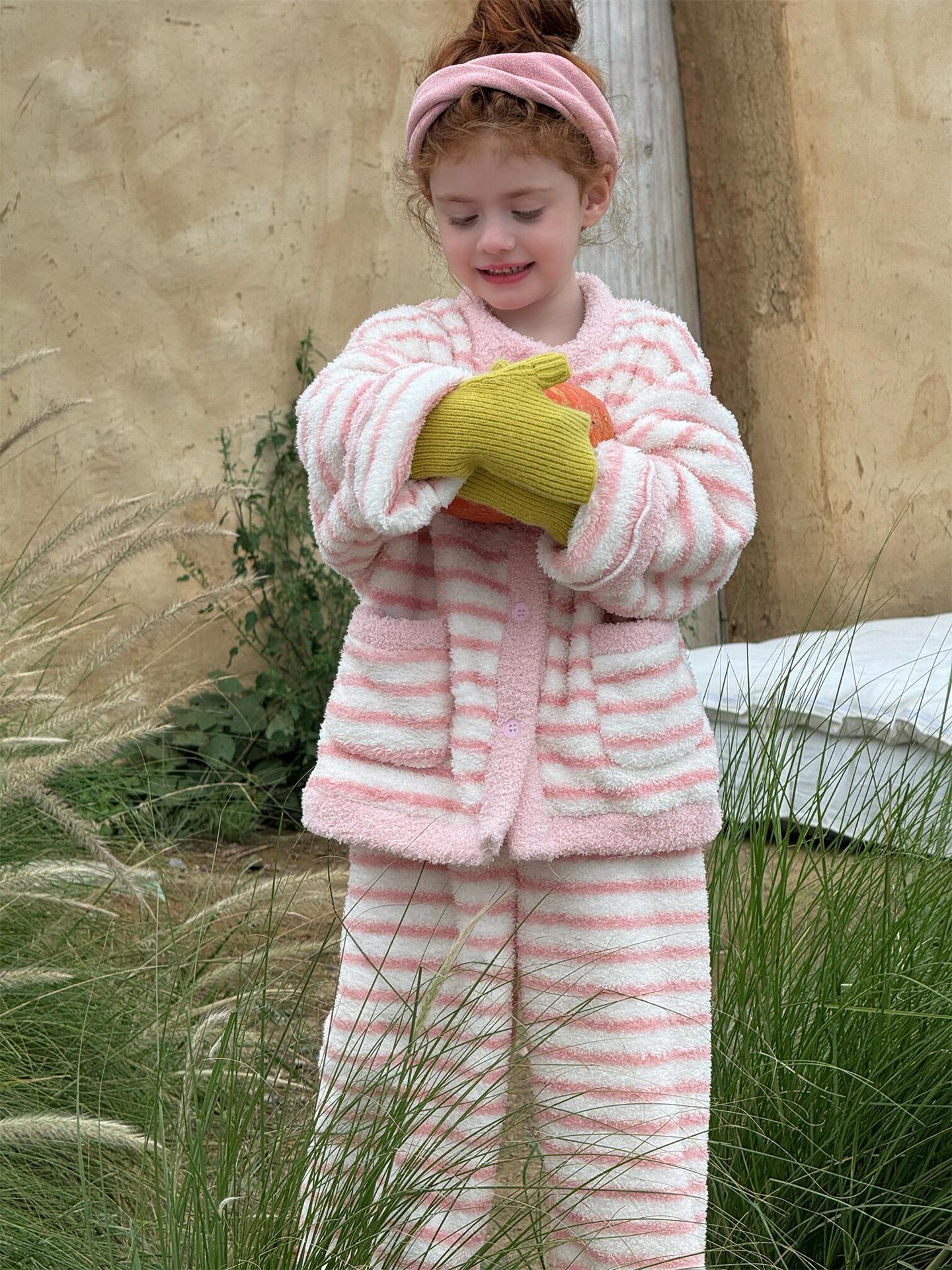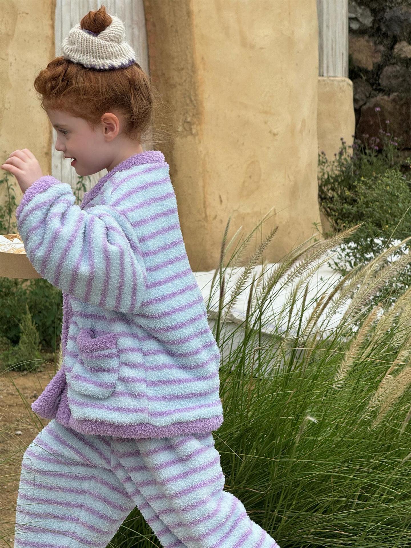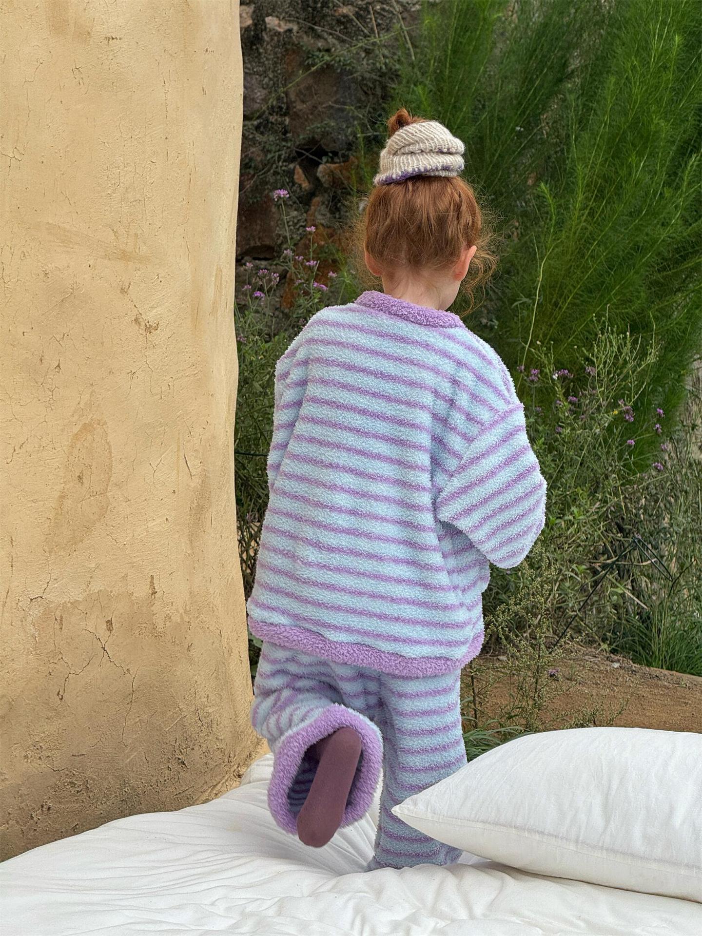 肌触り抜群のもこもこフリース素材を使用した、暖かなボーダー柄のパジャマセットアップです。トップスとロングパンツの2点セットで、リラックスタイムを快適かつおしゃれに演出します。寒い季節のホームウェアとして最適なこのルームウェアは、愛らしいデザインと柔らかな着心地で、おうち時間もスタイリッシュに過ごせる子ども服としておすすめです。