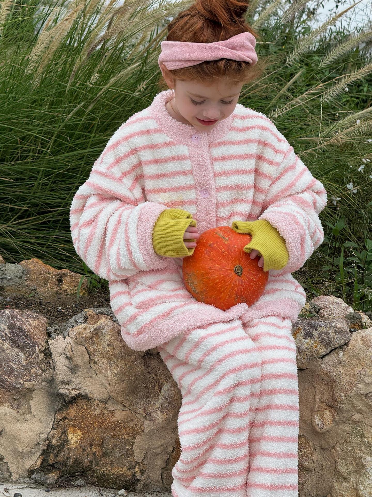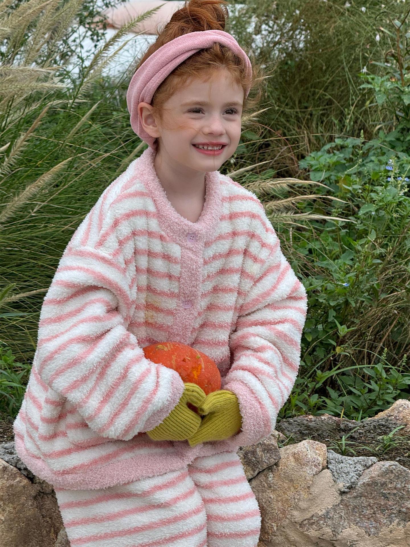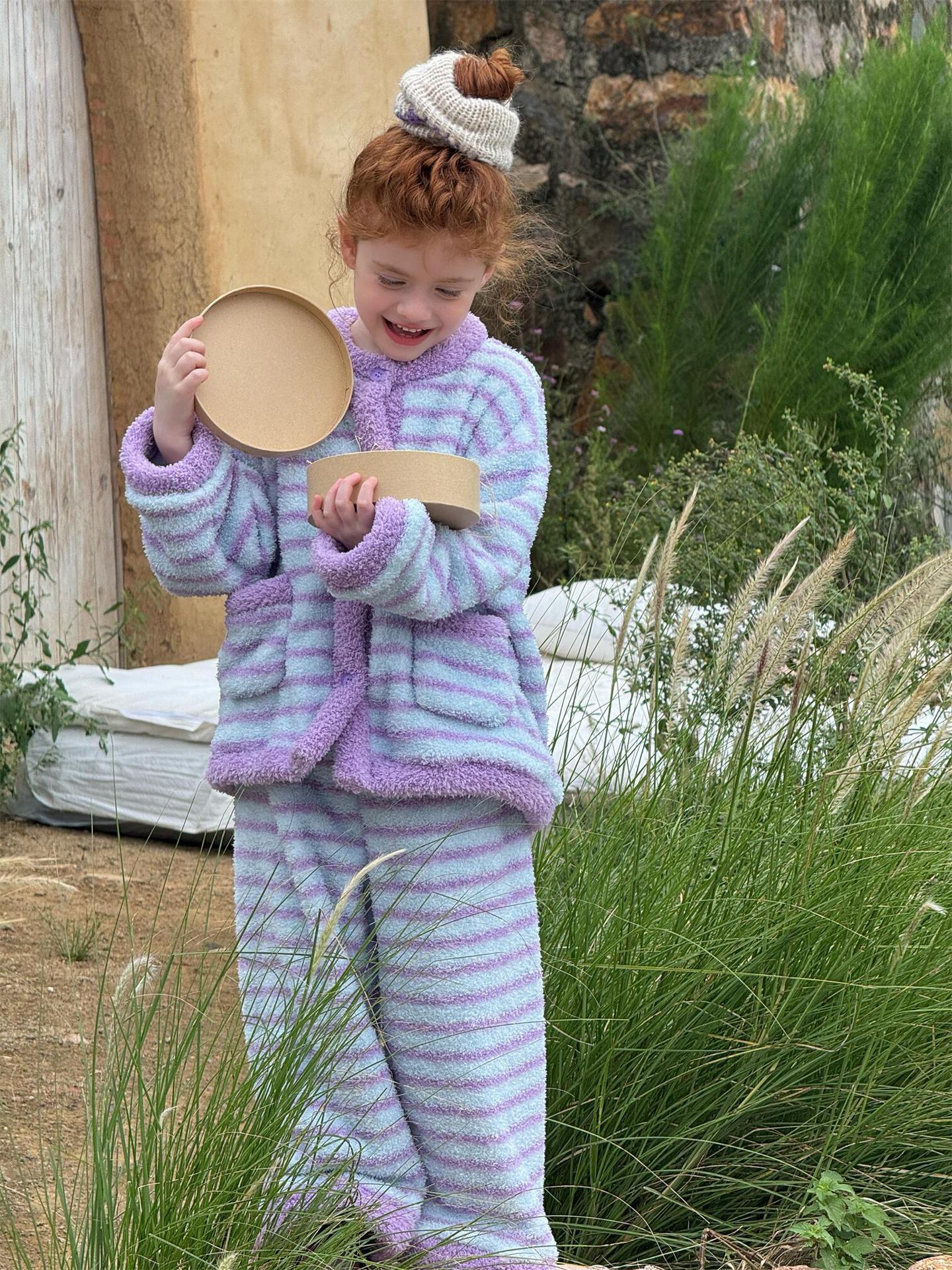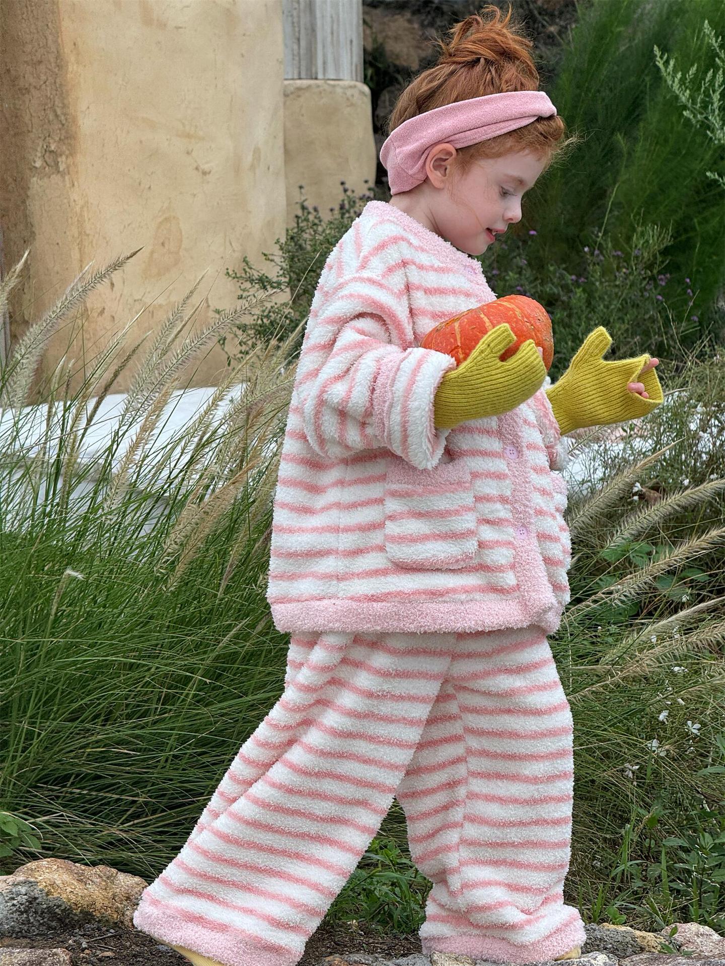 肌触り抜群のもこもこフリース素材を使用した、暖かなボーダー柄のパジャマセットアップです。トップスとロングパンツの2点セットで、リラックスタイムを快適かつおしゃれに演出します。寒い季節のホームウェアとして最適なこのルームウェアは、愛らしいデザインと柔らかな着心地で、おうち時間もスタイリッシュに過ごせる子ども服としておすすめです。