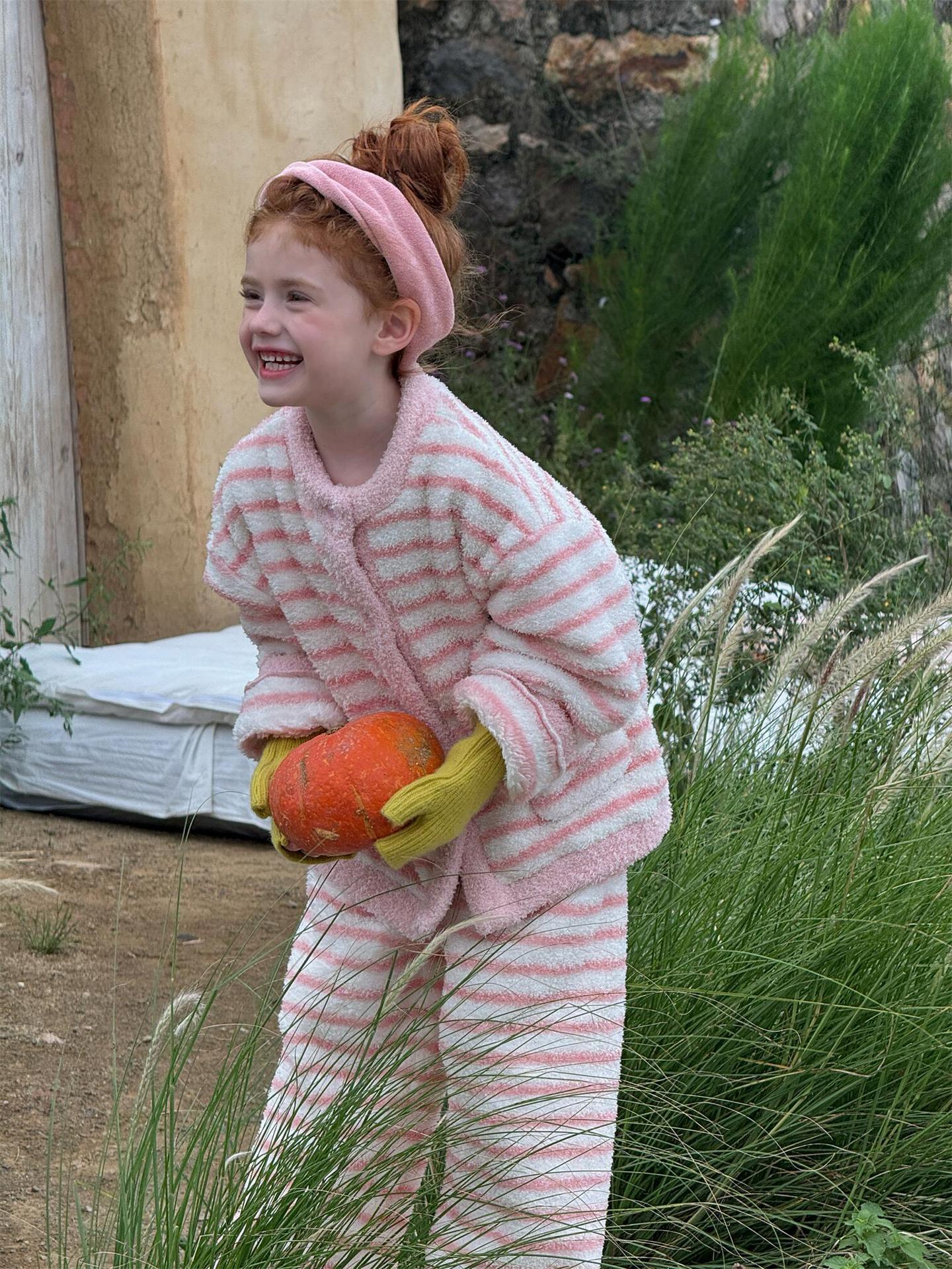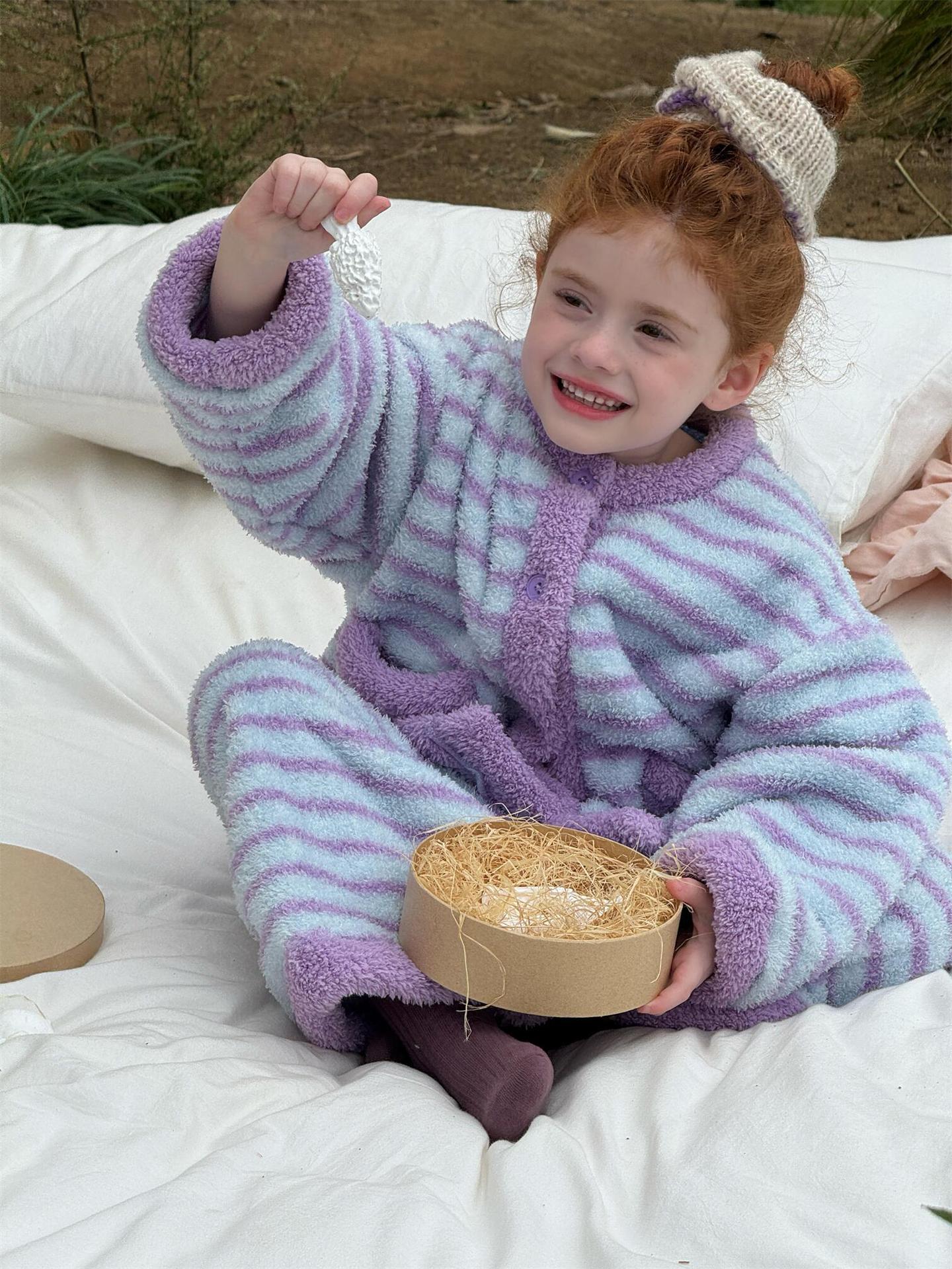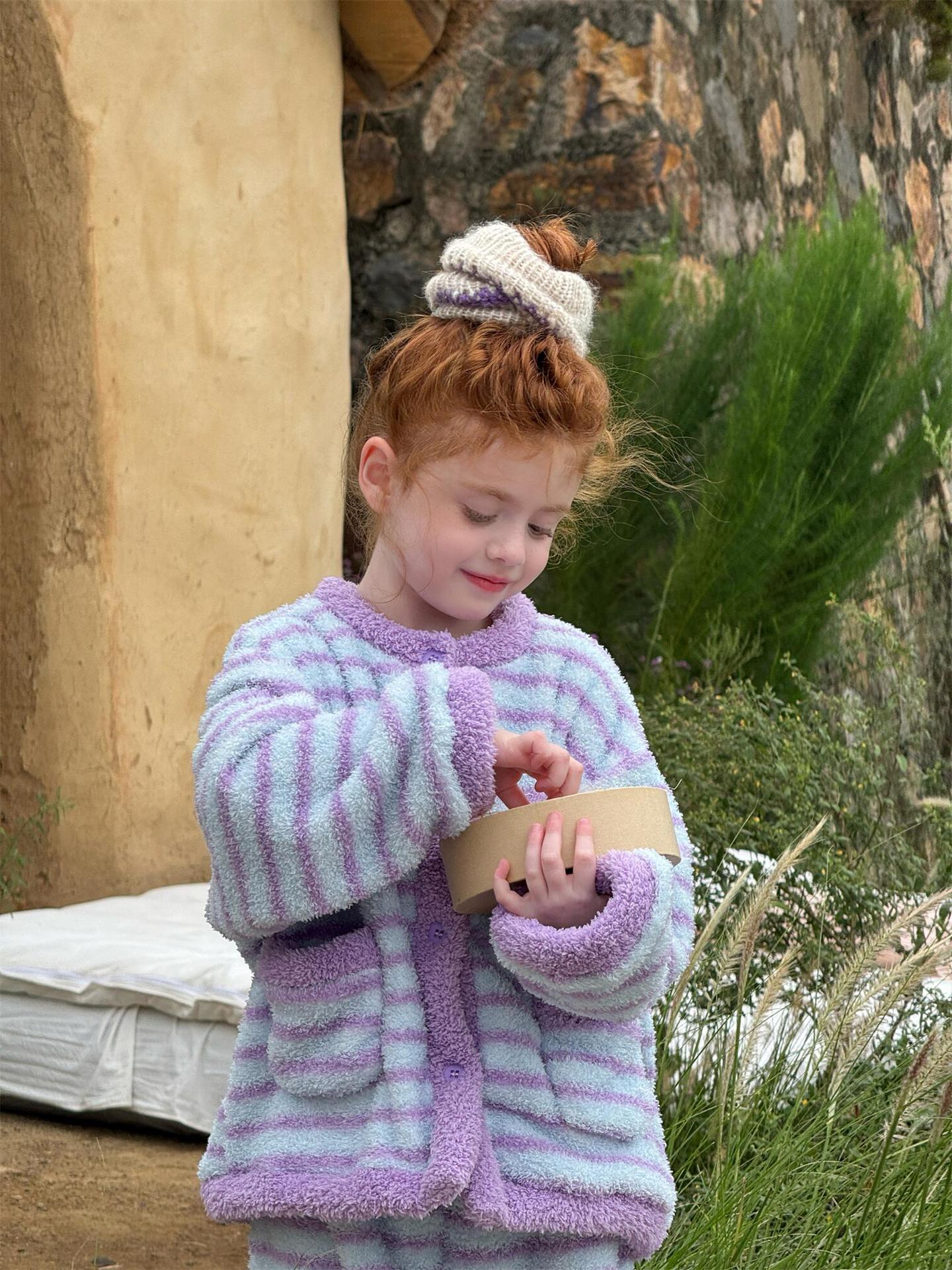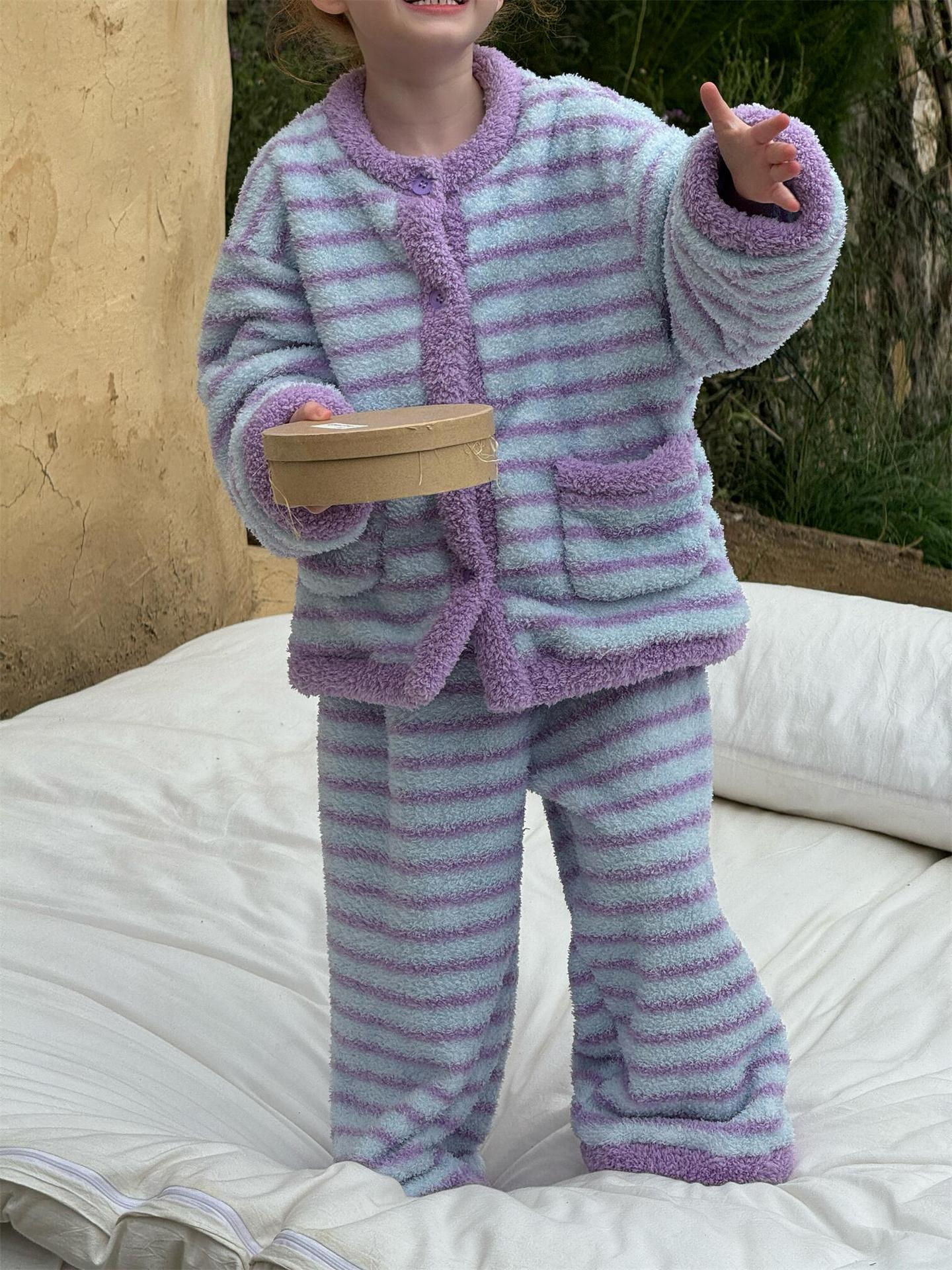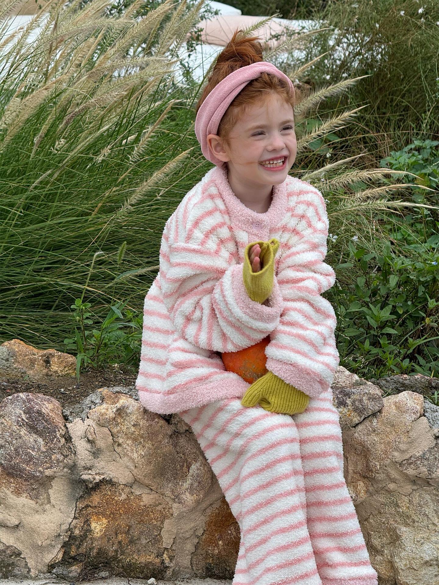 肌触り抜群のもこもこフリース素材を使用した、暖かなボーダー柄のパジャマセットアップです。トップスとロングパンツの2点セットで、リラックスタイムを快適かつおしゃれに演出します。寒い季節のホームウェアとして最適なこのルームウェアは、愛らしいデザインと柔らかな着心地で、おうち時間もスタイリッシュに過ごせる子ども服としておすすめです。