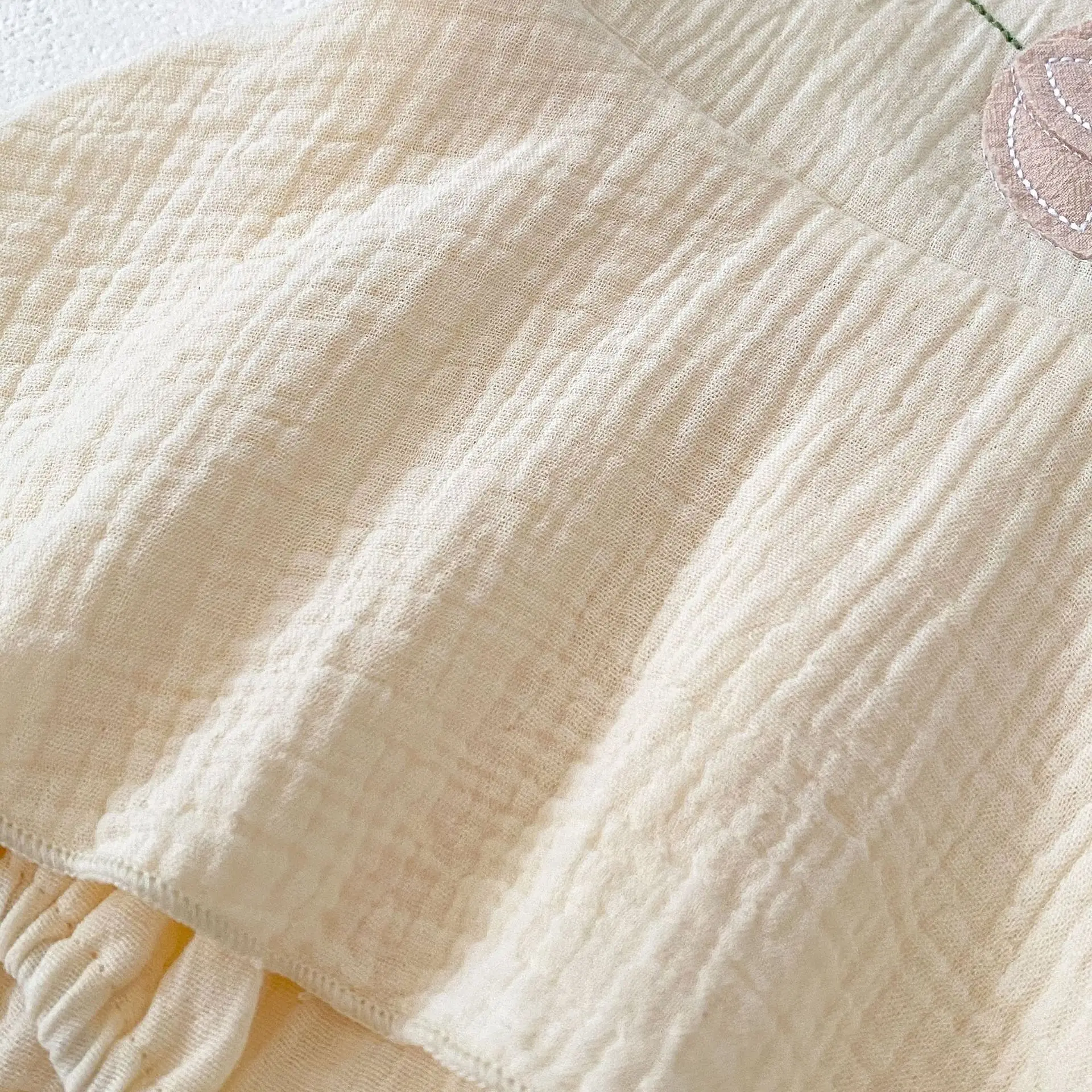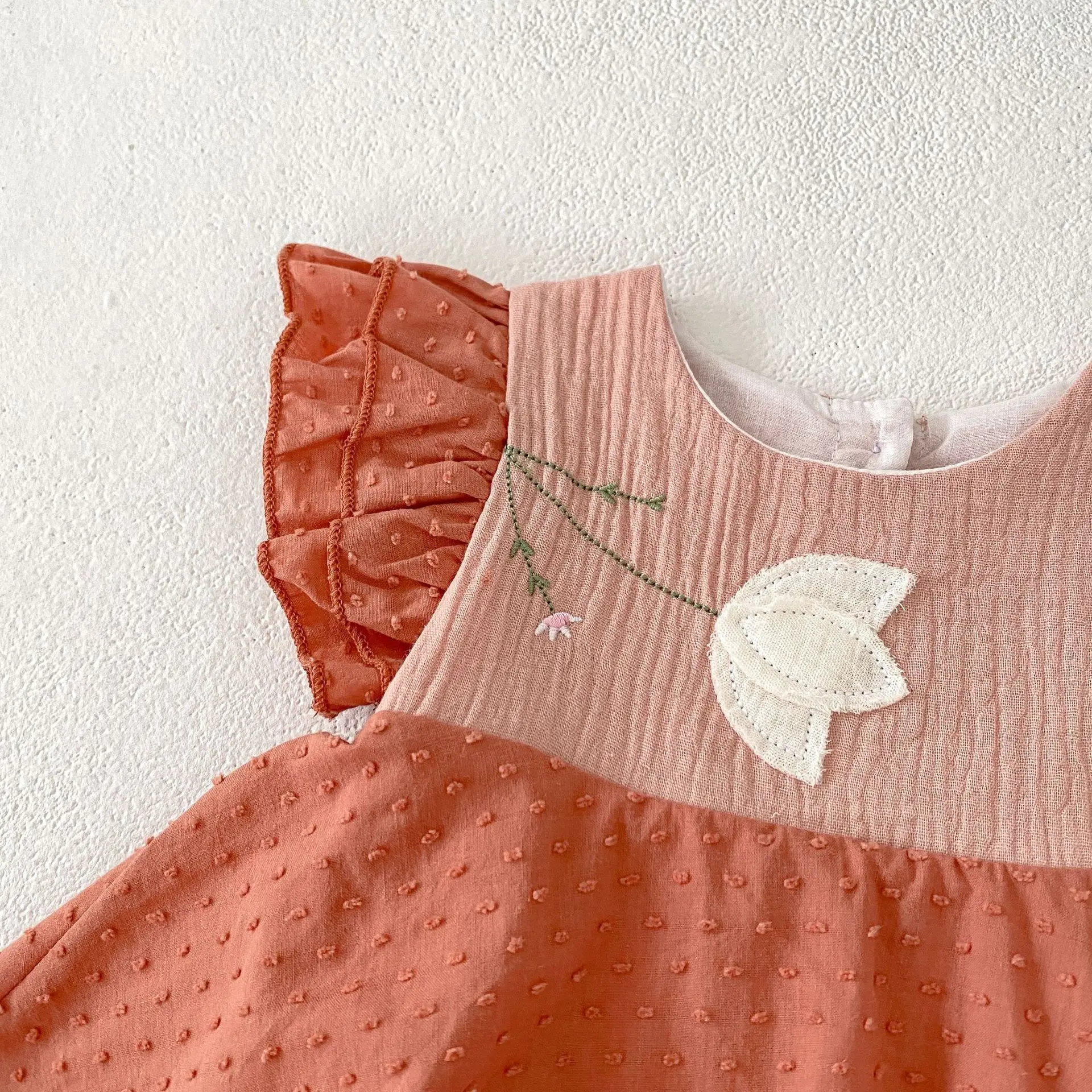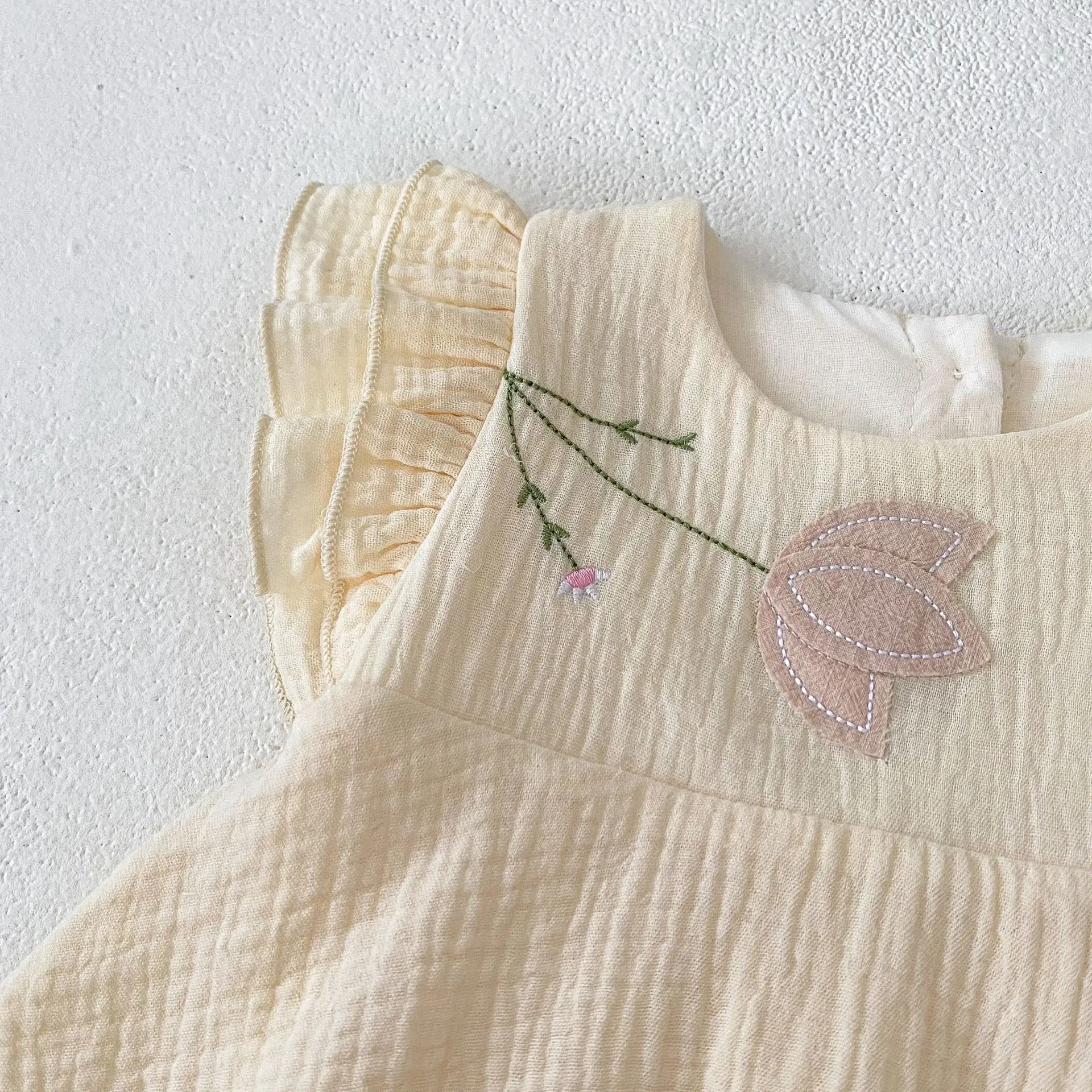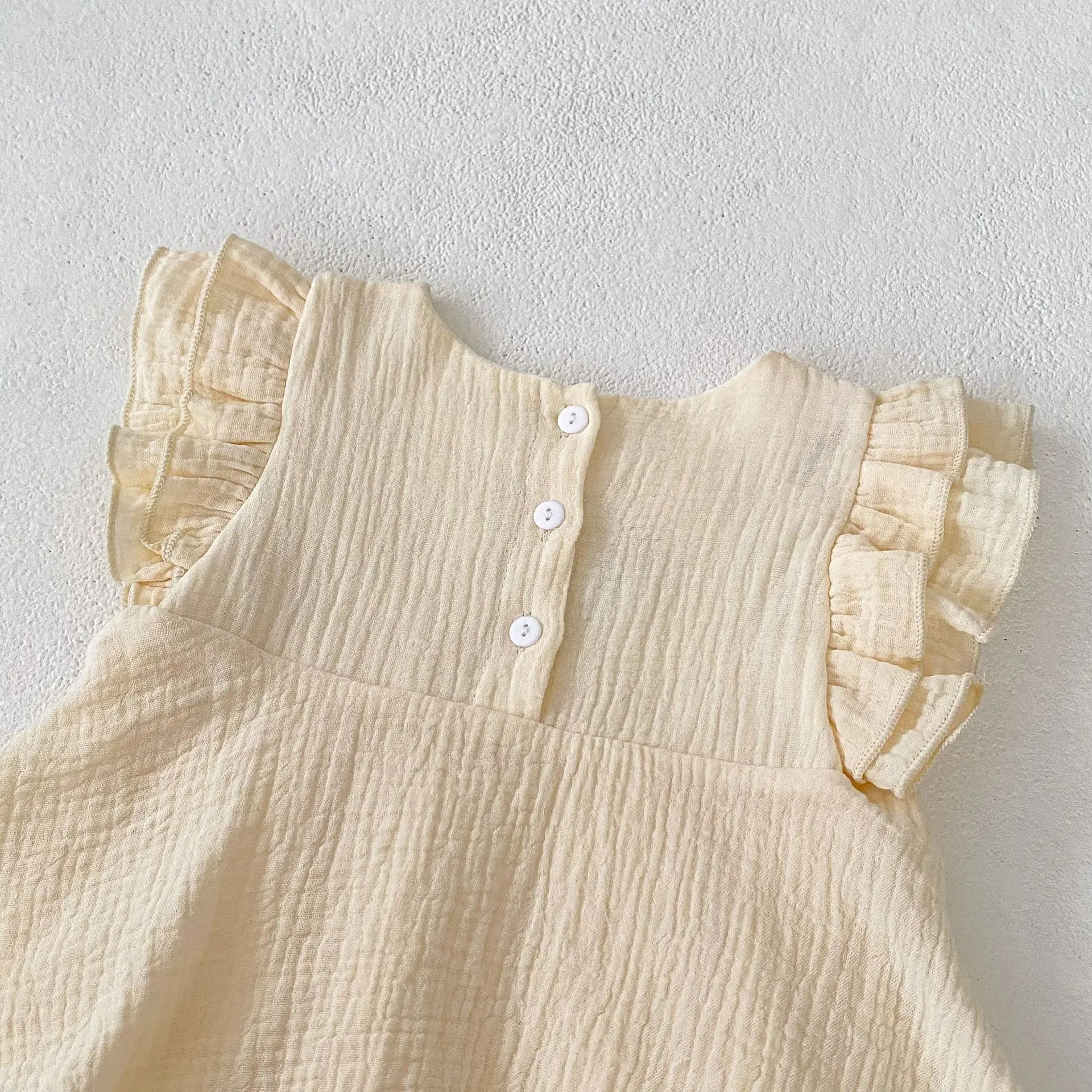 #ベビーファッション #夏の装い #ラッフルフリル袖 #フラワー刺繍 #赤ちゃんの服 #涼やかな素材