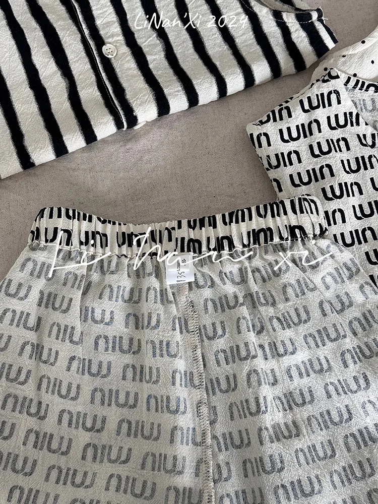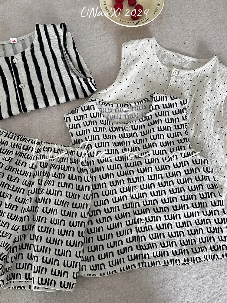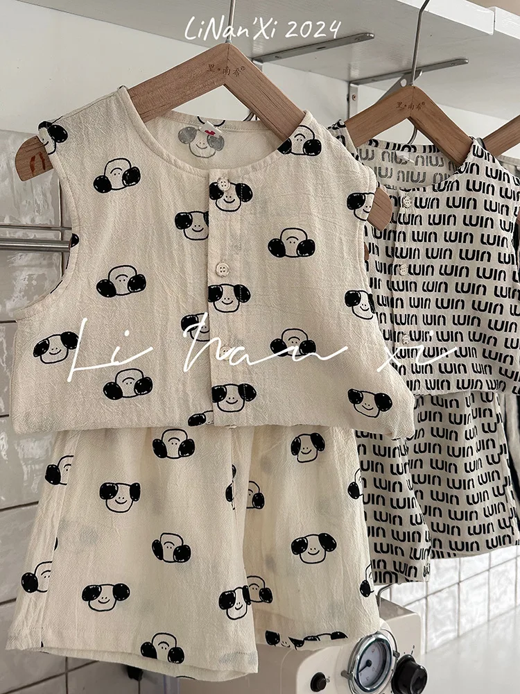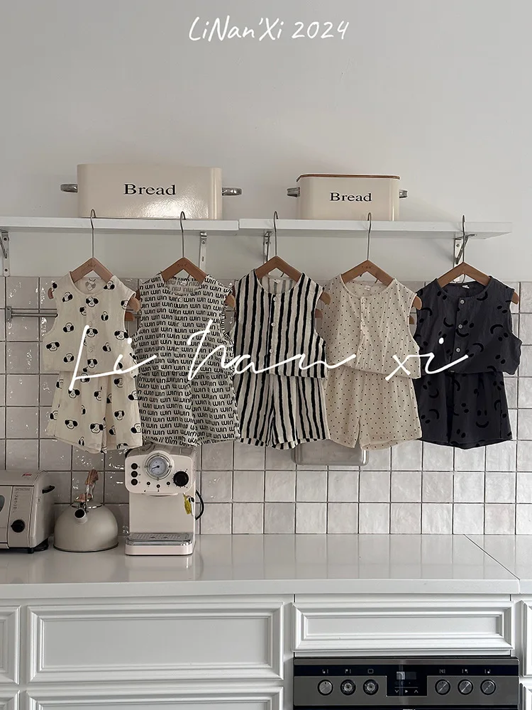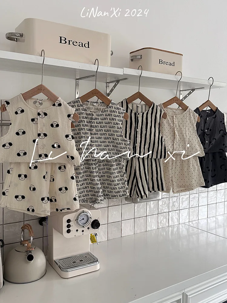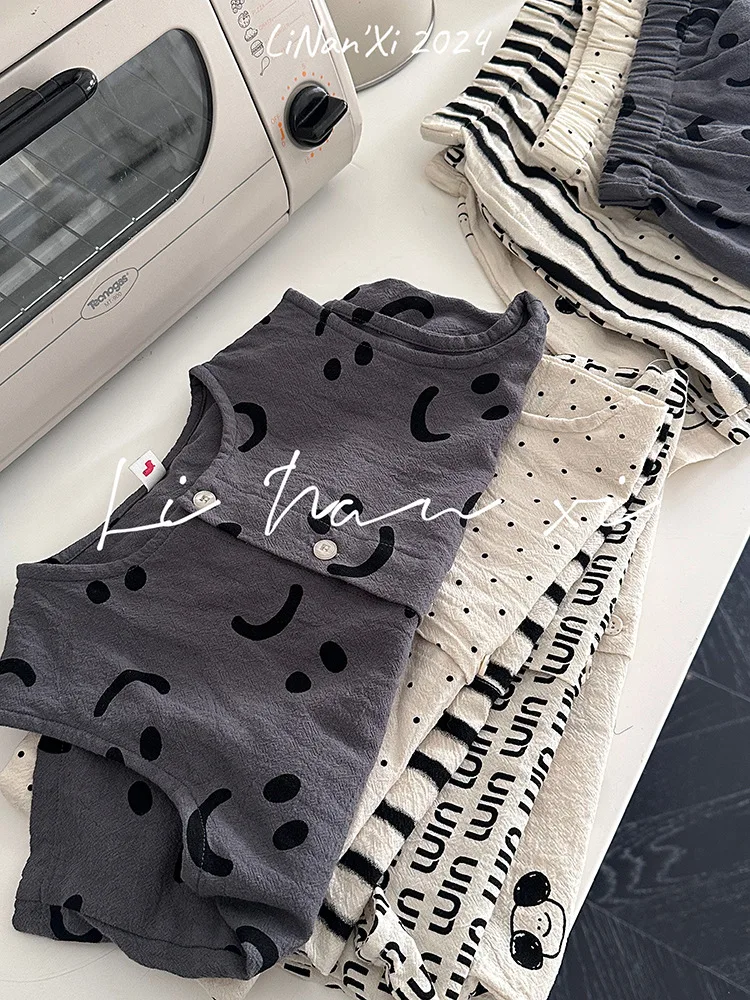 キッズセットアップ 2点セット コットンリネン プリントノースリーブトップス+ショートパンツ 5柄