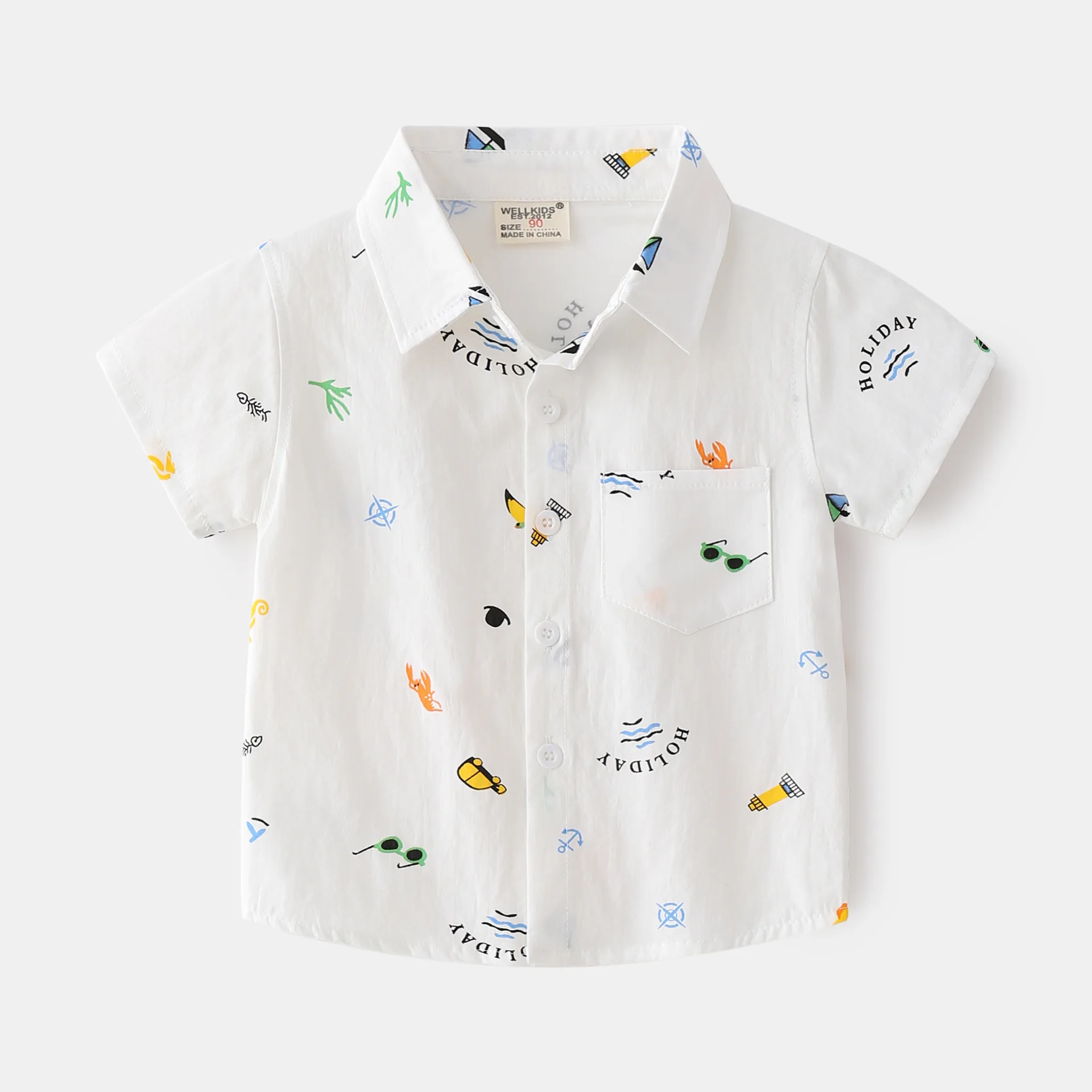 夏の日差しが降り注ぐ季節にぴったりな、爽やかで遊び心溢れるキッズ半袖シャツ。ブルーとホワイトの2色展開で、それぞれ個性的なサマープリント柄が目を惹きます。胸元のボタンや襟元は、カジュアルな印象を与えながらも上品さを演出。どんなボトムスにも合わせやすく、デイリーユースに最適な1枚です。