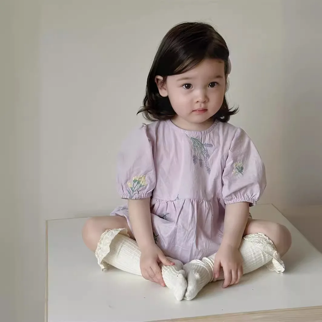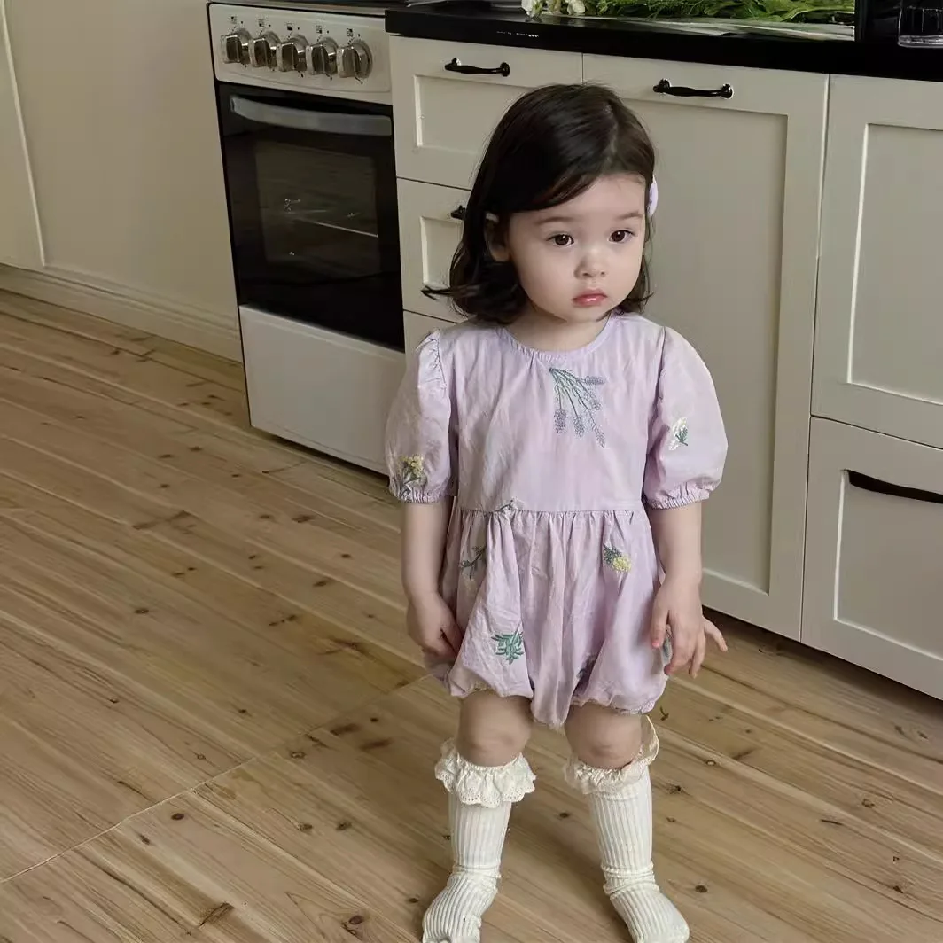 ベビーロンパース 半袖パフスリーブボディスーツ フラワー花柄刺繍 2カラー【mh0005625】
