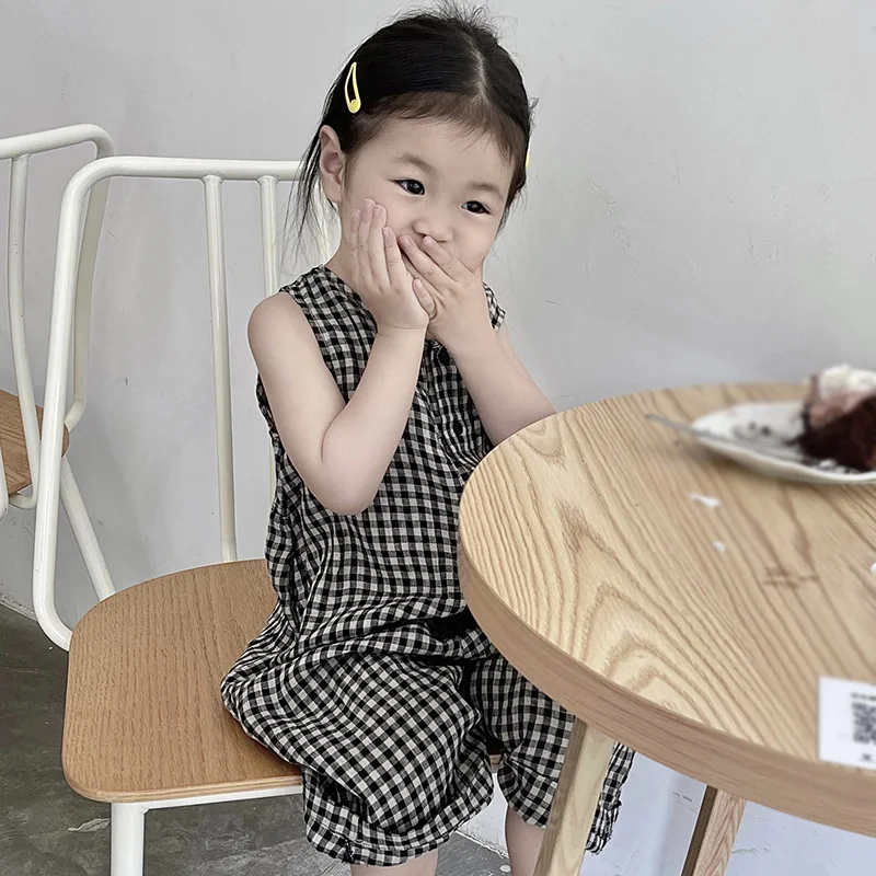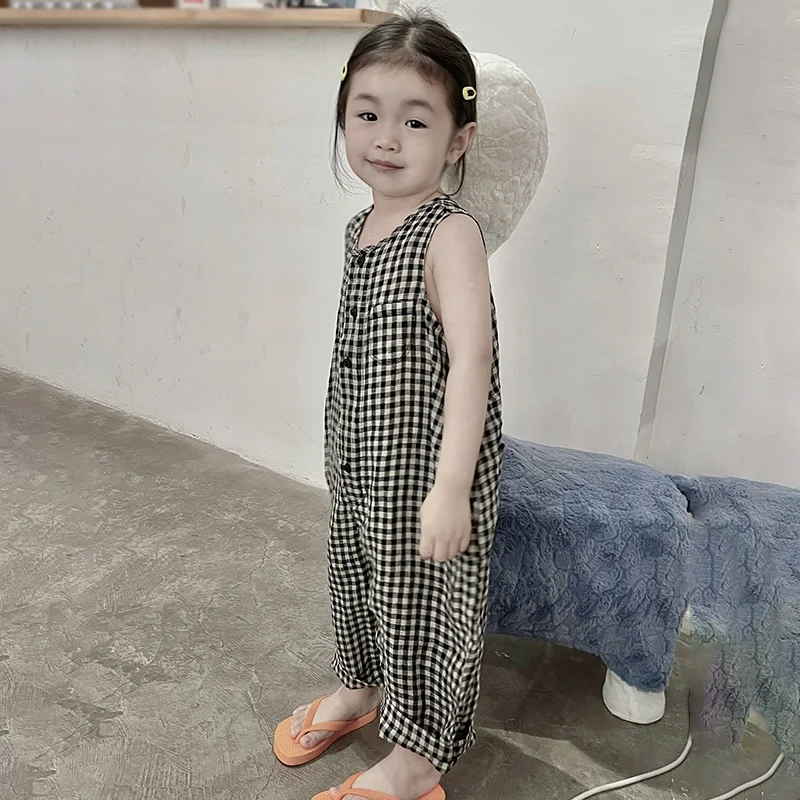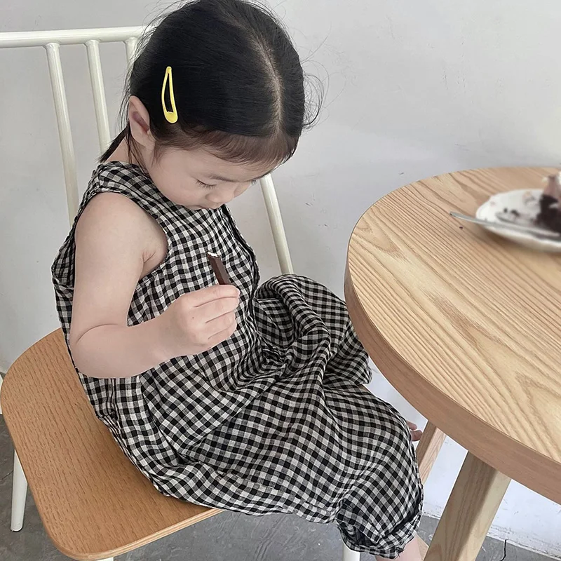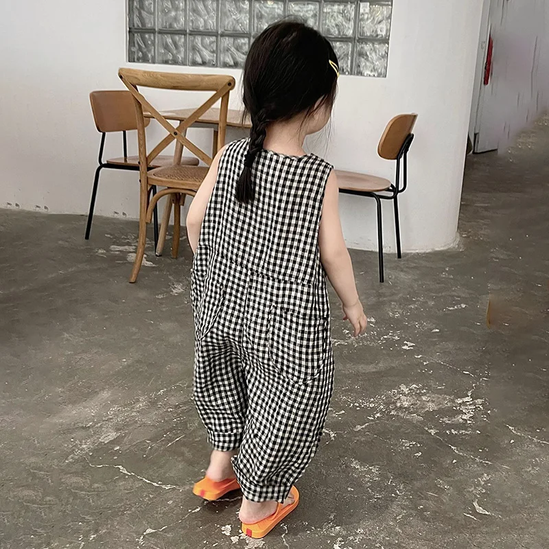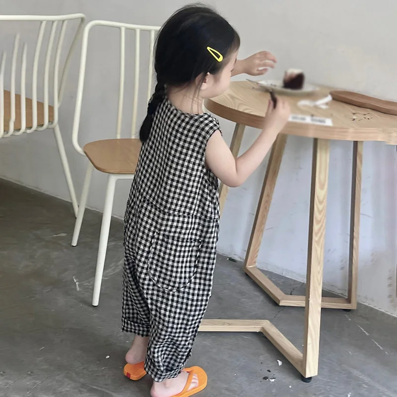 このキッズジャンプスーツは、夏にぴったりの3-8歳の女の子向けのチェック柄のノースリーブつなぎです。カジュアルでルーズなルックスで、着心地が良く、ワイドレッグパンツが動きやすさをサポートします。黒と白のプリントで、オシャレに楽しめます。