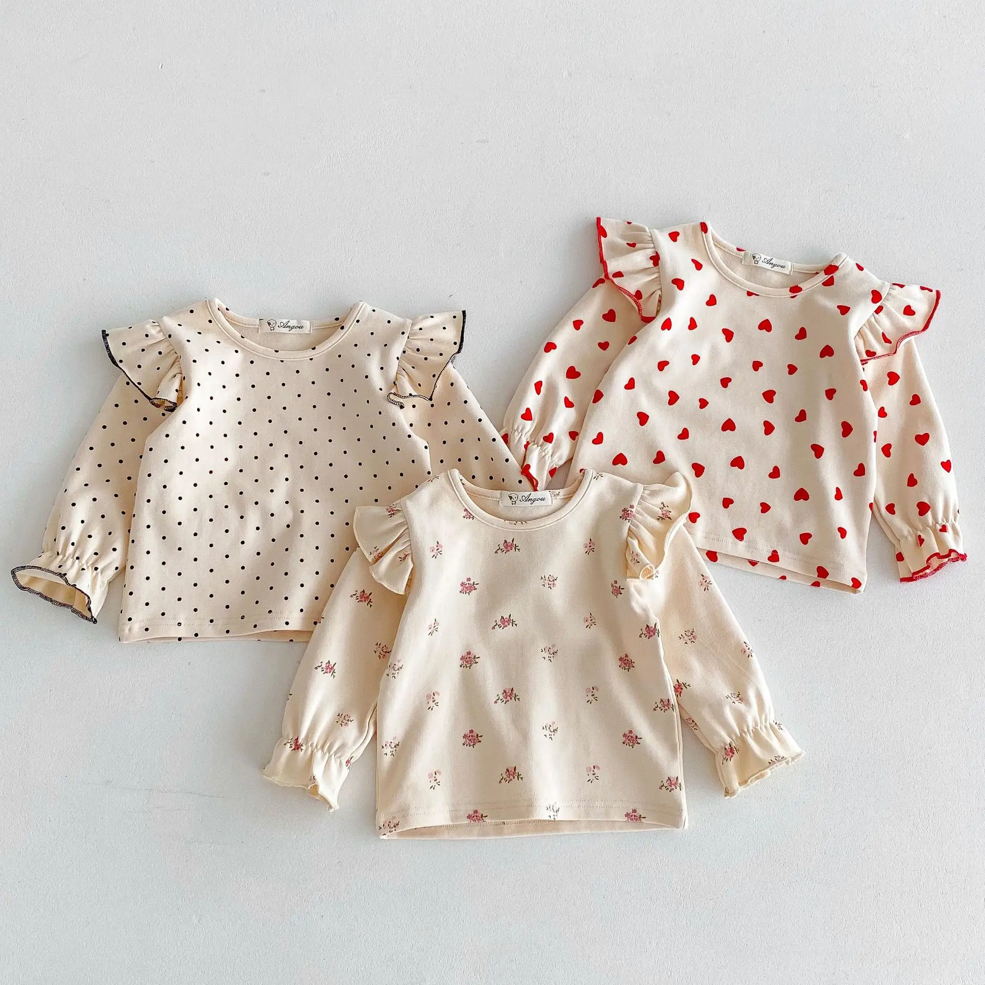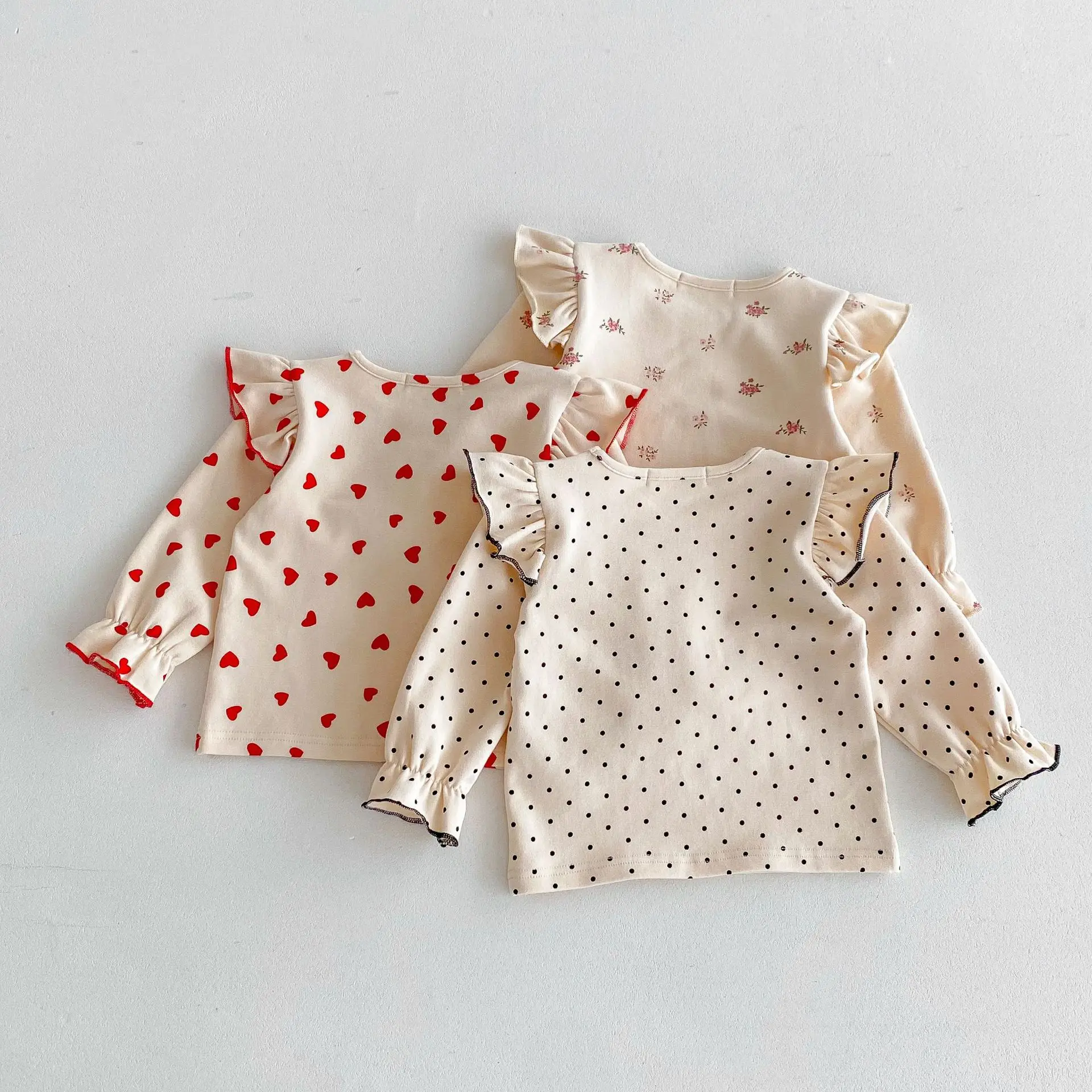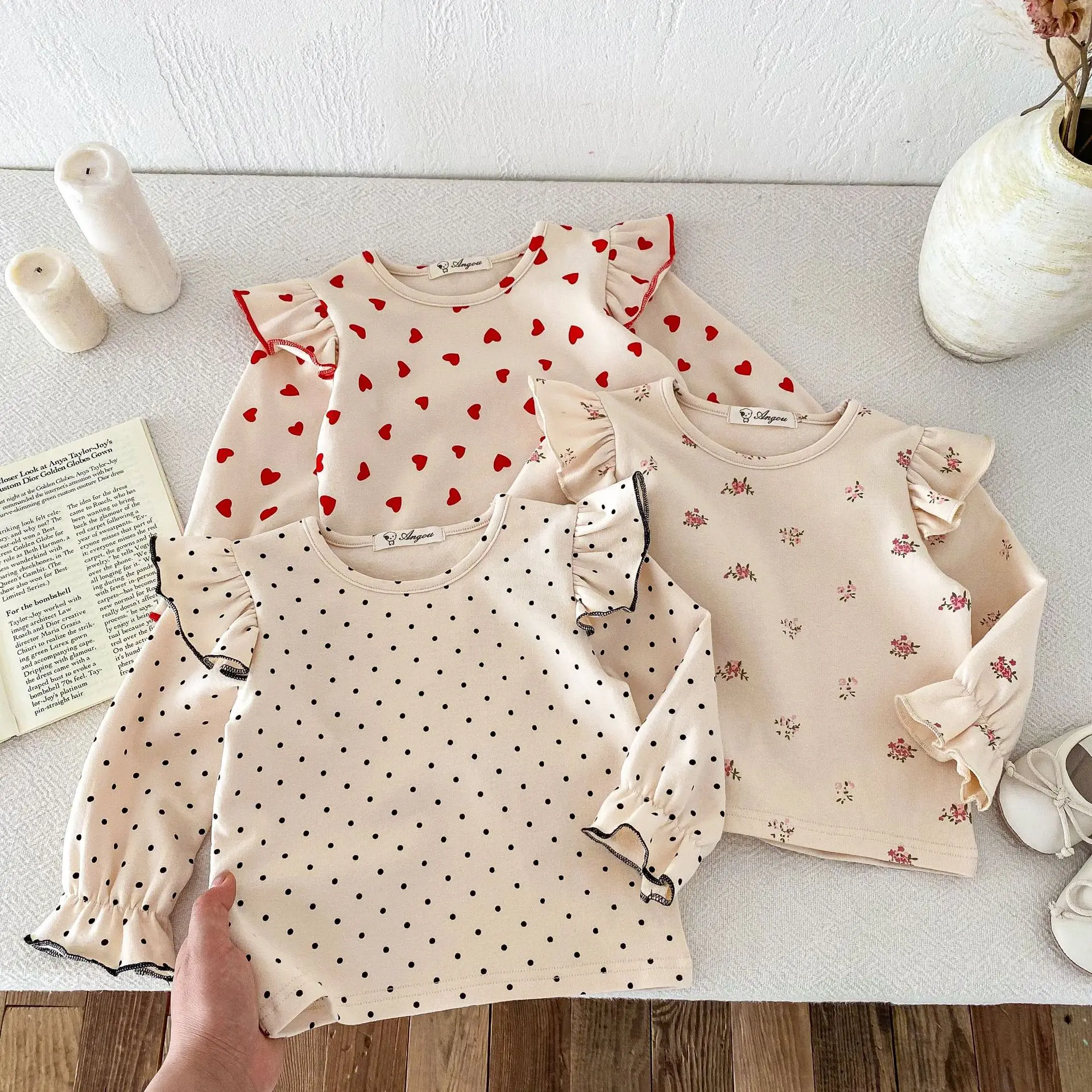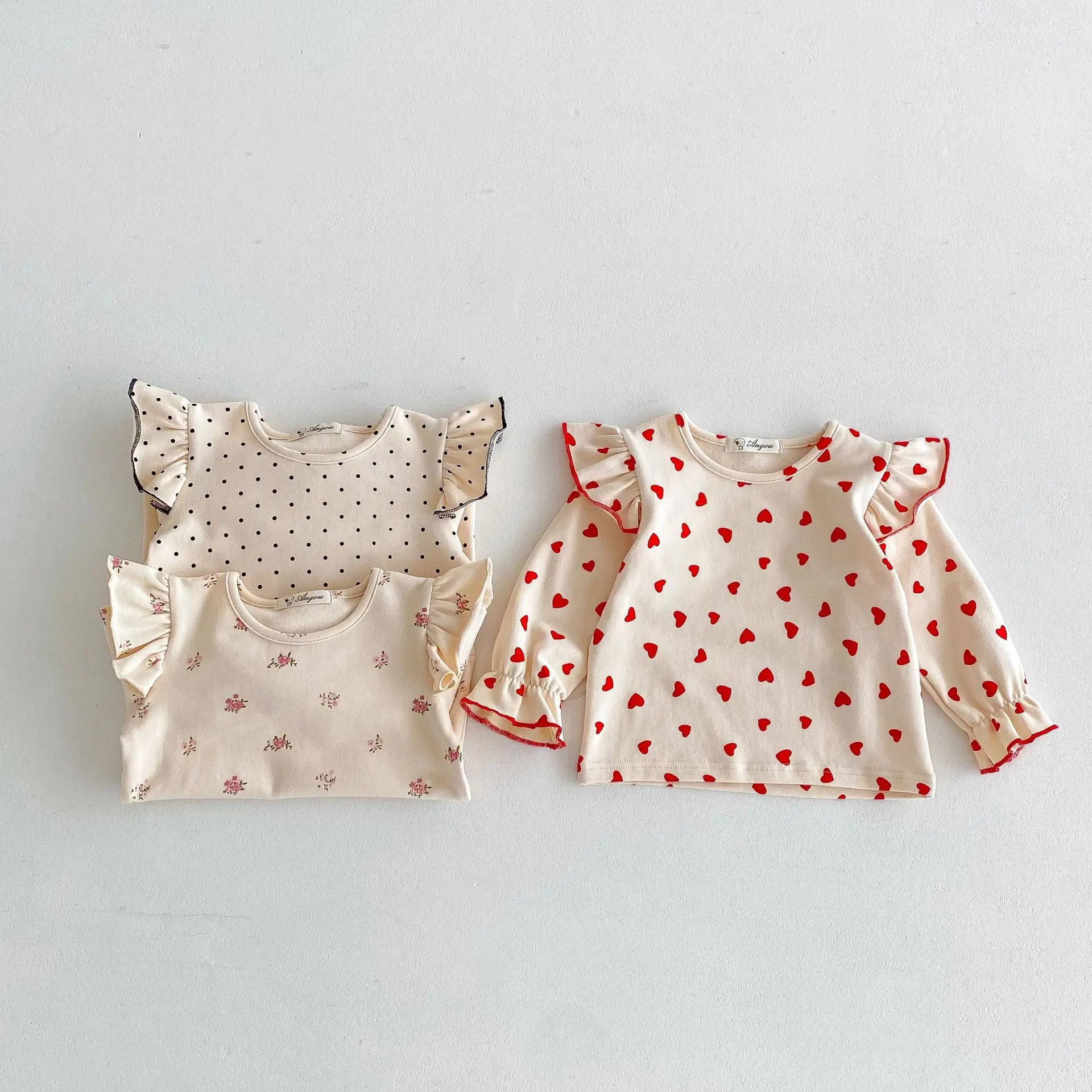 キッズトップス 長袖ショルダーフリルTシャツ ハート/フラワー小花柄/水玉ドットプリント【mh0006643】