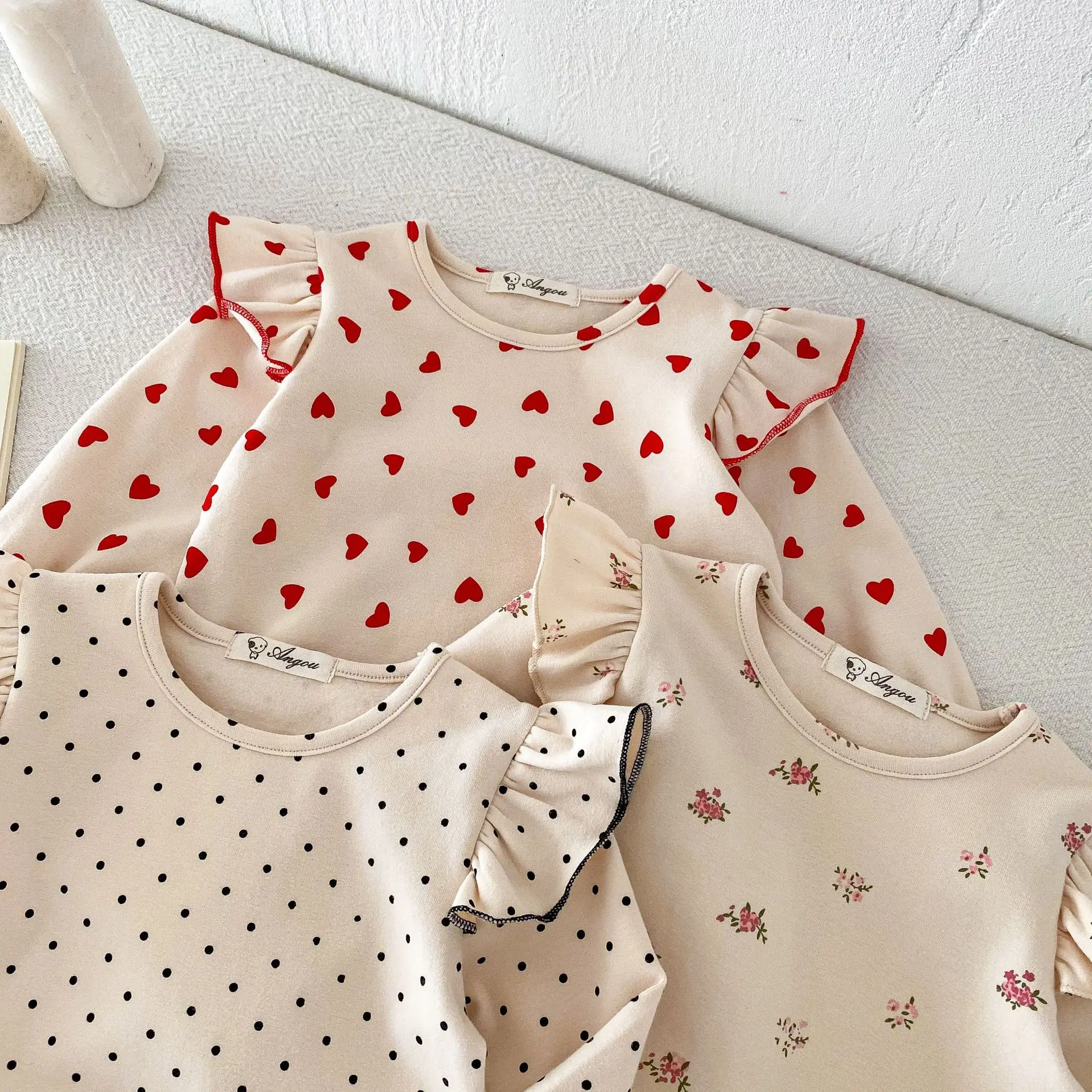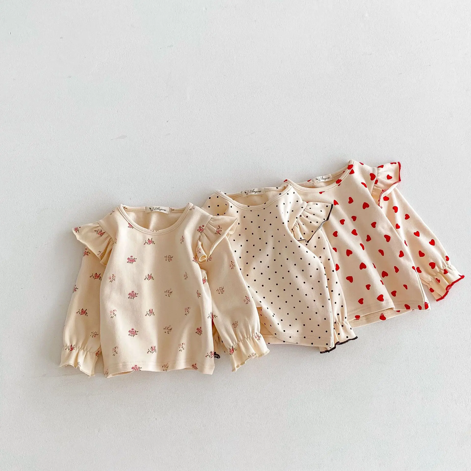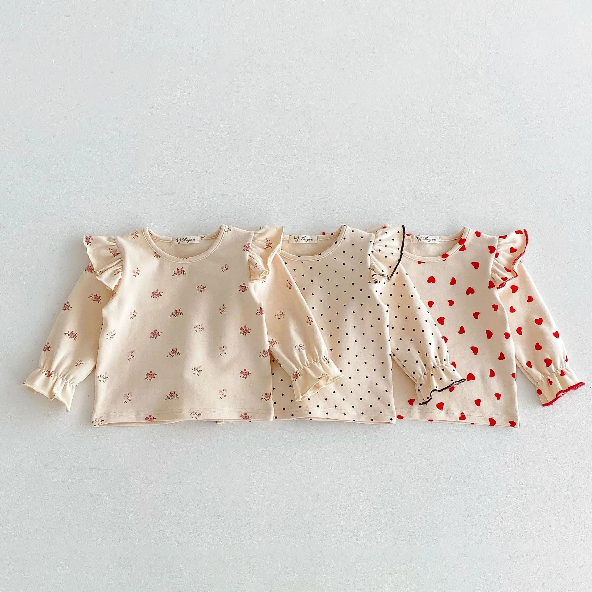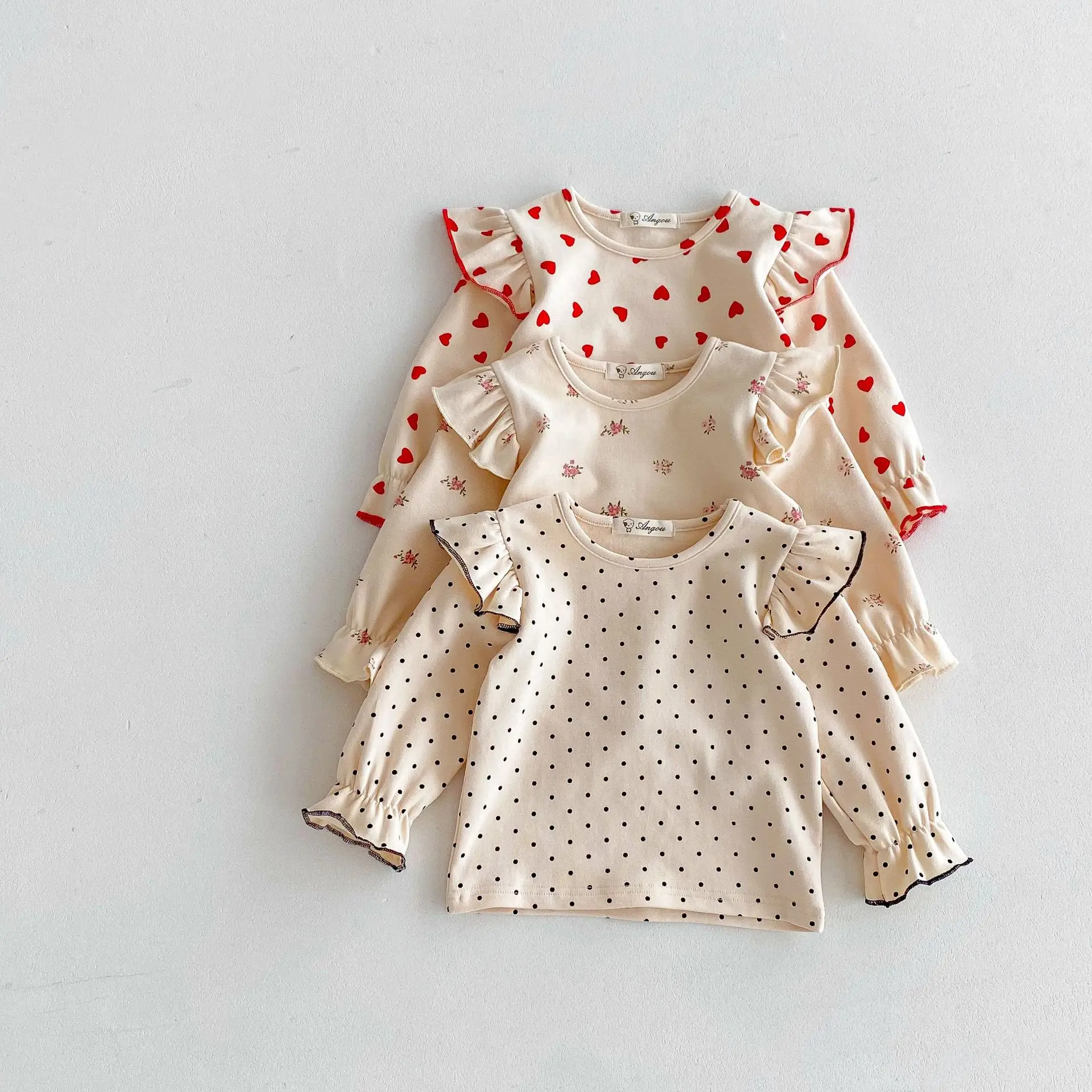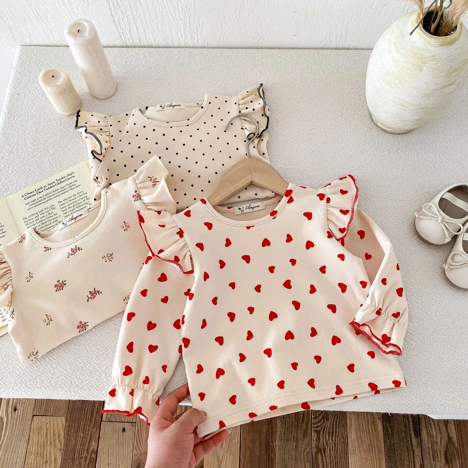 キッズトップス 長袖ショルダーフリルTシャツ ハート/フラワー小花柄/水玉ドットプリント【mh0006643】