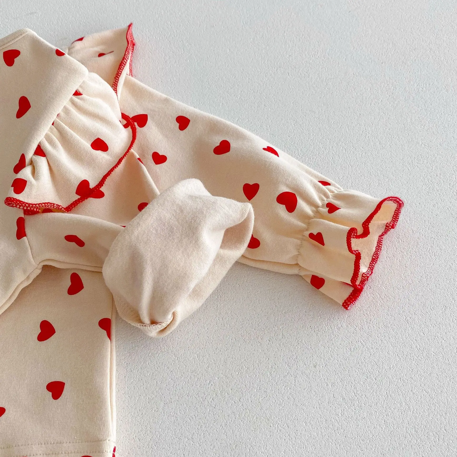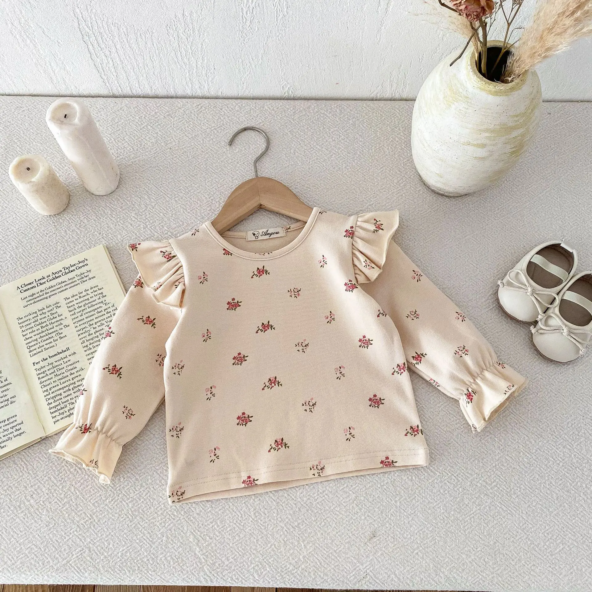 長袖ショルダーフリルが特徴のキッズ用Tシャツです。ハート、小花柄、水玉ドットプリントの3デザインで、どれも可愛らしくおしゃれな印象を与えます。柔らかな素材で心地よく、ショルダーフリルがプリンセス気分を盛り上げます。カジュアルなスタイルにぴったりで、お子様の日常コーディネートに最適です。