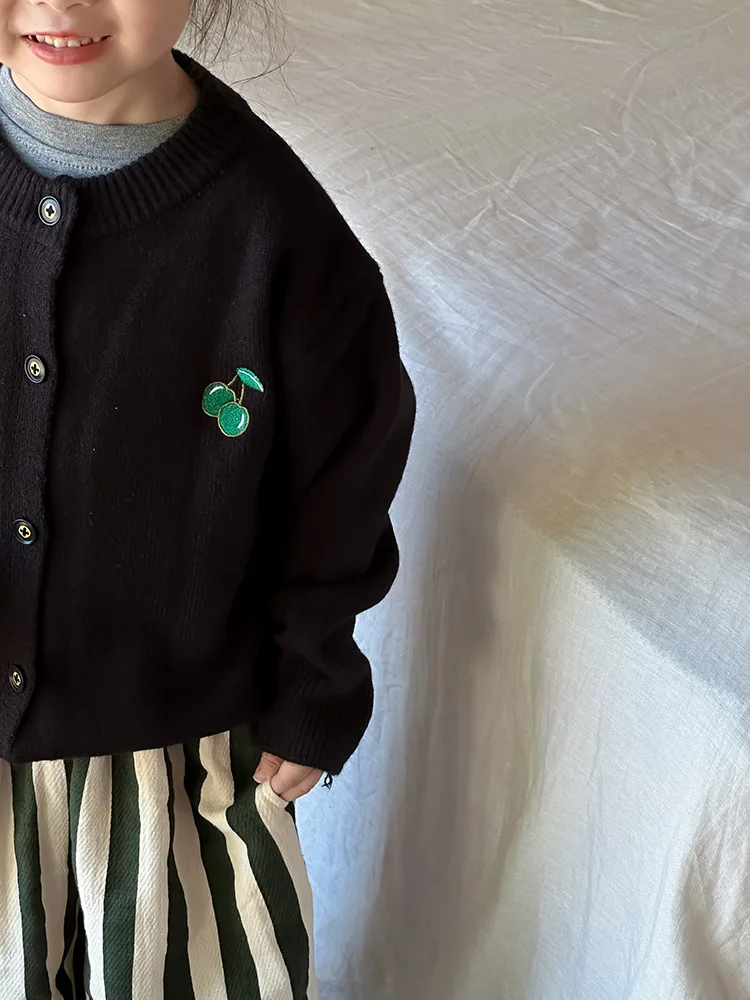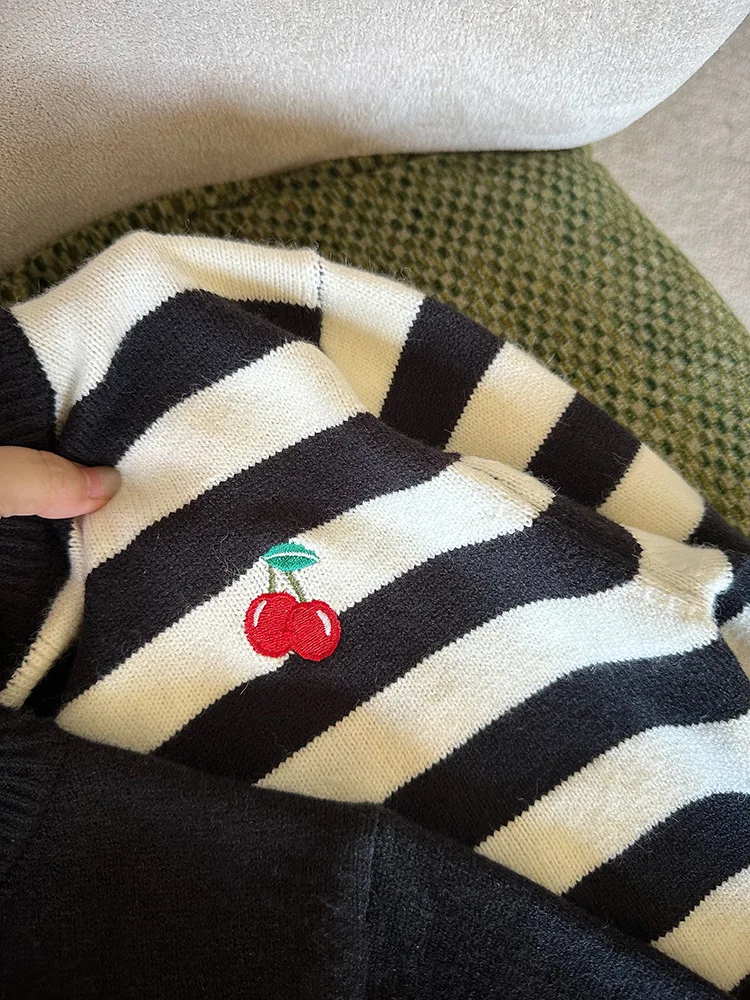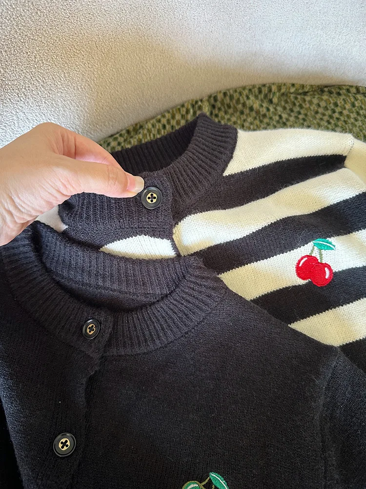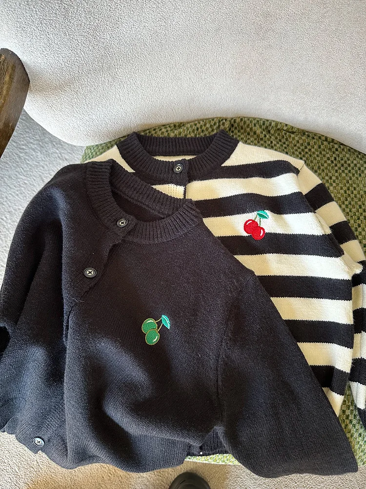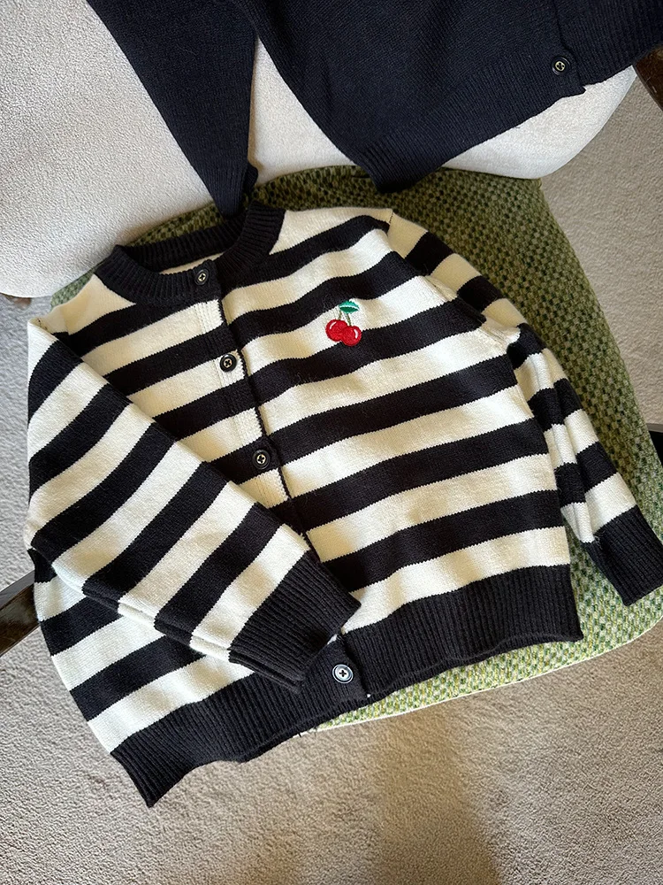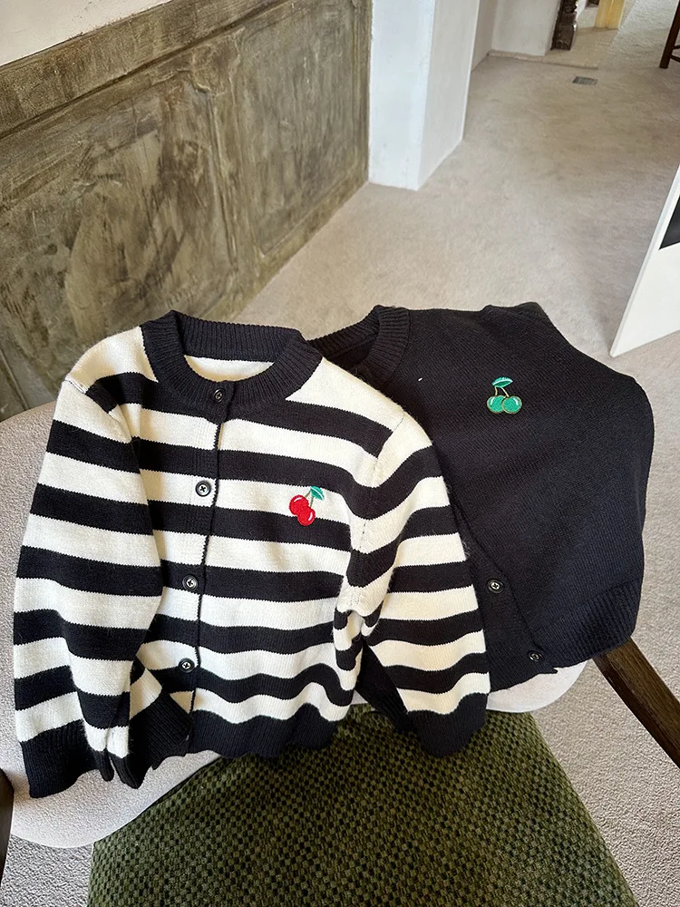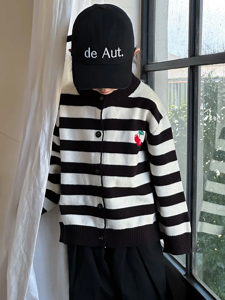 #キッズカーディガン #チェリー刺繍 #ボーダーデザイン #ニットジャケット #カジュアルファッション #子供服