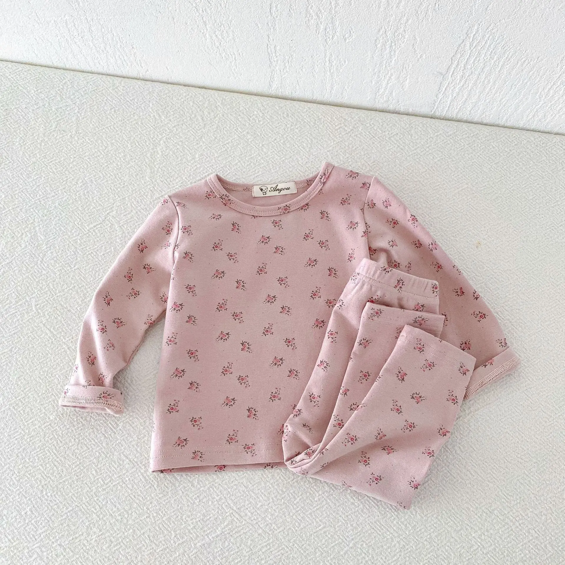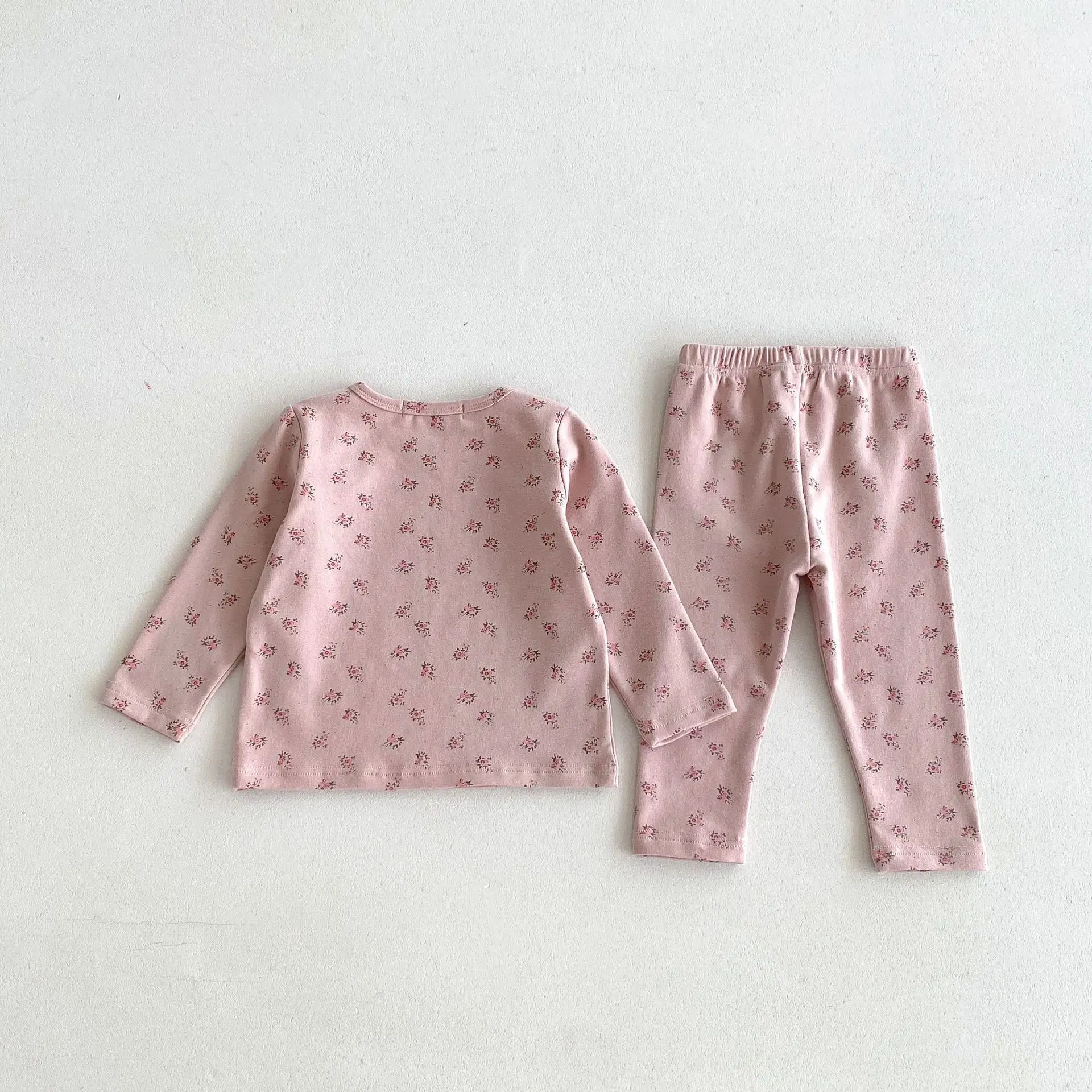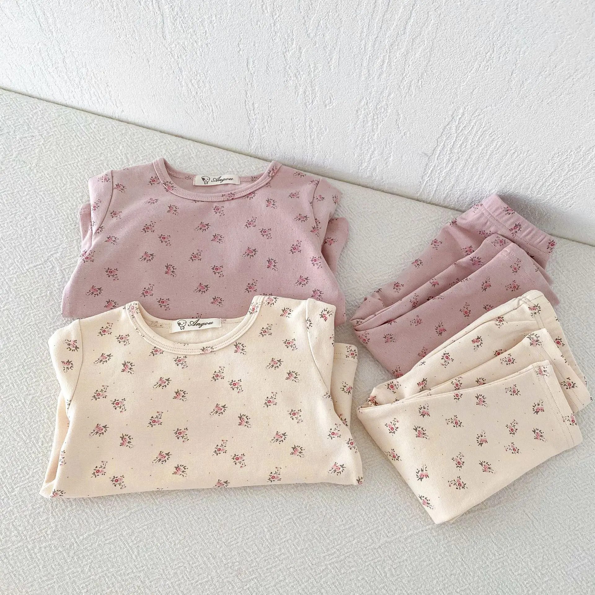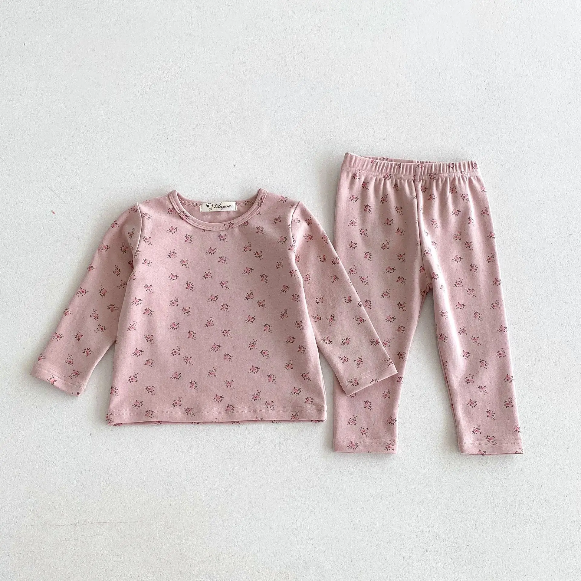 キッズパジャマセット フラワー小花柄プリント長袖Tシャツ+ロングパンツ 2カラー【mh0006974】