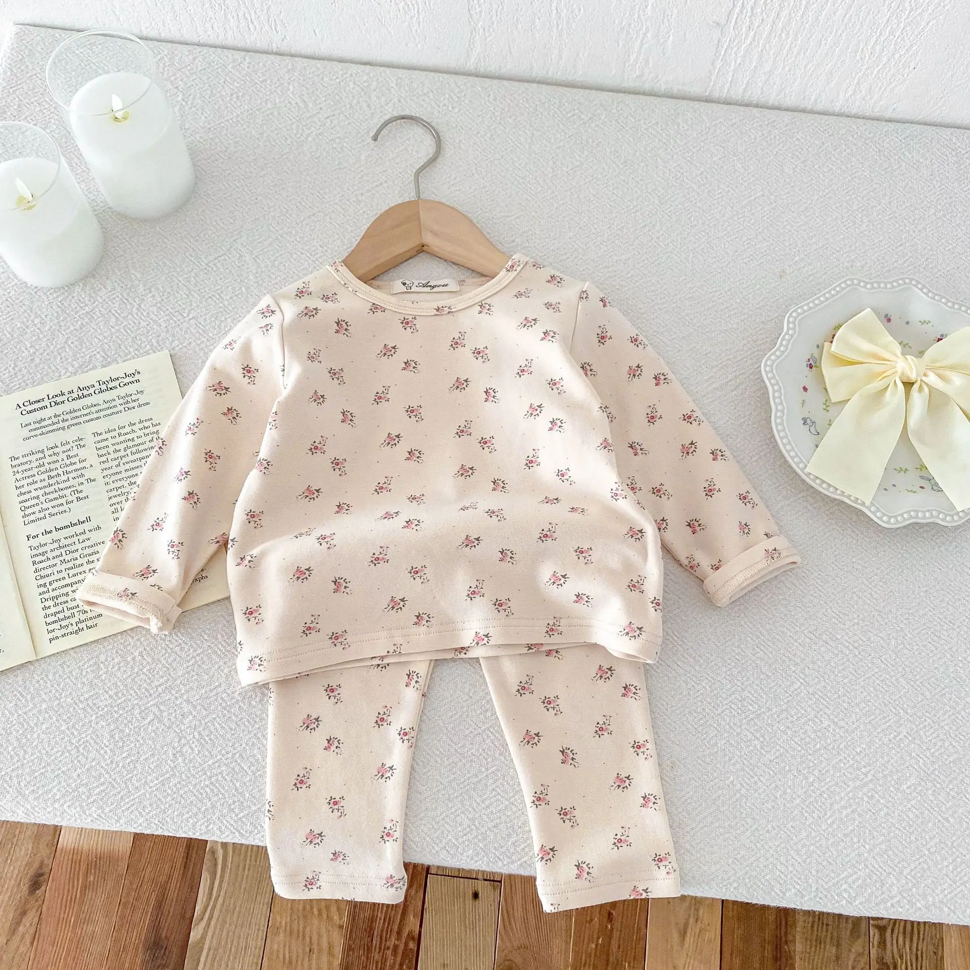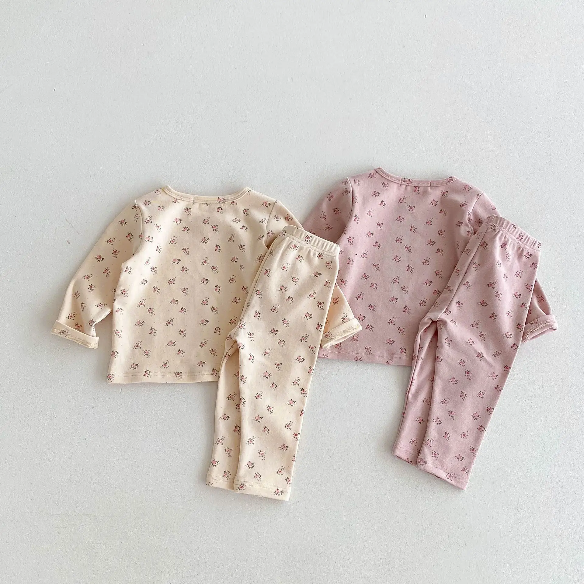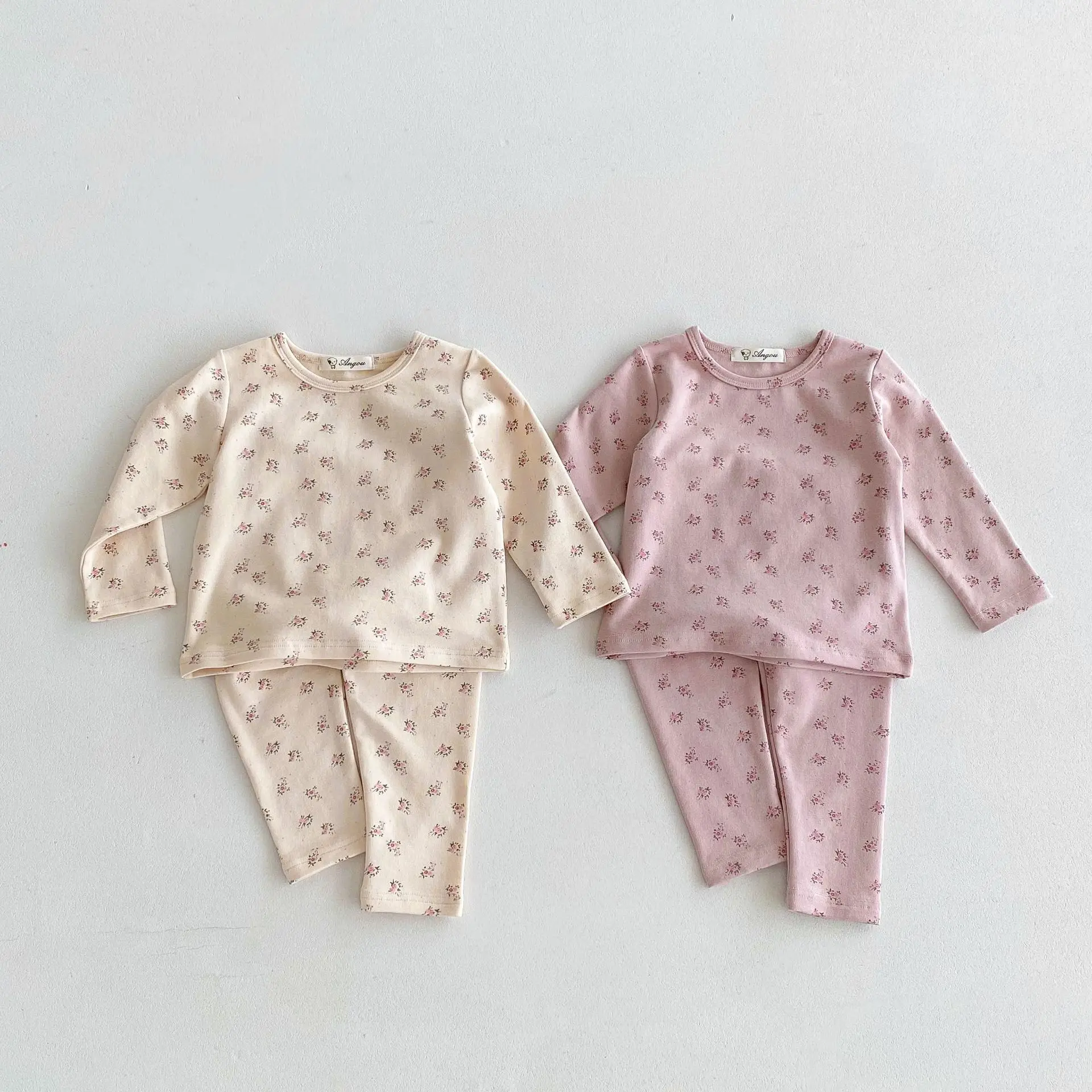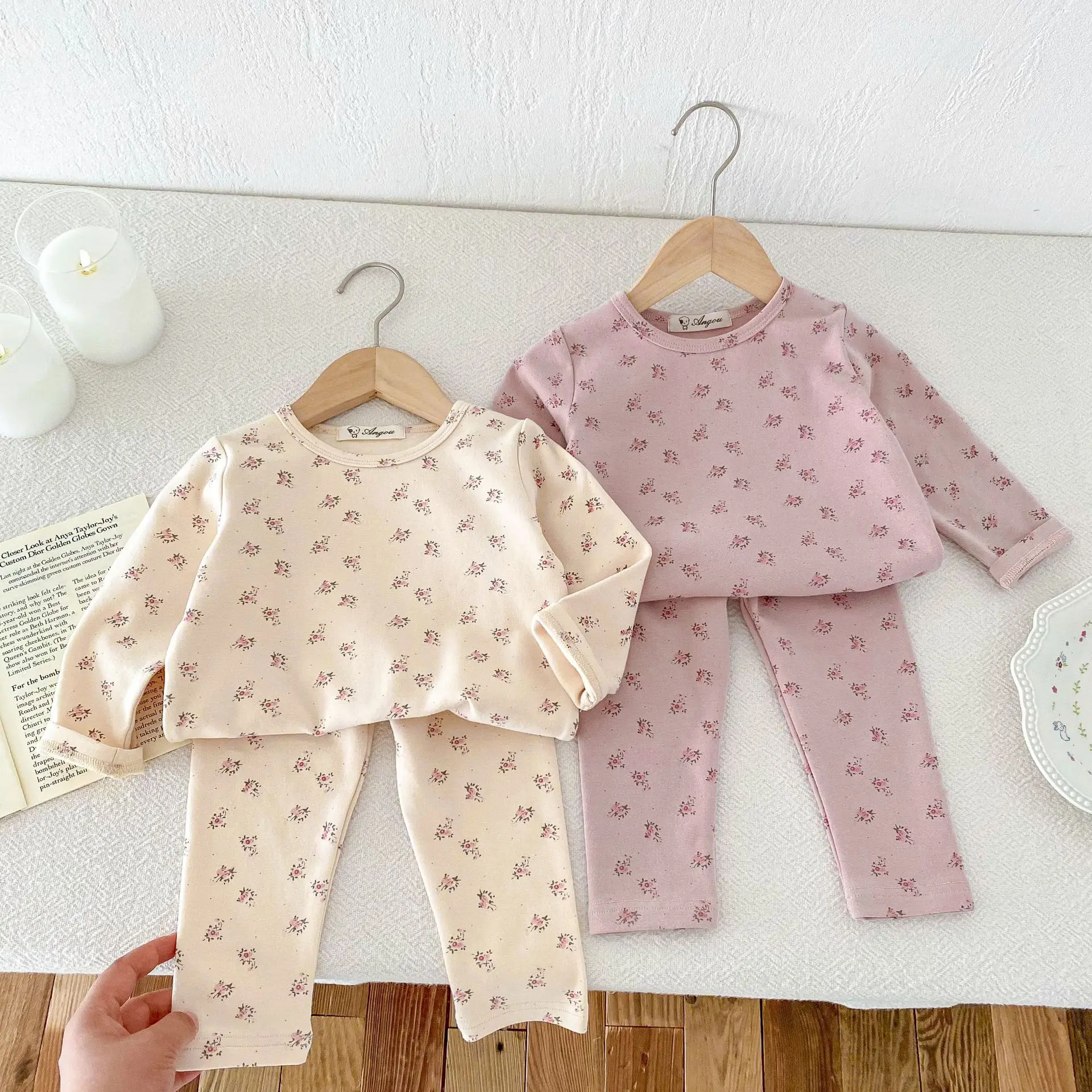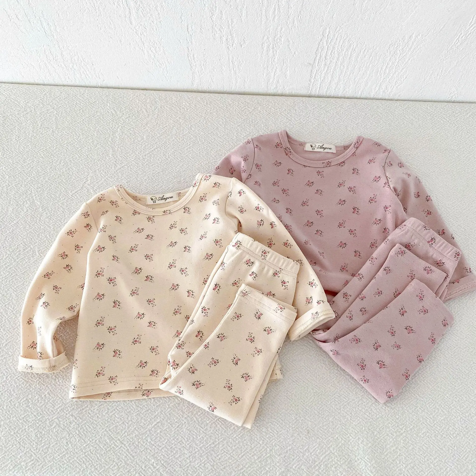 キッズパジャマセット フラワー小花柄プリント長袖Tシャツ+ロングパンツ 2カラー【mh0006974】