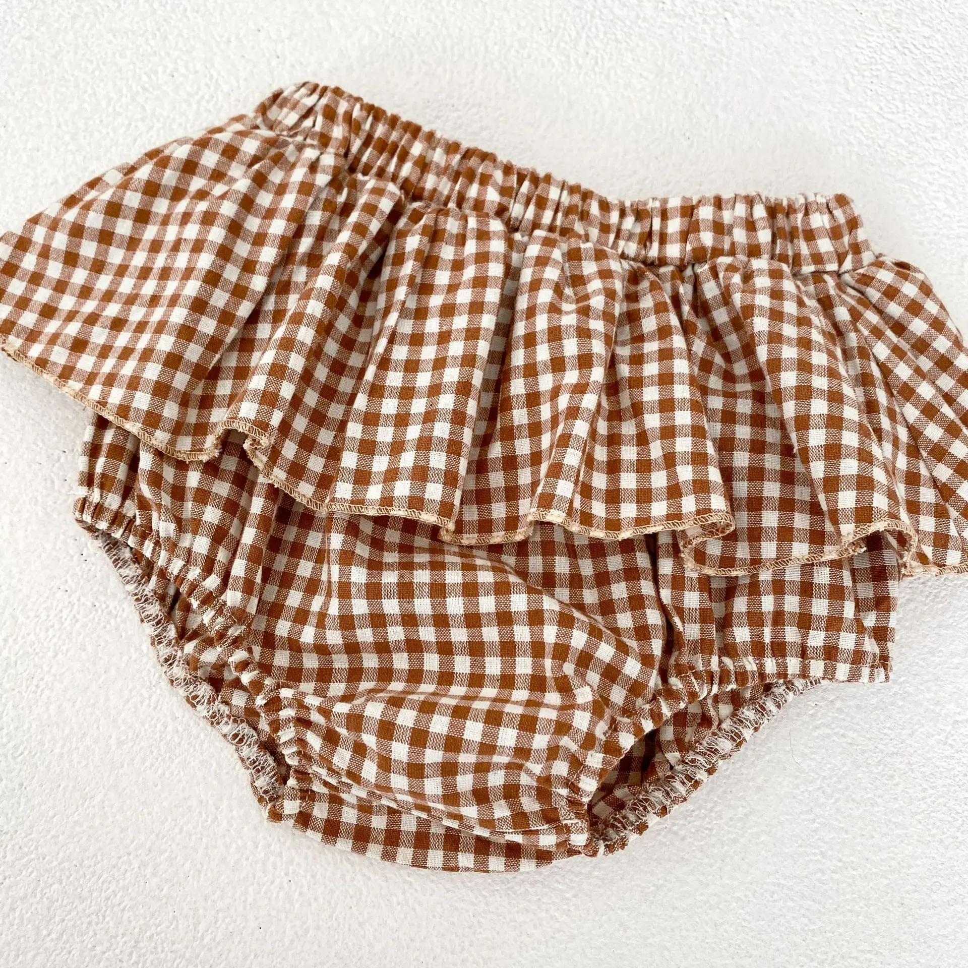 ベビーキッズセットアップ 2点セット フラワー刺繍襟長袖チュニックブラウス+フリルスカートブルマパンツ チェック4カラー【mh0007150】