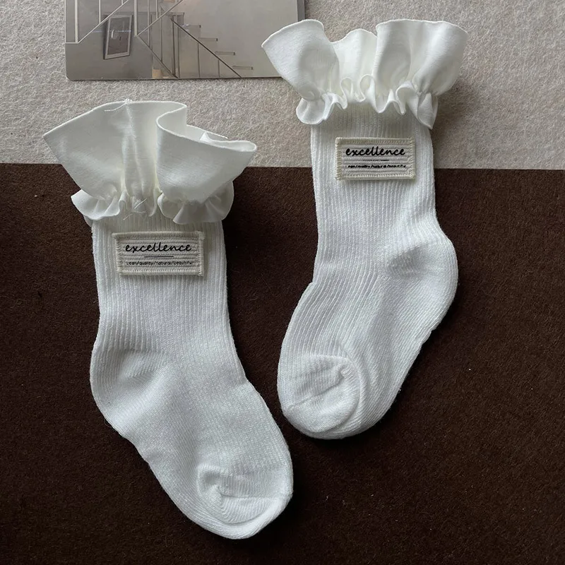 タグ付きラッフルフリルが可愛らしい、ベビーからジュニアまで対応のショートソックス。ブラックとホワイトの2色展開で、上品なプリンセススタイルを演出します。やわらかいコットン素材で履き心地抜群。おしゃれでありながらも実用的な一足です。
