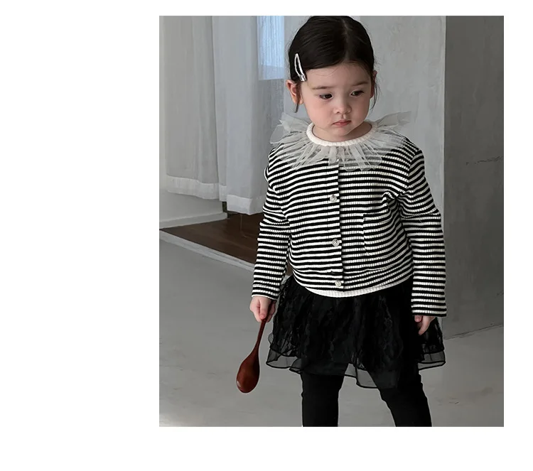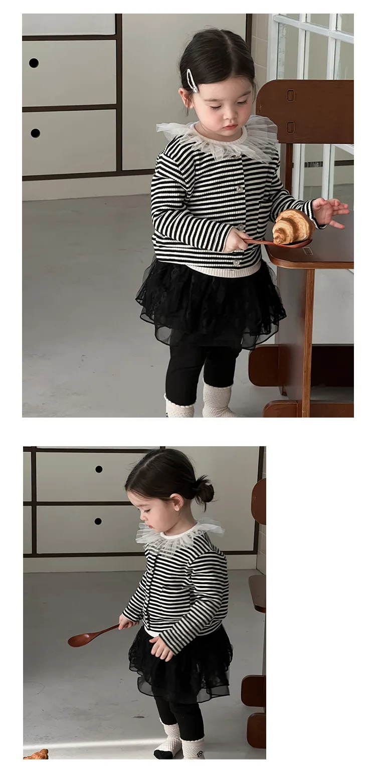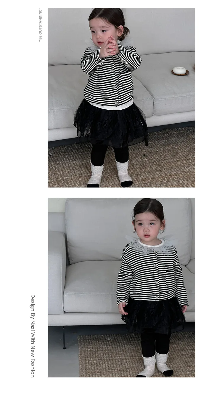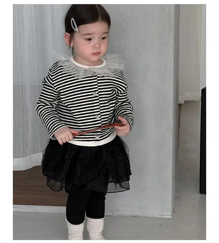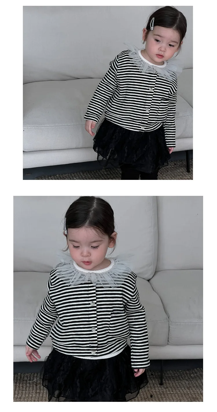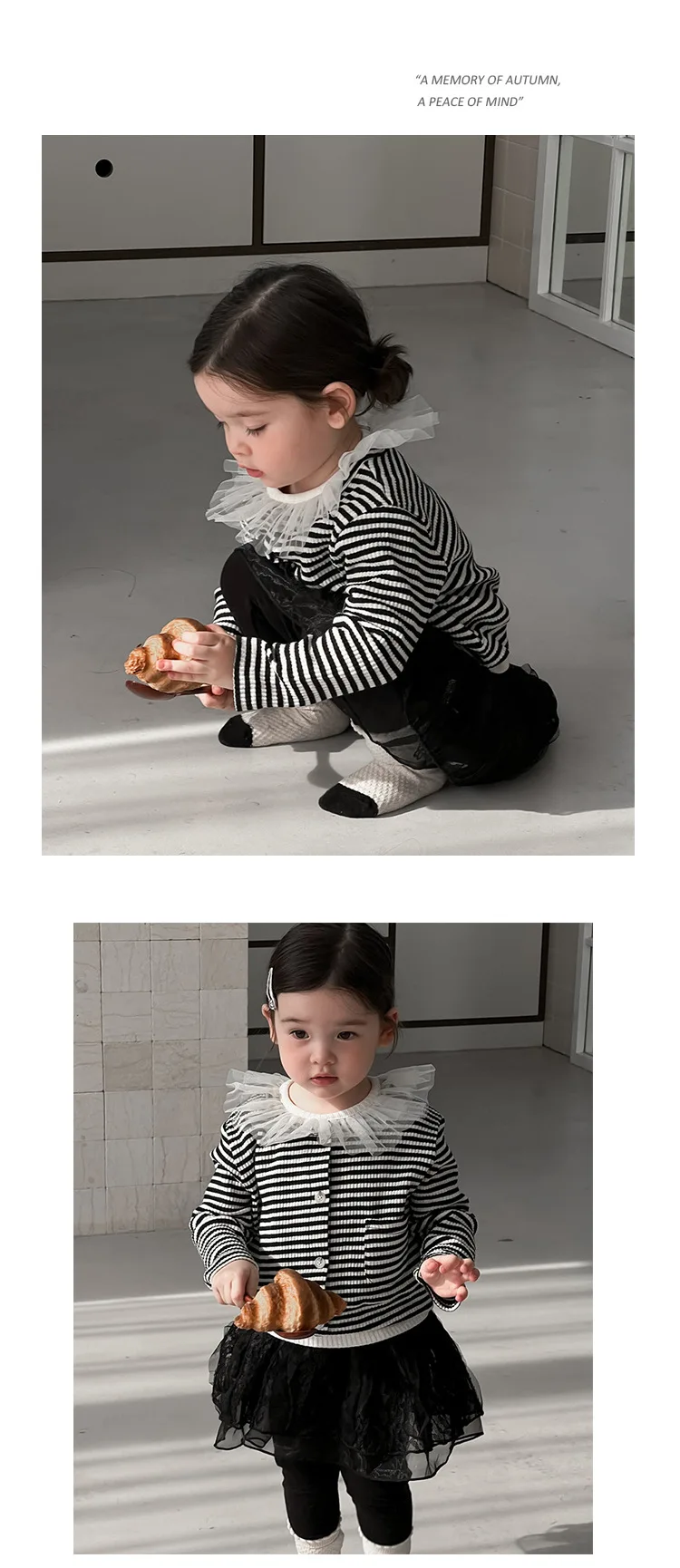 クラシックなボーダーデザインが魅力のベビーカーディガン。柔らかなコットン素材で作られており、赤ちゃんの肌にも優しい着心地です。長袖で、季節の変わり目にも快適に過ごせるこのニットジャケットは、カジュアルなスタイルにぴったり。シンプルながらもおしゃれなボーダーパターンが、どんなコーディネートにもマッチします。お出かけやデイリー使いに最適で、赤ちゃんの毎日のスタイルに取り入れやすい一枚です。
