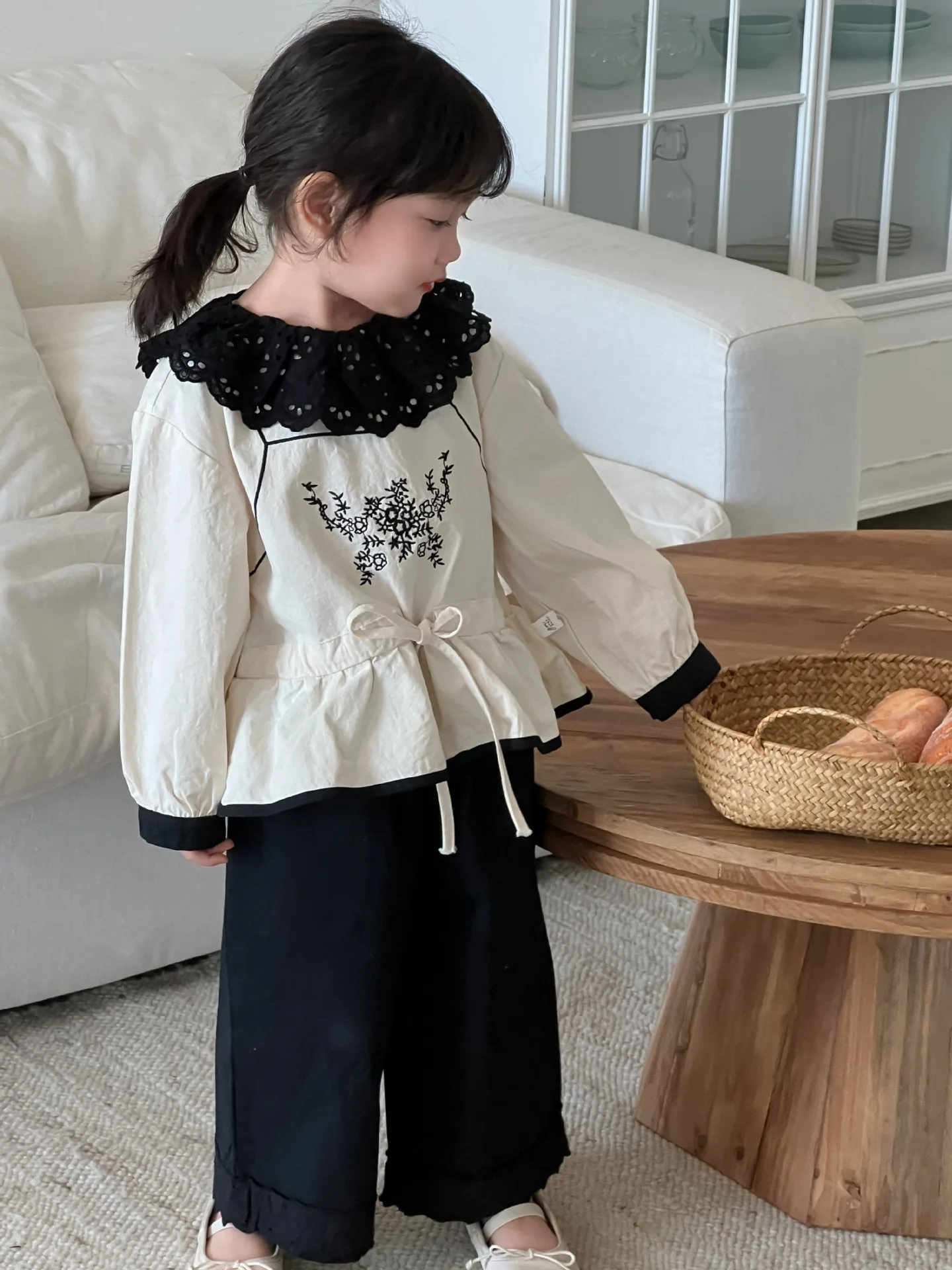 キッズトップス ラッフル襟フラワー刺繍チュニックブラウス/ロングフリルパンツ【mh0007315】