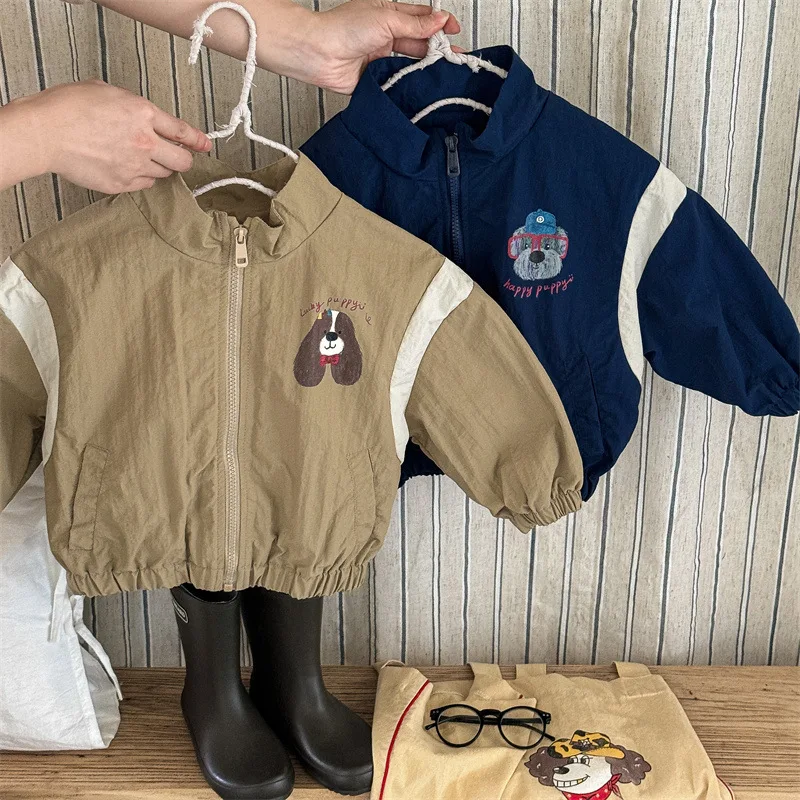 キッズアウター、パッチワーク切り替え犬ドッグジップアップブルゾンジャケットは、可愛らしい犬のデザインが特徴の一着です。ジッパー開閉タイプで着脱が簡単で、フード付きのデザインは実用性を高めています。軽量ながらも保温性があり、寒い季節にぴったりです。カジュアルなスタイルで、男の子にも女の子にも似合う2色展開で、普段着やお出かけにも適したアイテムです。