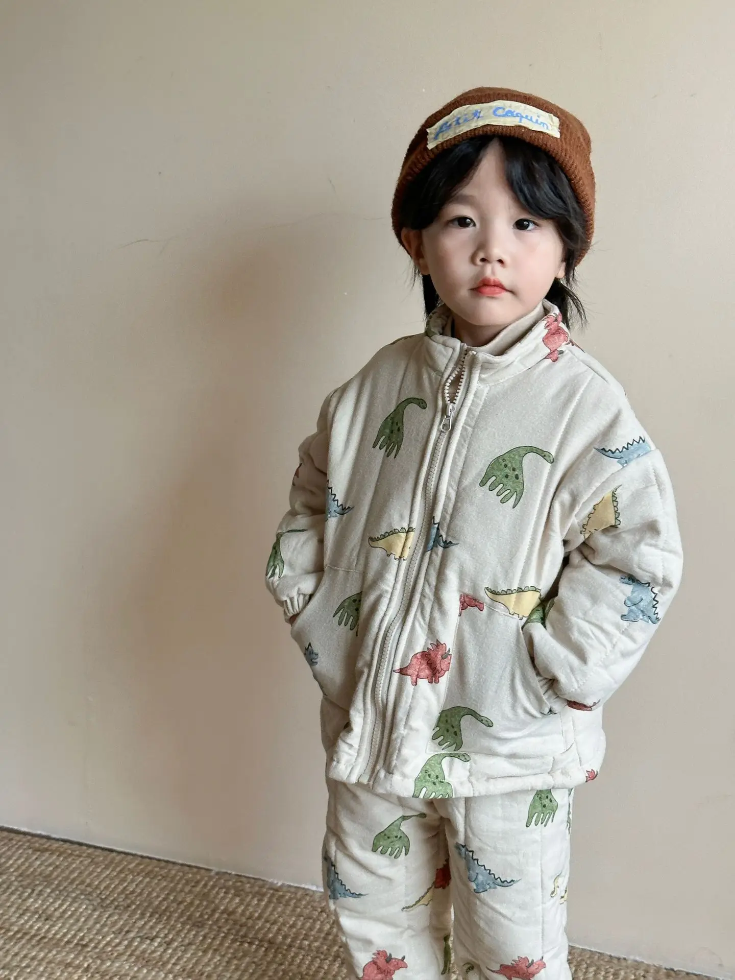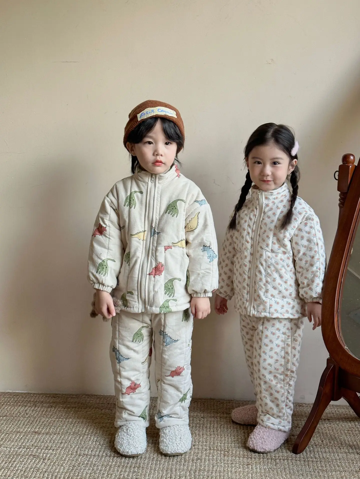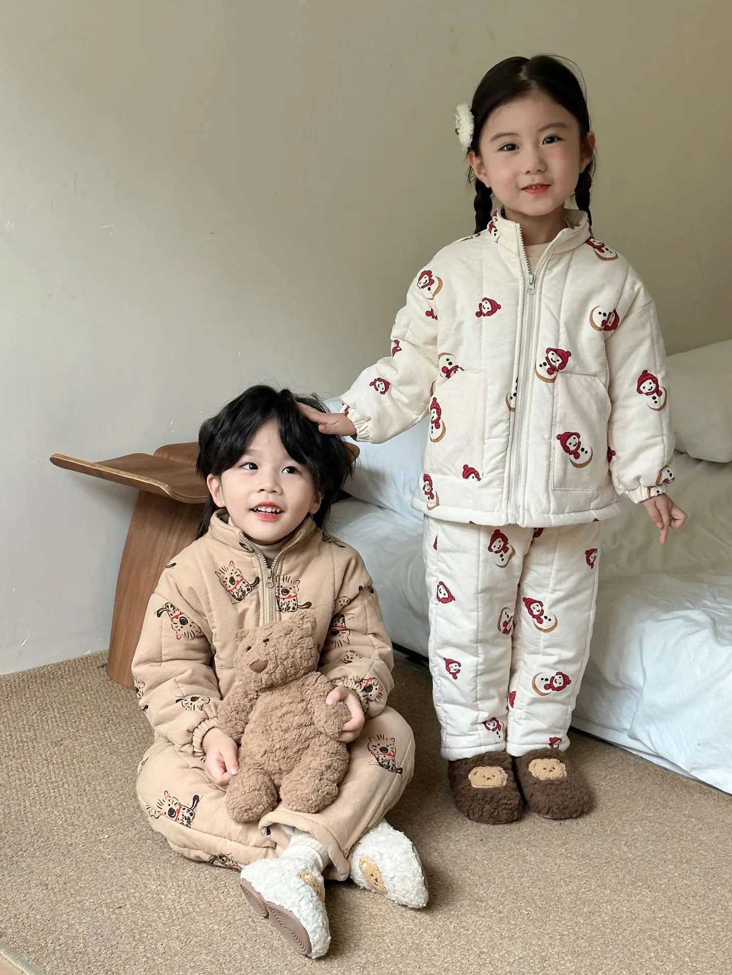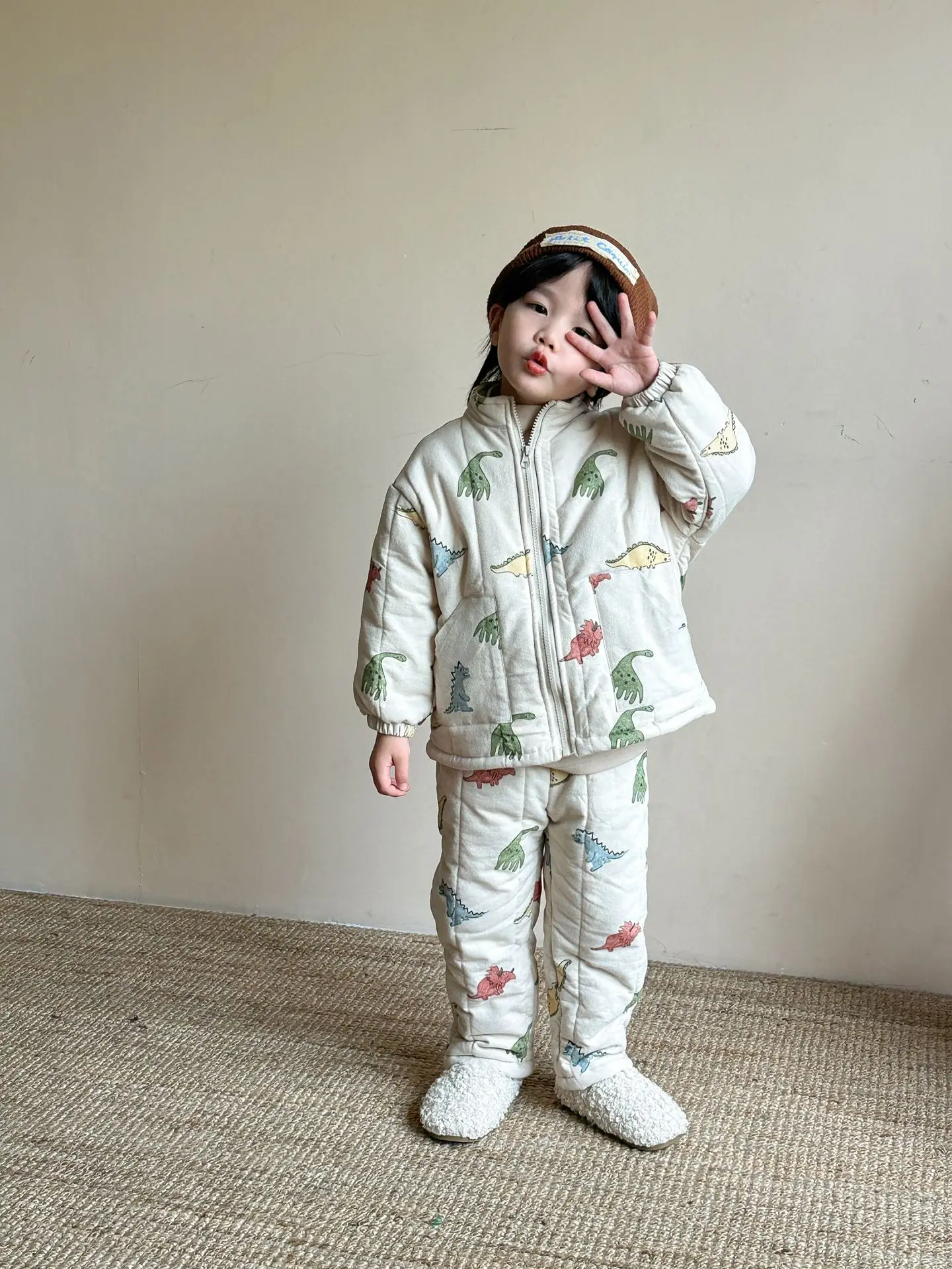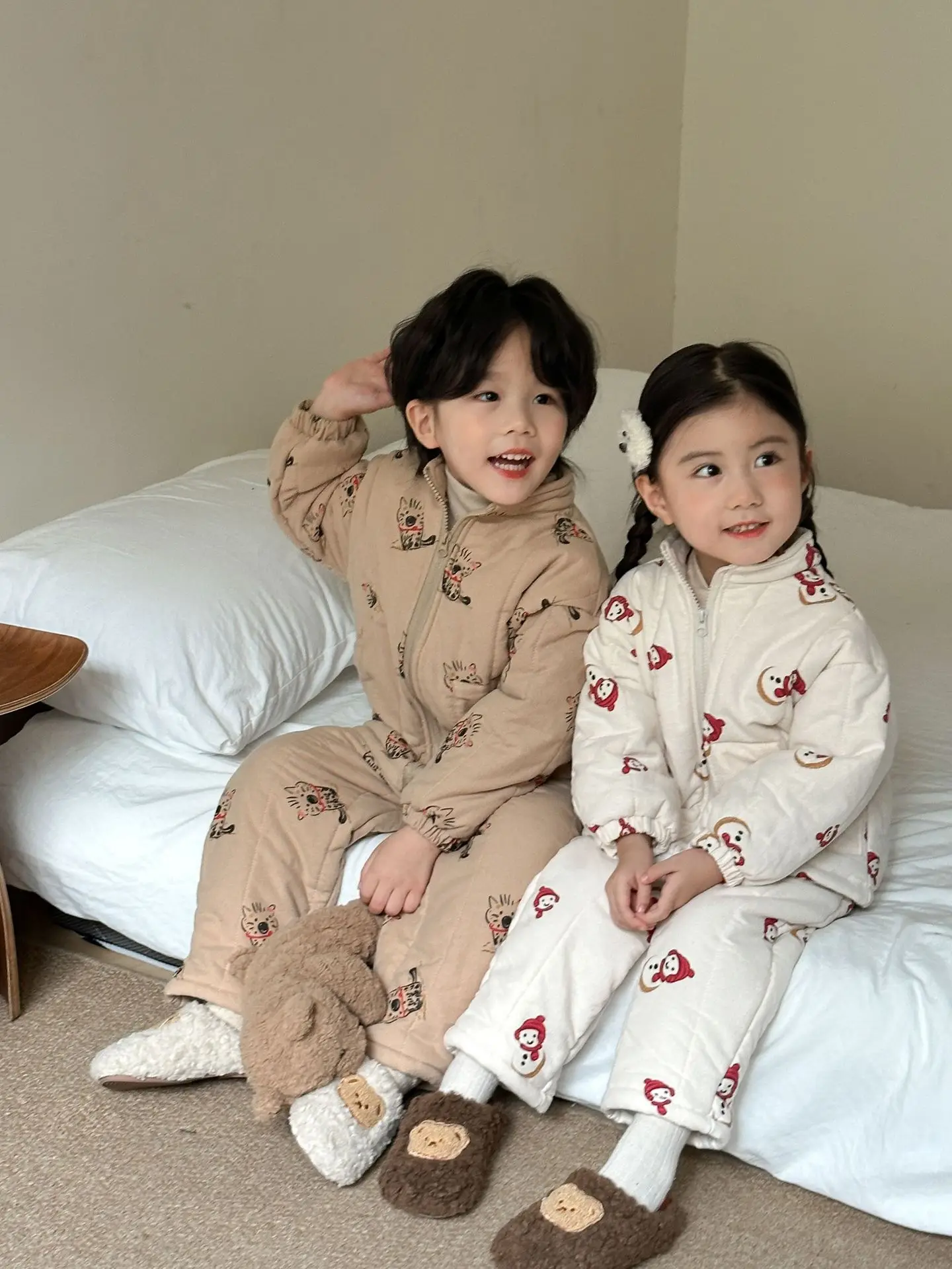 裏フリース仕様のジップアップジャケットとロングパンツの2点セットは、寒い季節にぴったりのキッズ用ルームウェア・パジャマセットです。厚手のフリース素材が全身を暖かく包み込み、快適な着心地を提供します。ジャケットはジップアップで着脱が簡単で、動きやすいデザイン。可愛らしいプリントがアクセントとなり、男の子にも女の子にも似合うユニセックスなデザインです。おうち時間や就寝時にぴったりの、リラックス感あふれる冬用セットアップです。