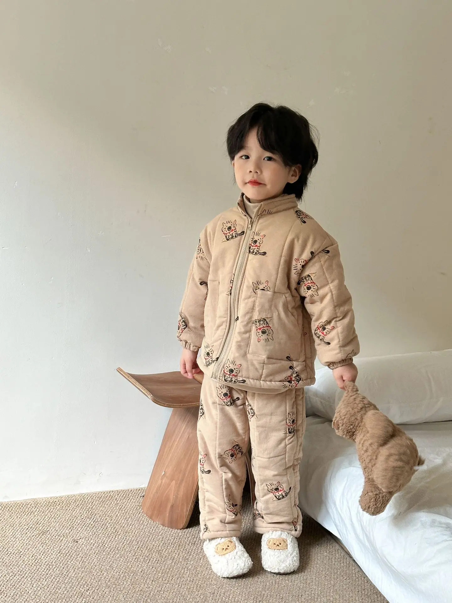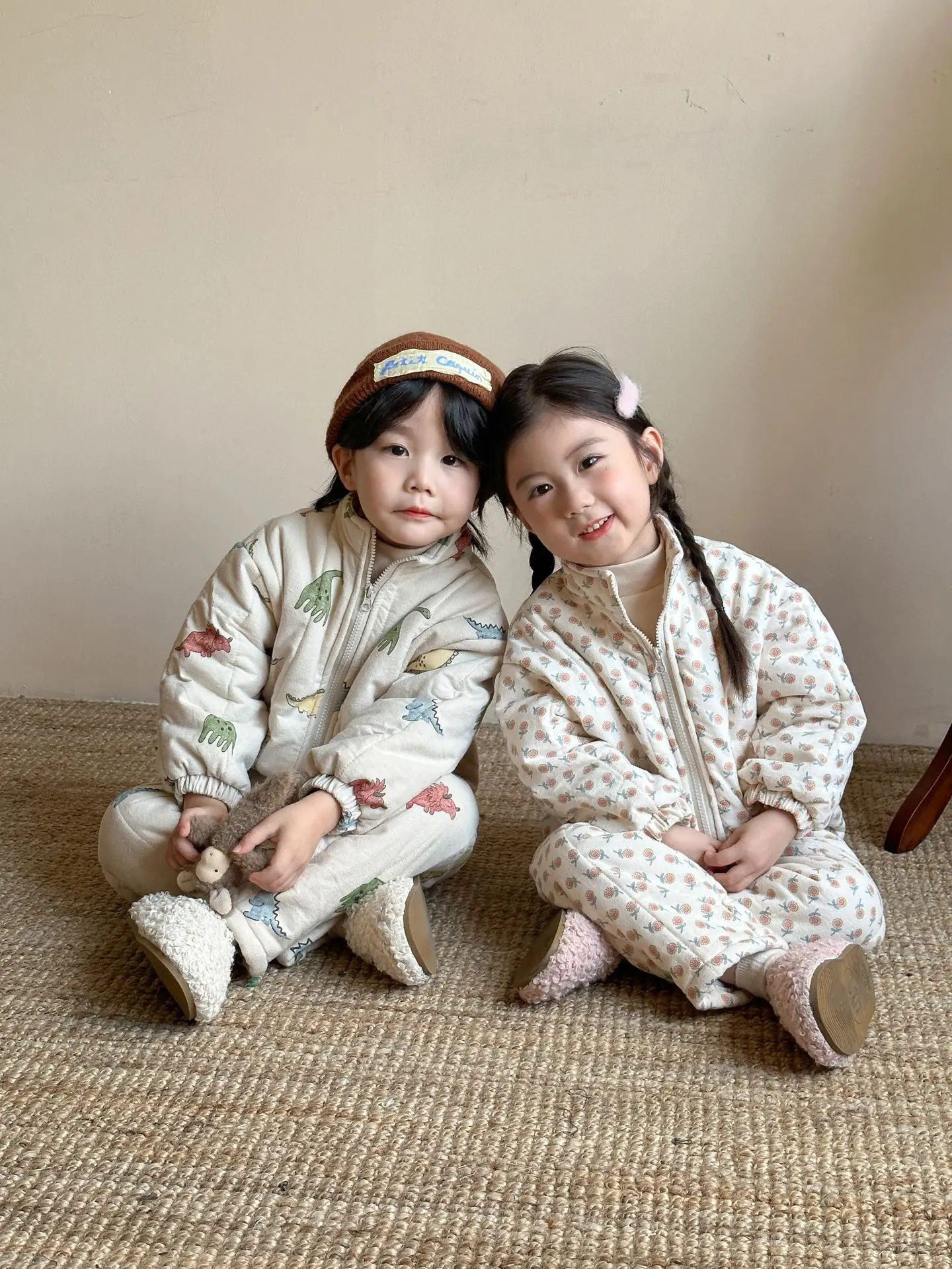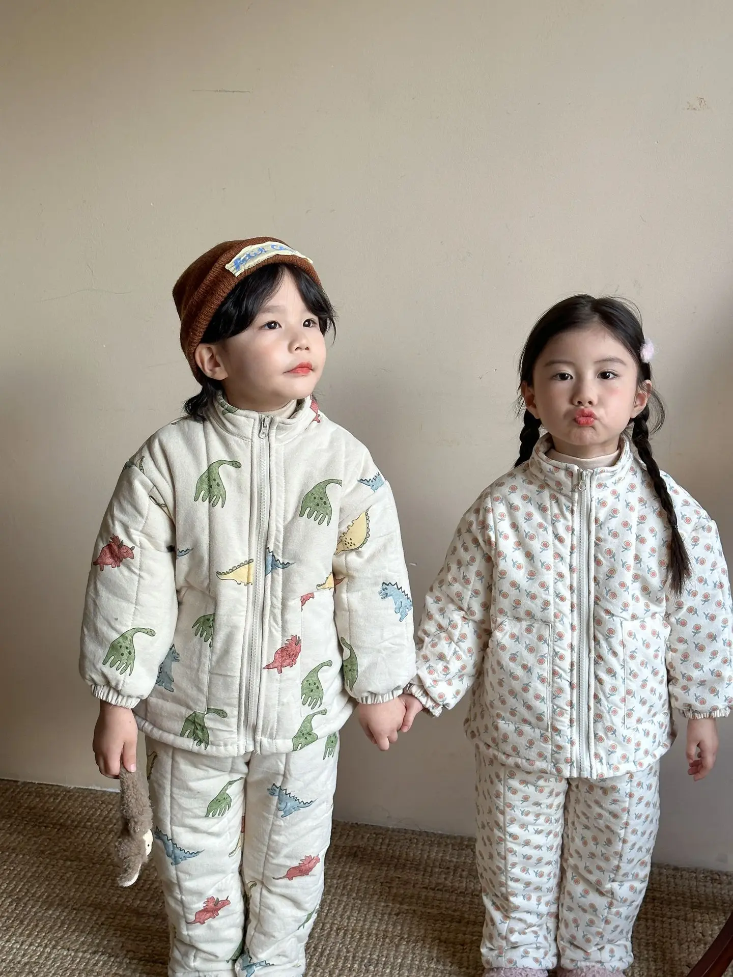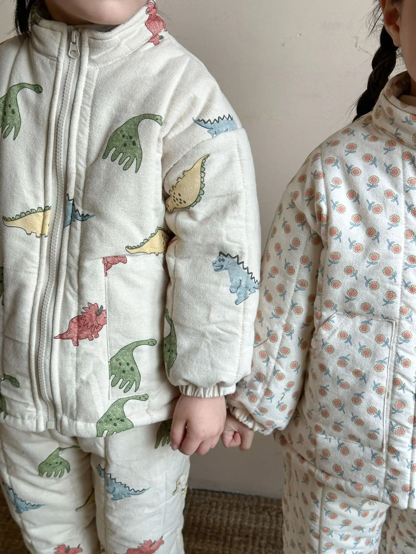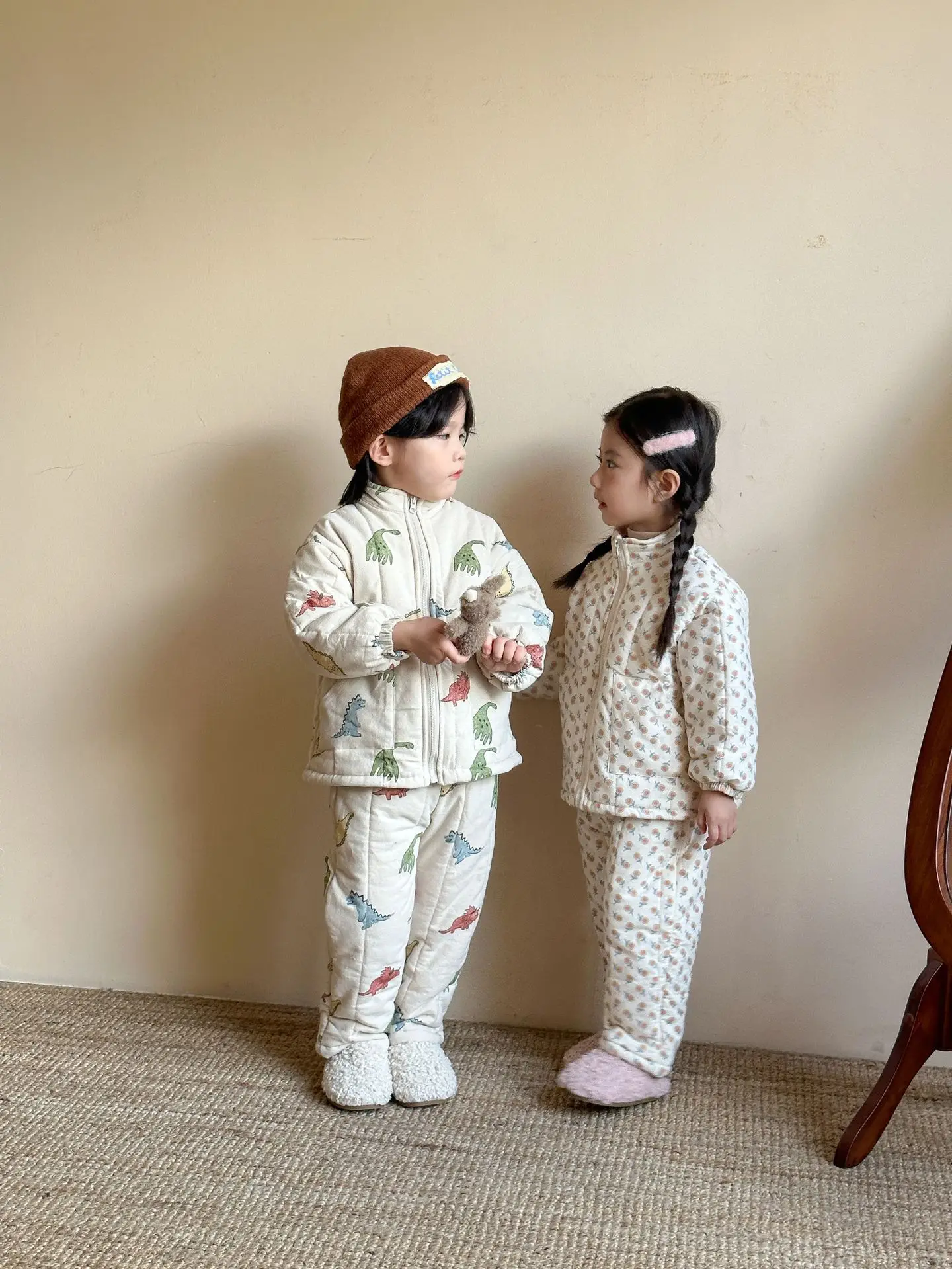 裏フリース仕様のジップアップジャケットとロングパンツの2点セットは、寒い季節にぴったりのキッズ用ルームウェア・パジャマセットです。厚手のフリース素材が全身を暖かく包み込み、快適な着心地を提供します。ジャケットはジップアップで着脱が簡単で、動きやすいデザイン。可愛らしいプリントがアクセントとなり、男の子にも女の子にも似合うユニセックスなデザインです。おうち時間や就寝時にぴったりの、リラックス感あふれる冬用セットアップです。