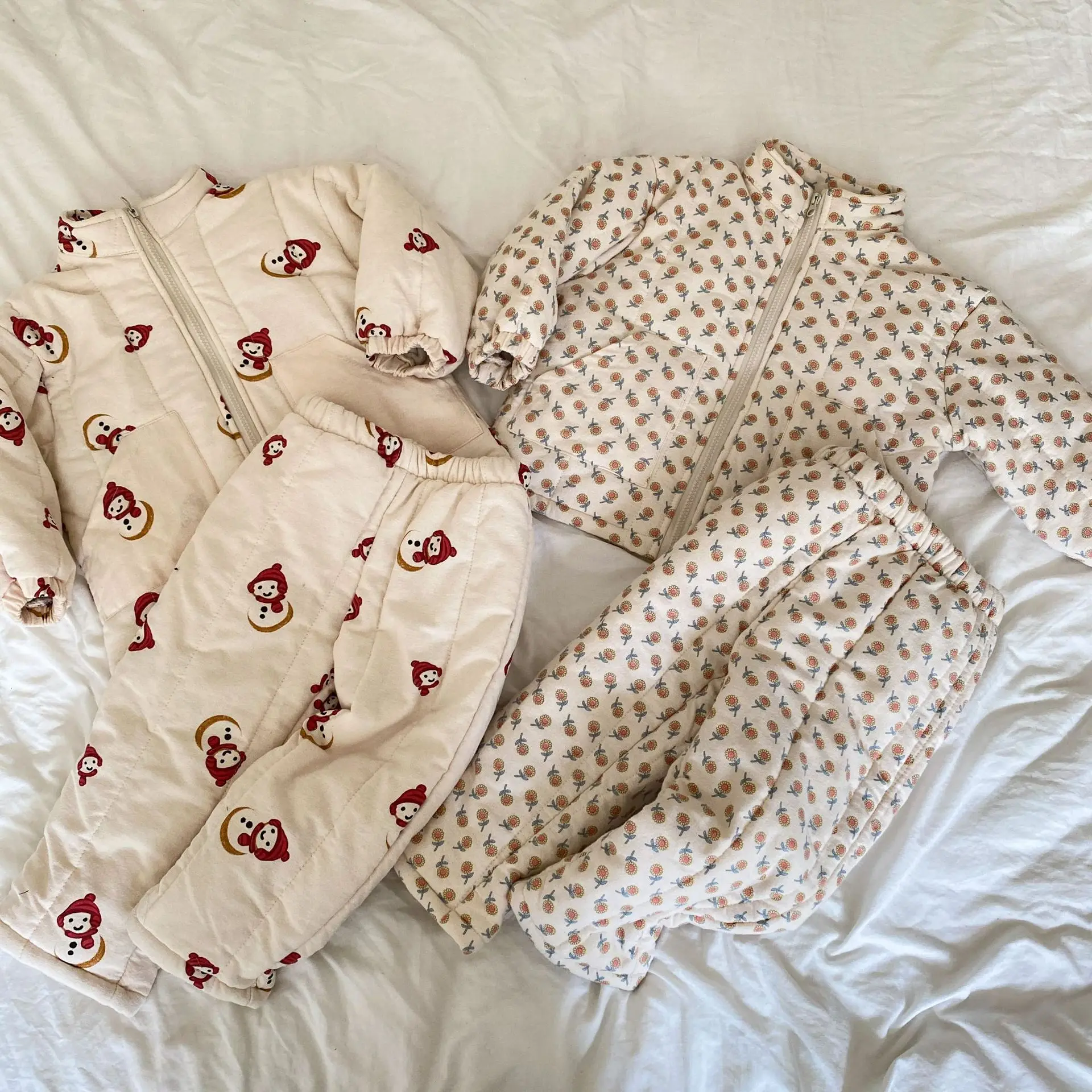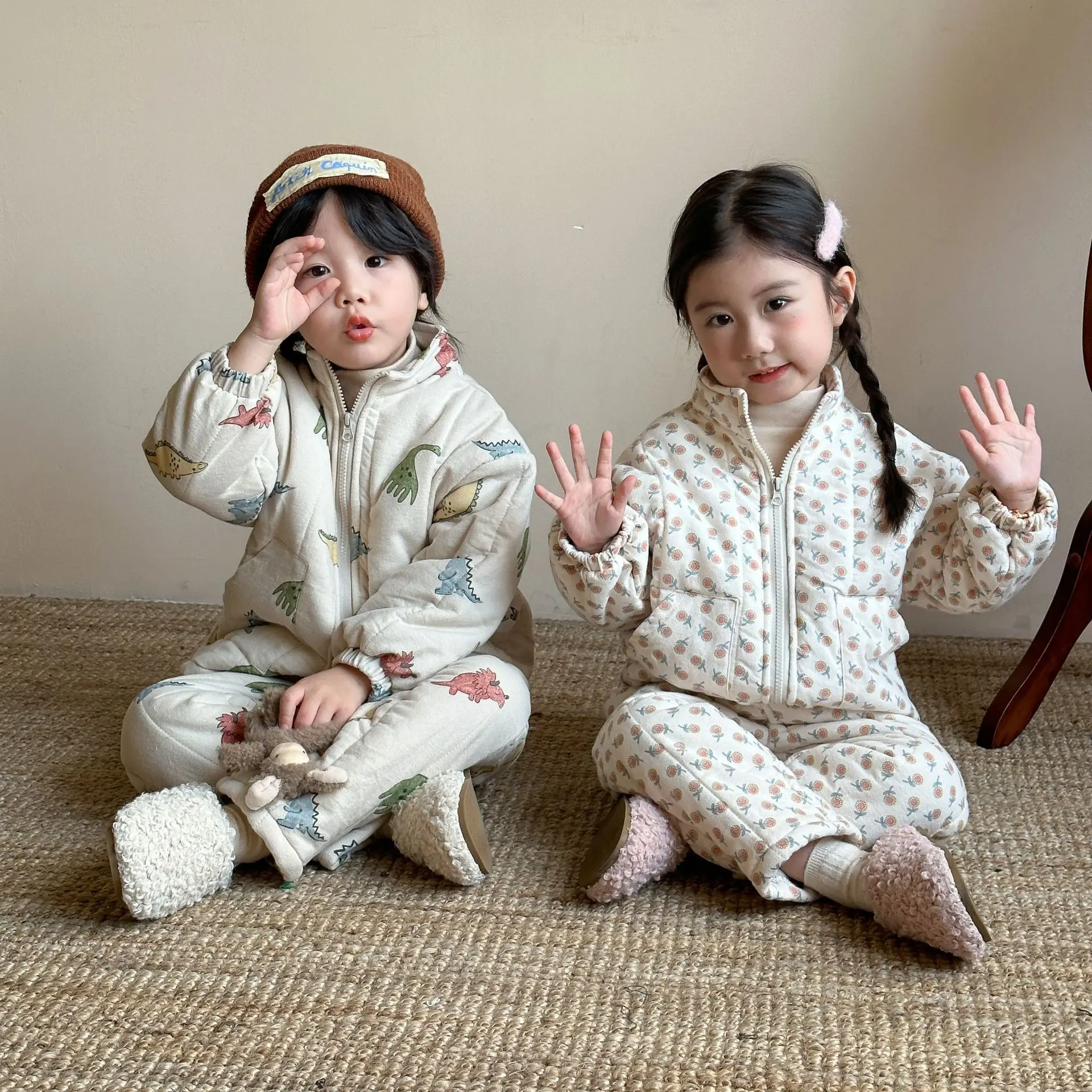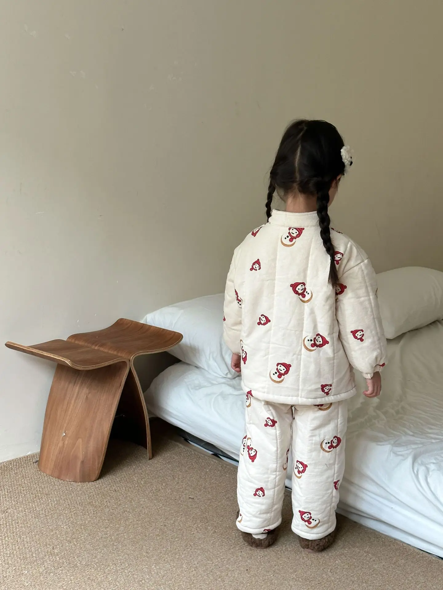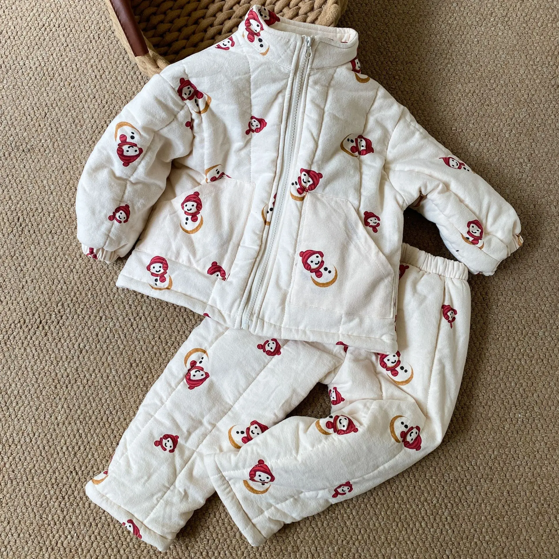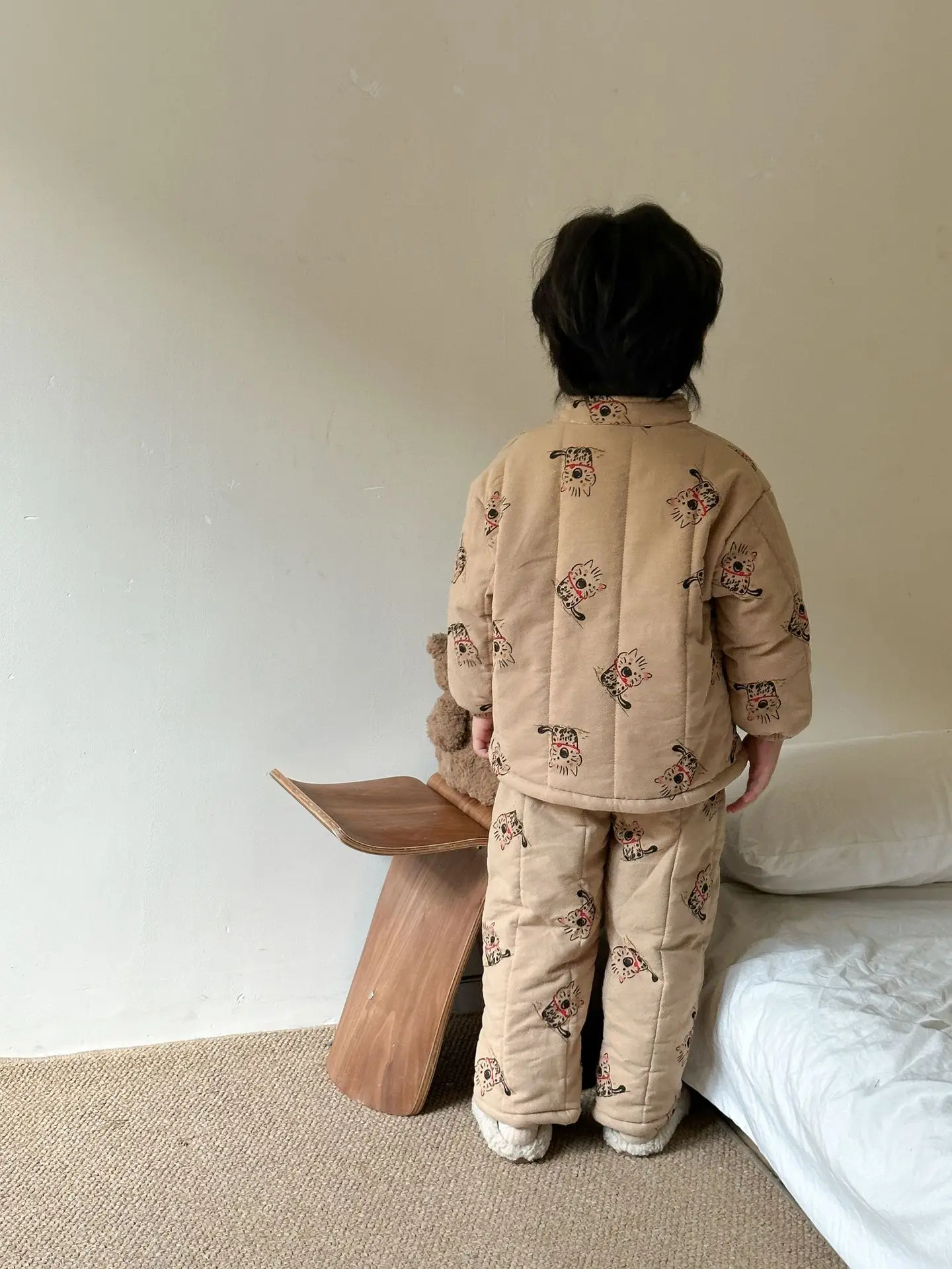 裏フリース仕様のジップアップジャケットとロングパンツの2点セットは、寒い季節にぴったりのキッズ用ルームウェア・パジャマセットです。厚手のフリース素材が全身を暖かく包み込み、快適な着心地を提供します。ジャケットはジップアップで着脱が簡単で、動きやすいデザイン。可愛らしいプリントがアクセントとなり、男の子にも女の子にも似合うユニセックスなデザインです。おうち時間や就寝時にぴったりの、リラックス感あふれる冬用セットアップです。