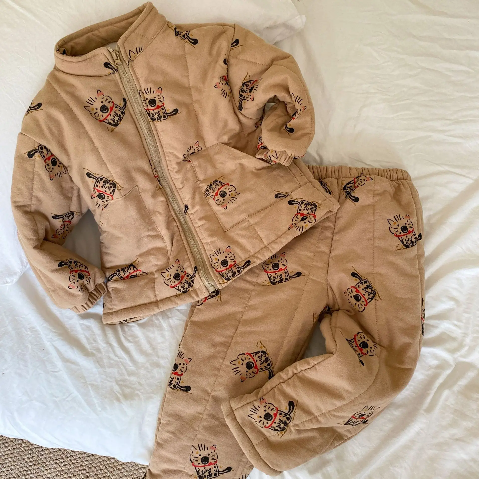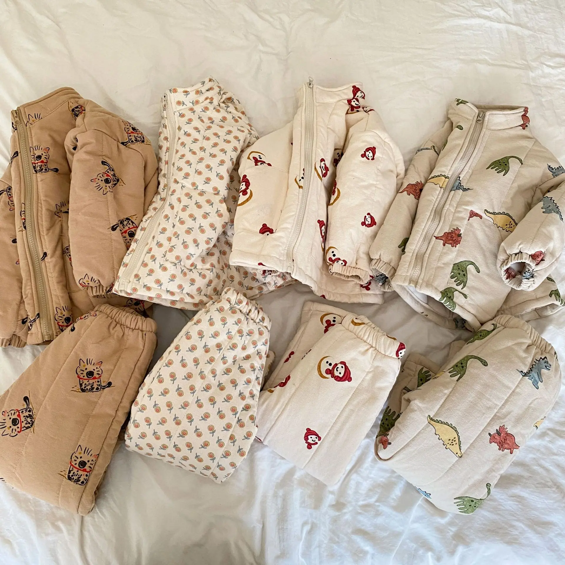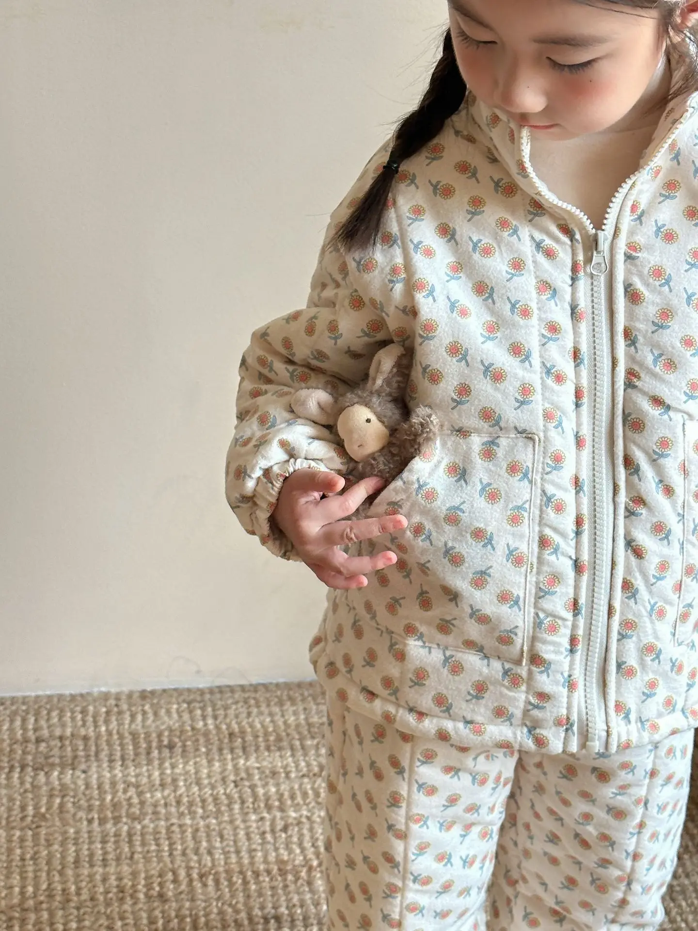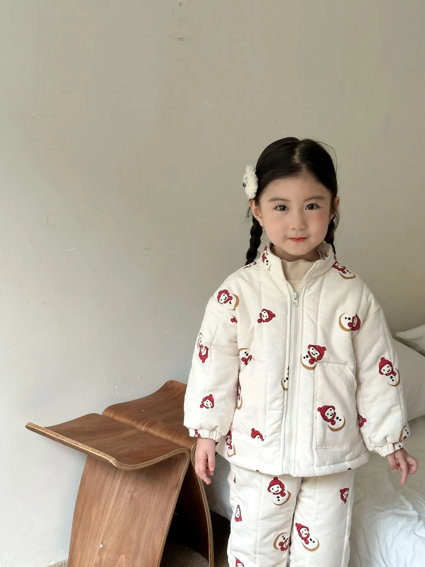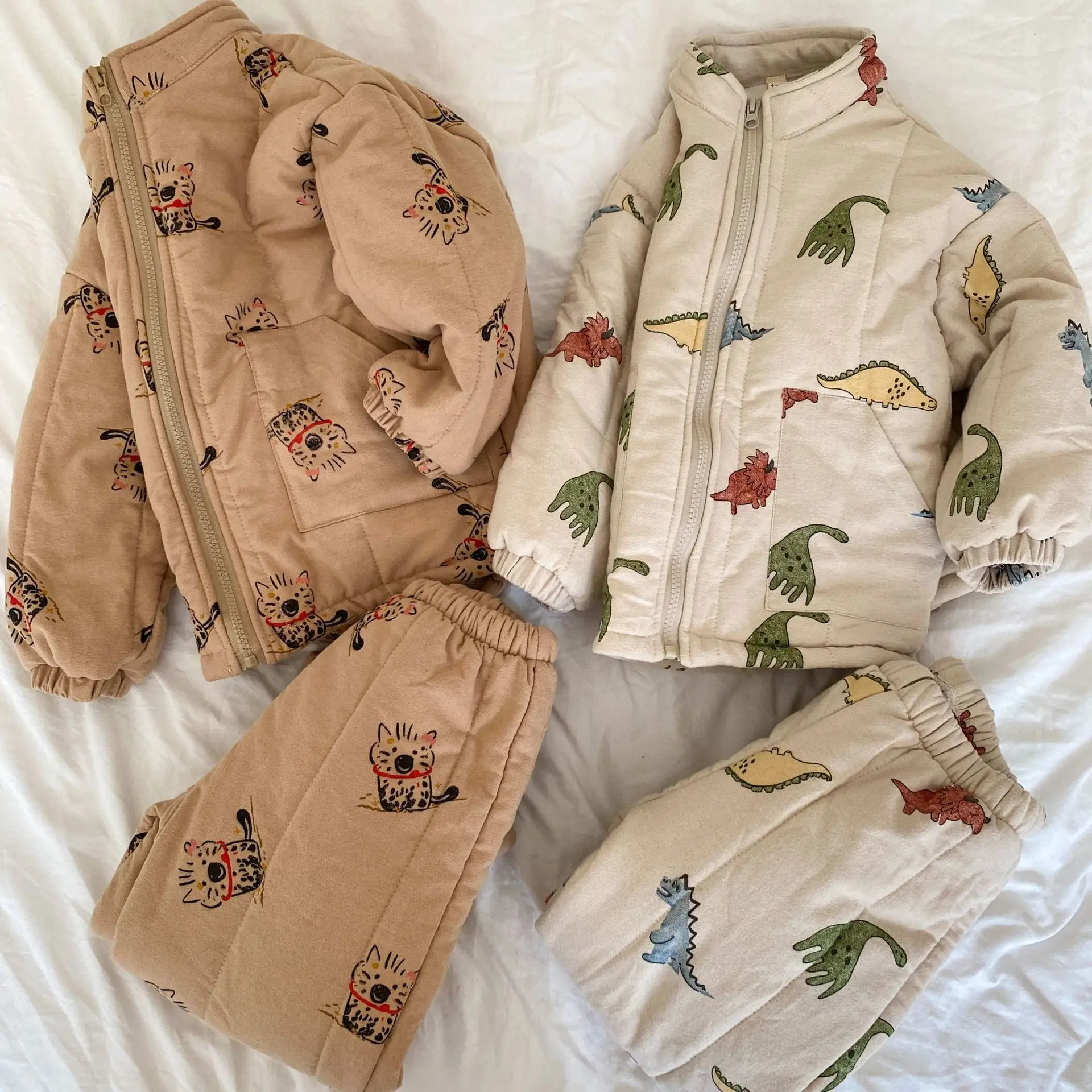 裏フリース仕様のジップアップジャケットとロングパンツの2点セットは、寒い季節にぴったりのキッズ用ルームウェア・パジャマセットです。厚手のフリース素材が全身を暖かく包み込み、快適な着心地を提供します。ジャケットはジップアップで着脱が簡単で、動きやすいデザイン。可愛らしいプリントがアクセントとなり、男の子にも女の子にも似合うユニセックスなデザインです。おうち時間や就寝時にぴったりの、リラックス感あふれる冬用セットアップです。