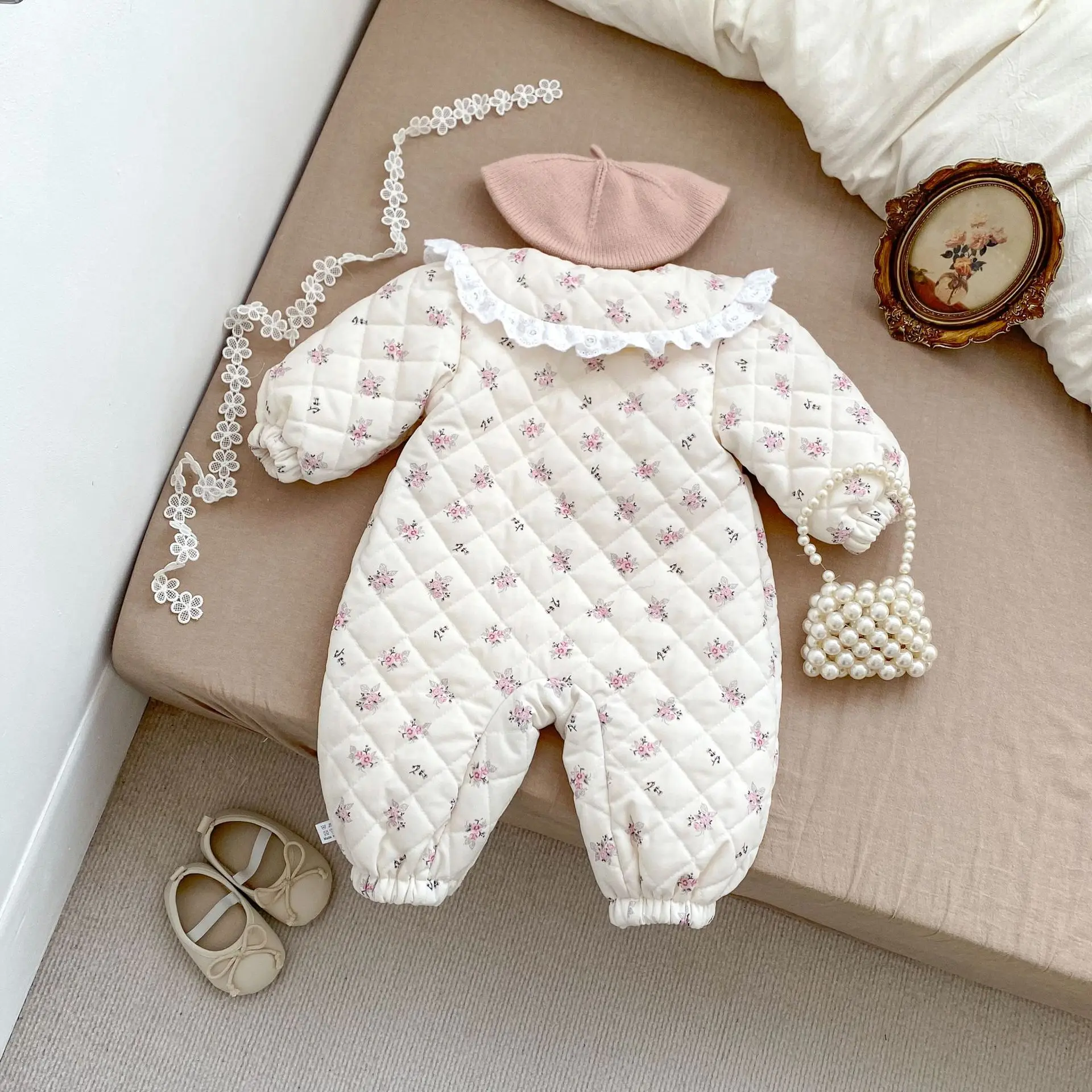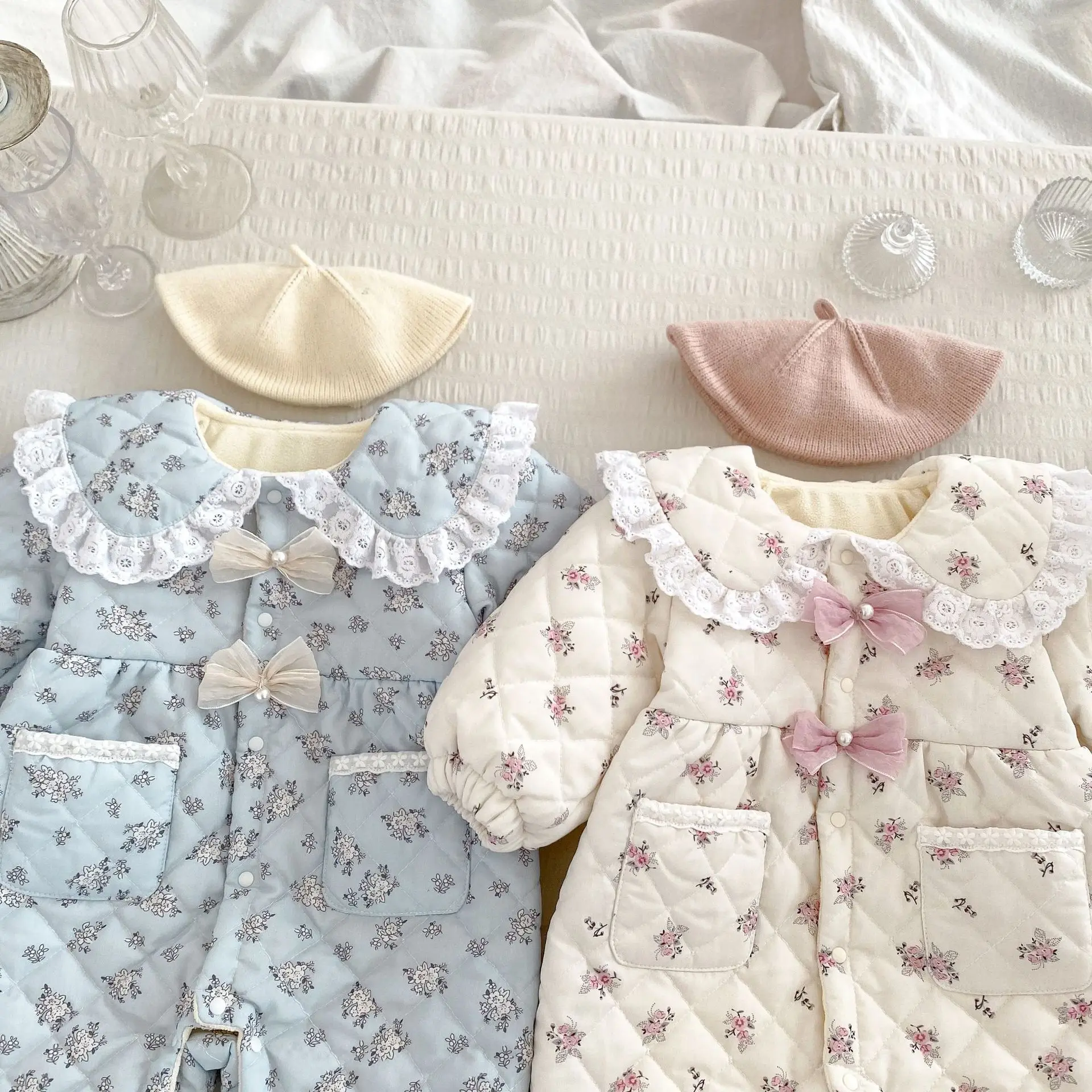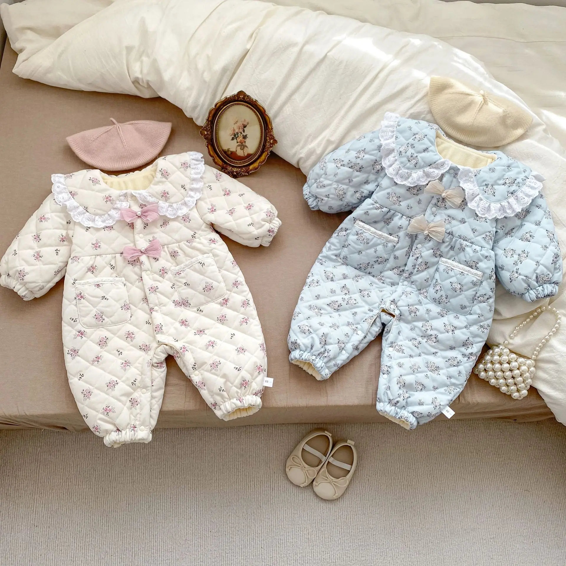 ベビーアウタージャンプスーツ フラワープリントフリルレース襟リボンキルティングパデッド長袖ロンパース【mh0007871】