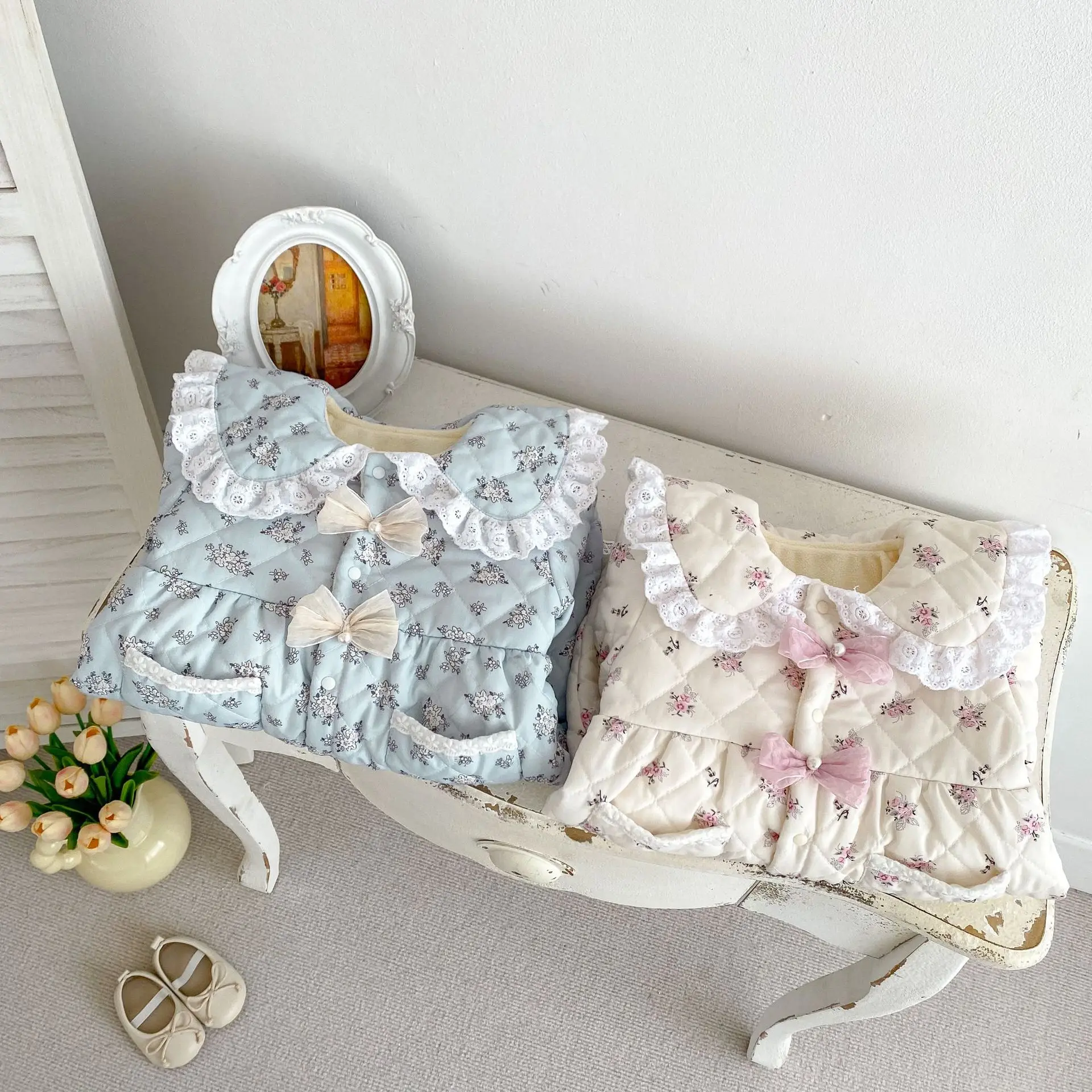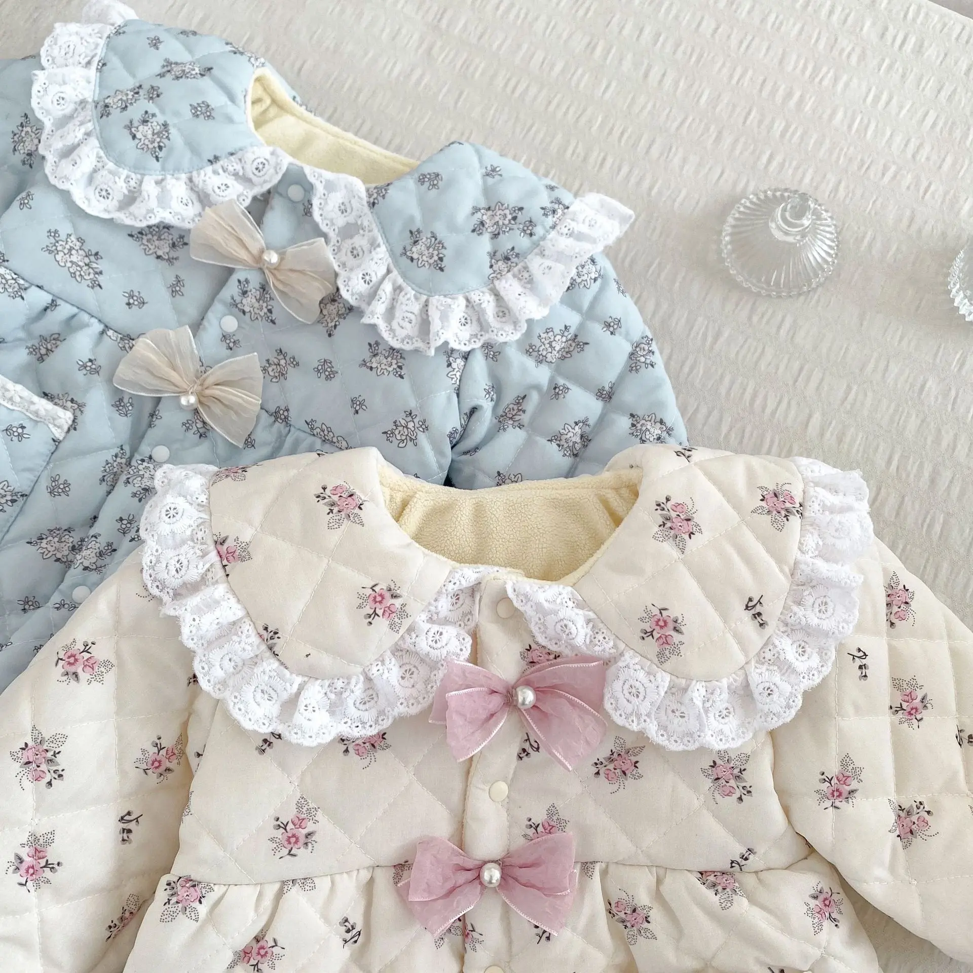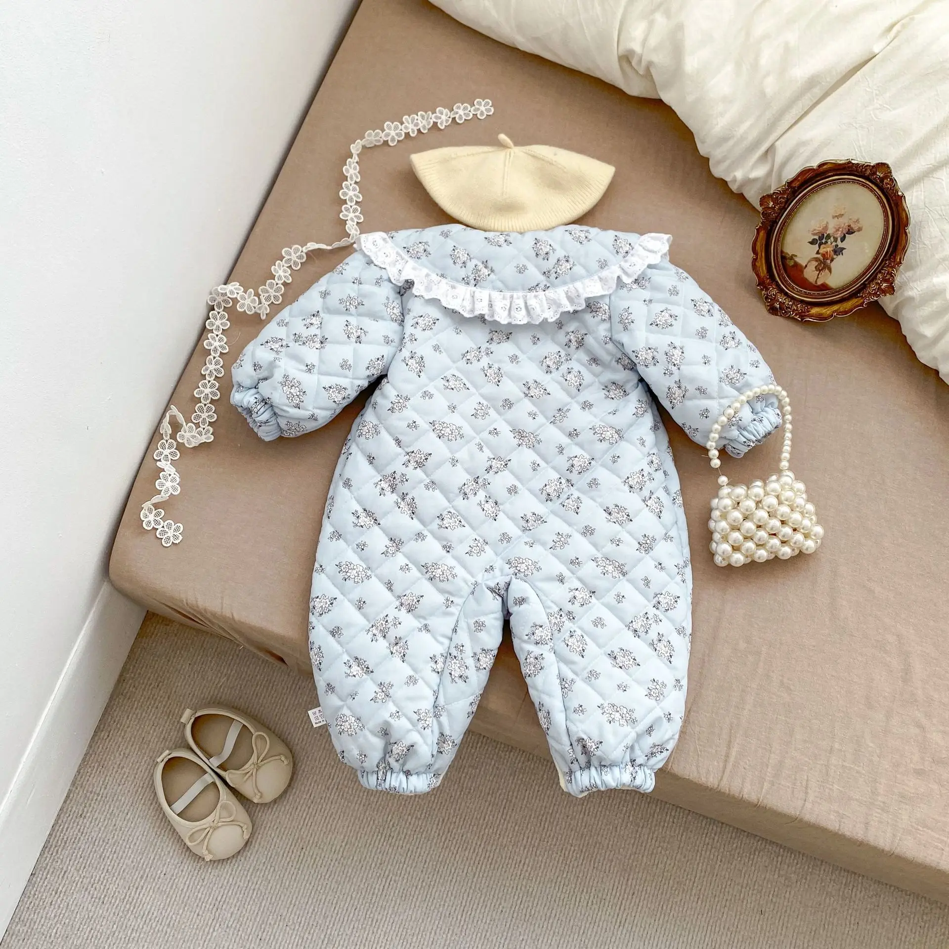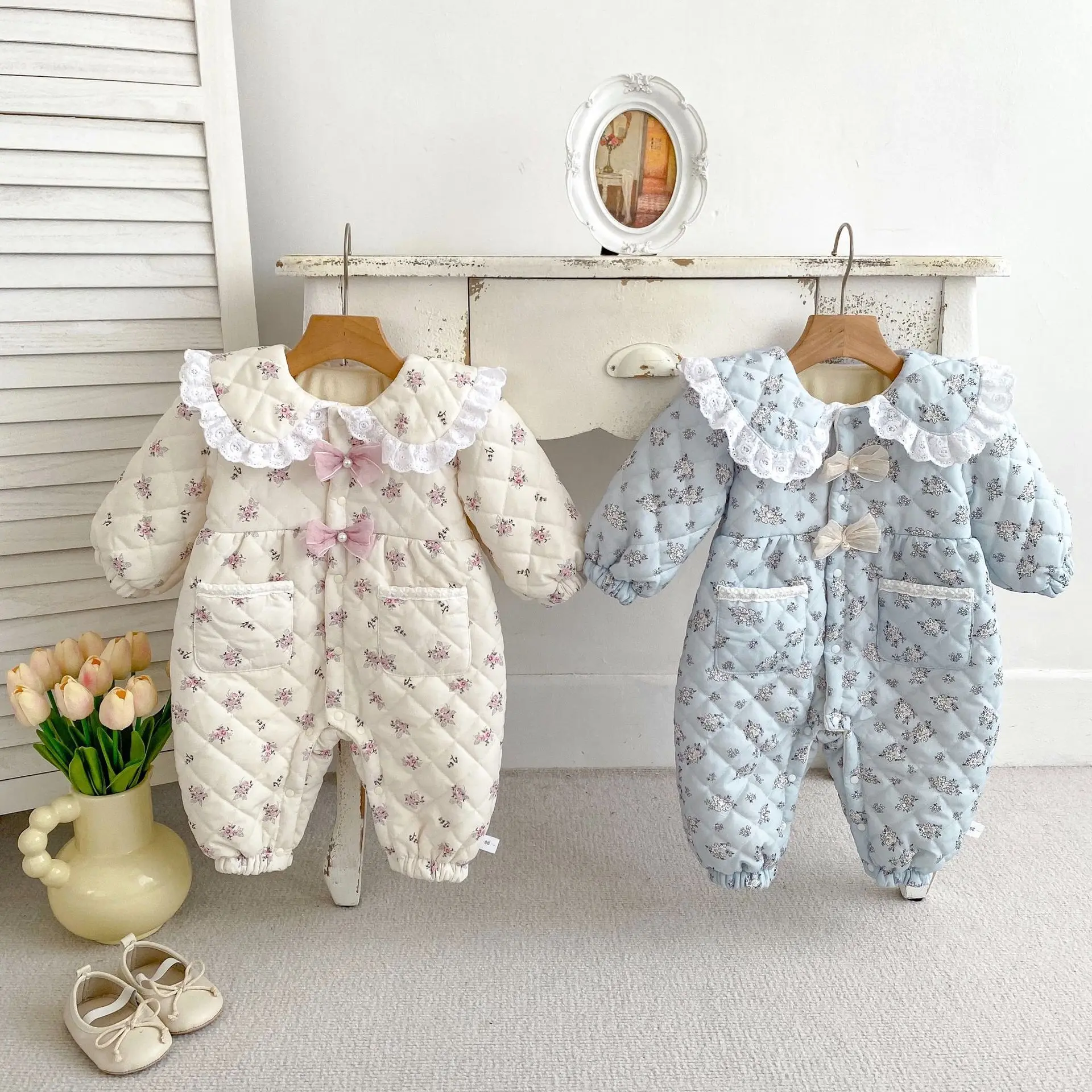 ベビーアウタージャンプスーツ フラワープリントフリルレース襟リボンキルティングパデッド長袖ロンパース【mh0007871】