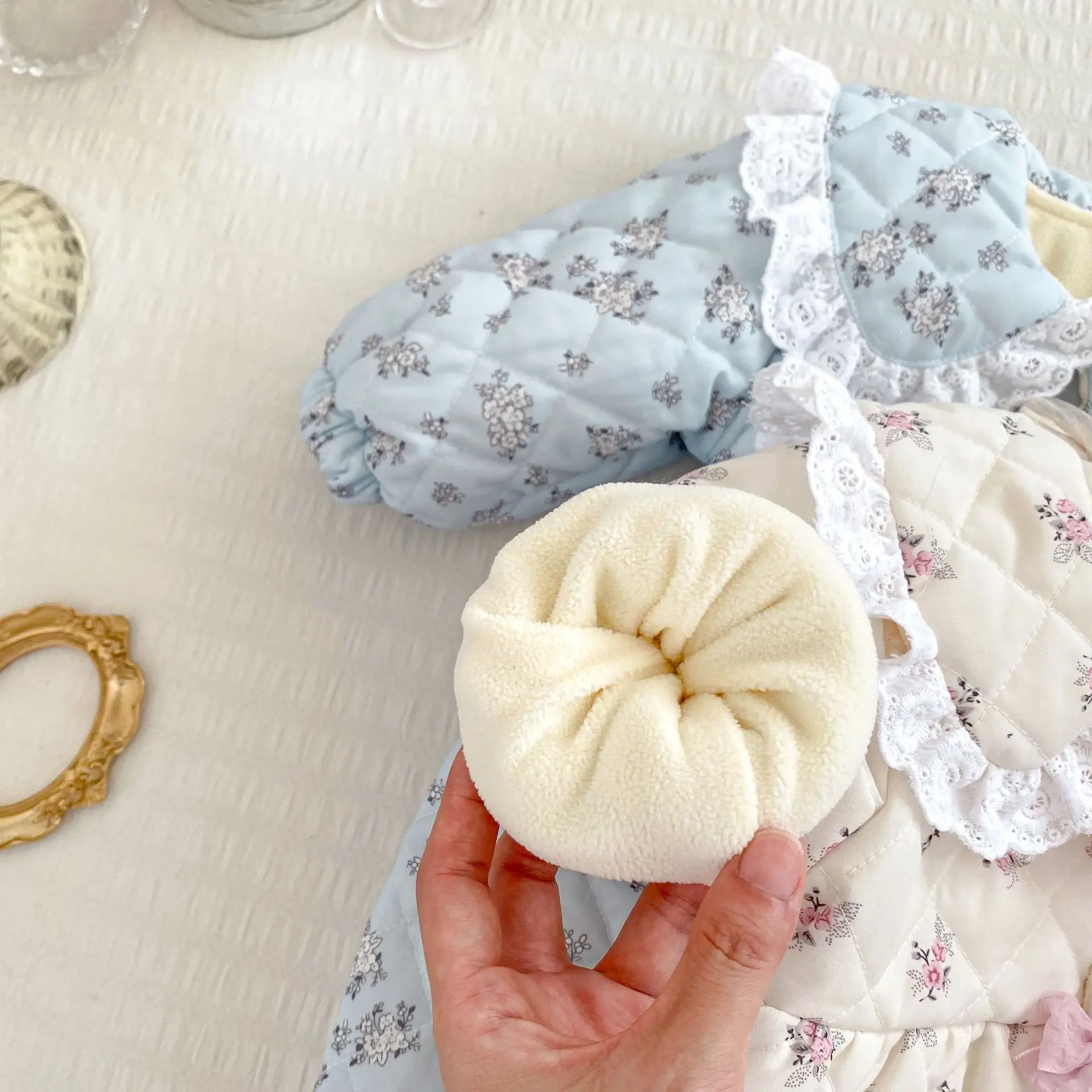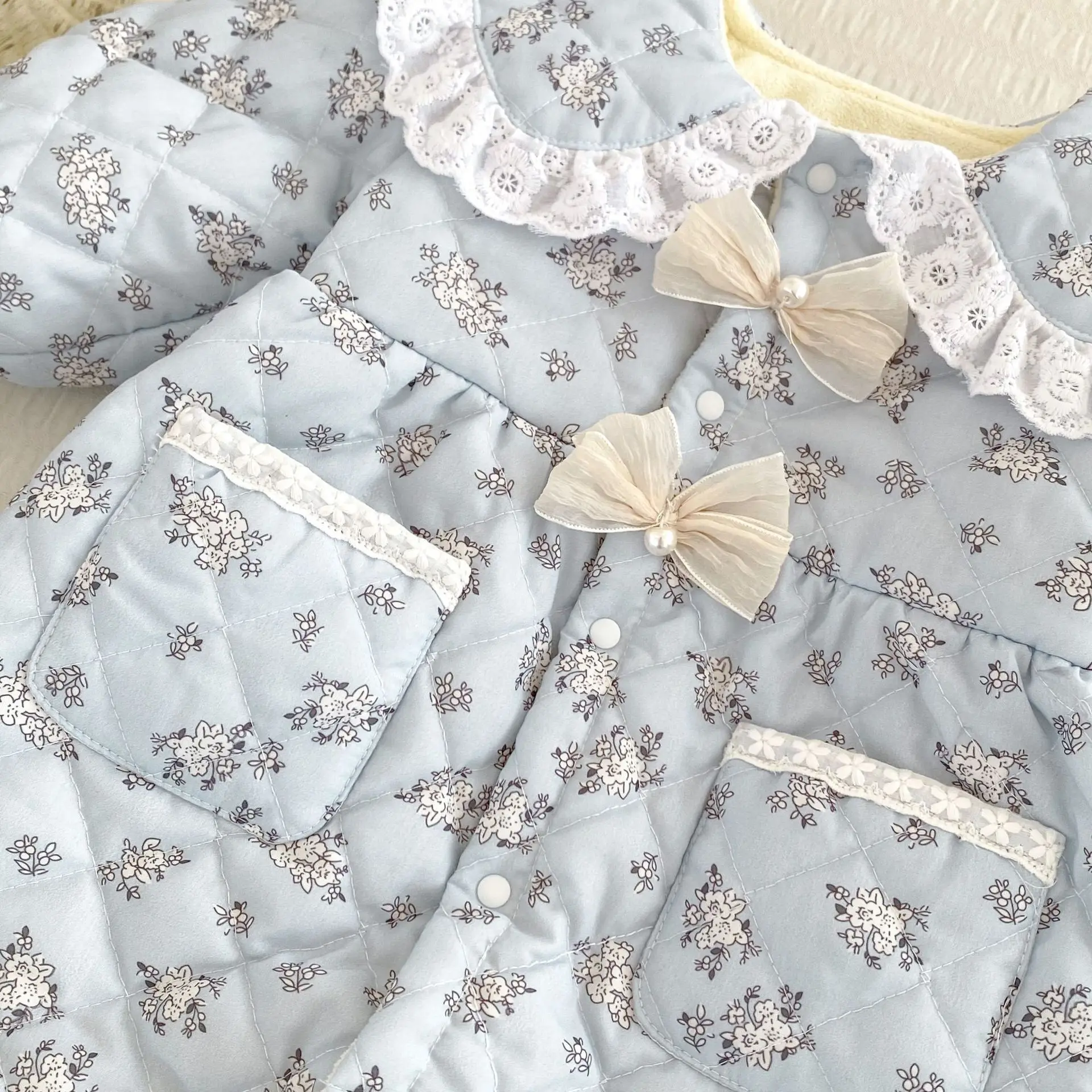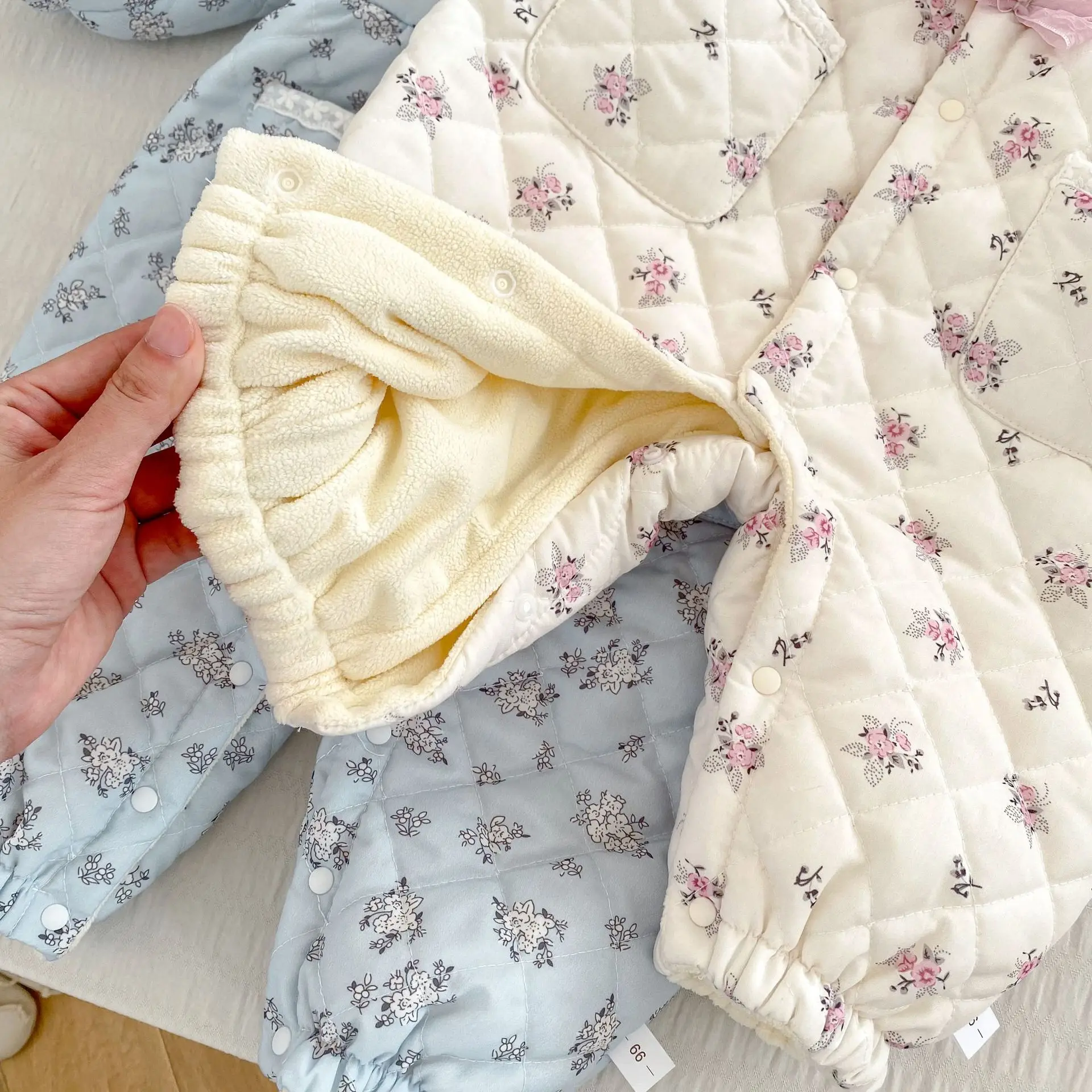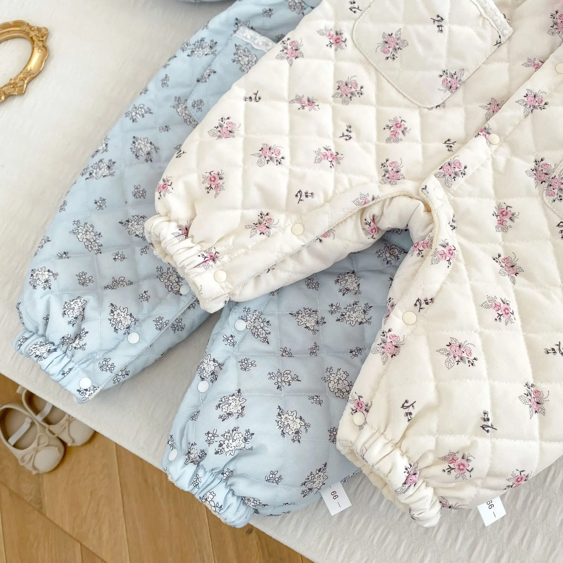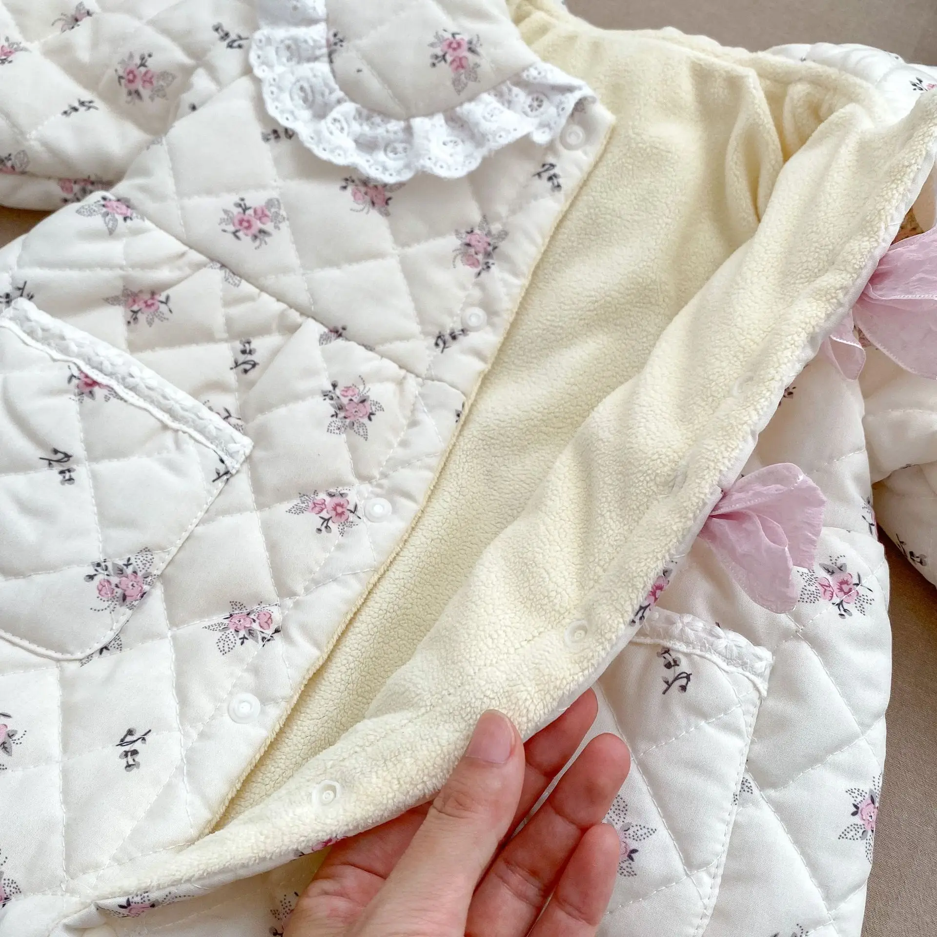#ベビーアウター #フラワープリント #ロンパース #キルティング #フリル襟 #リボン #冬のベビー服 #暖かいロンパース