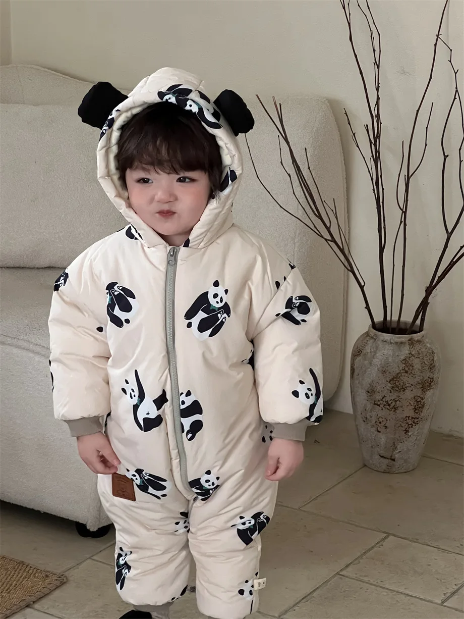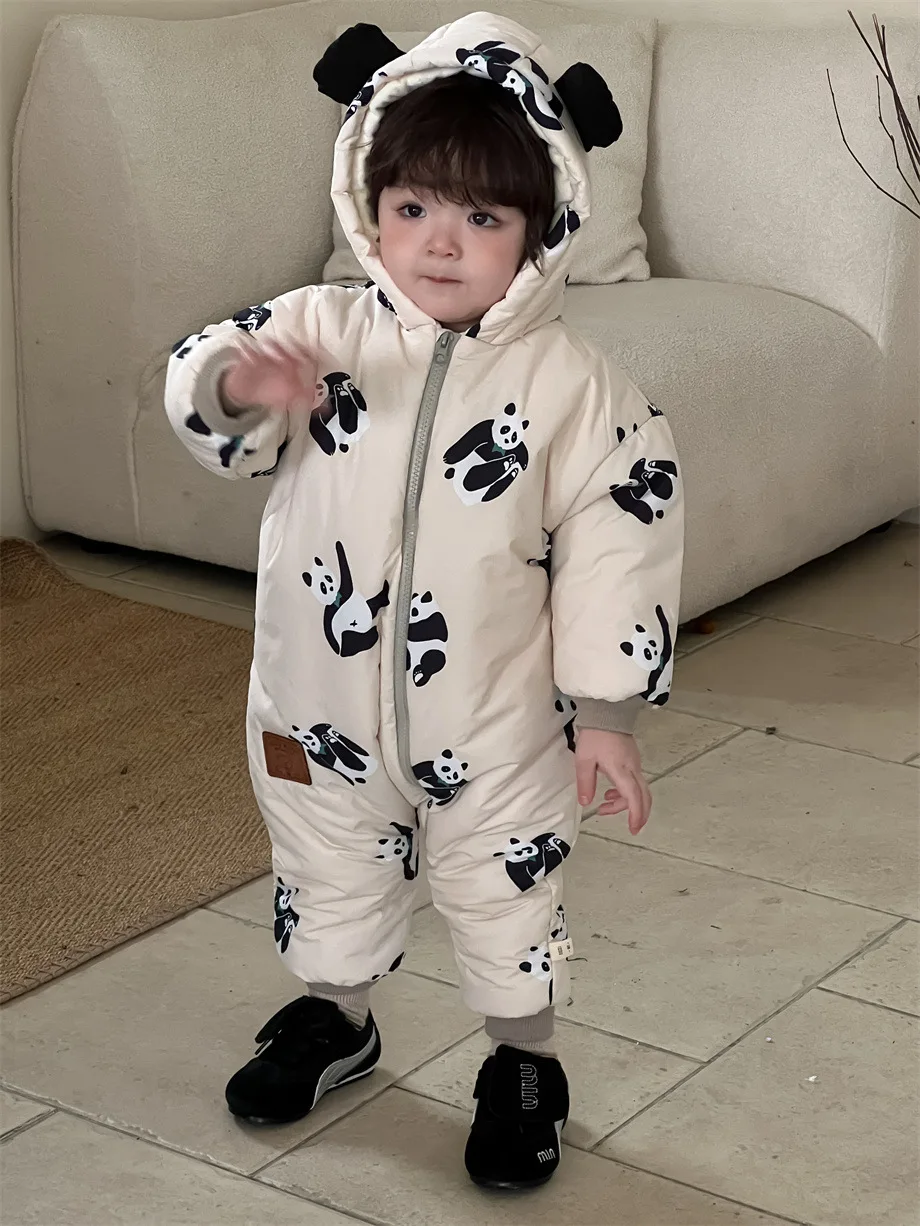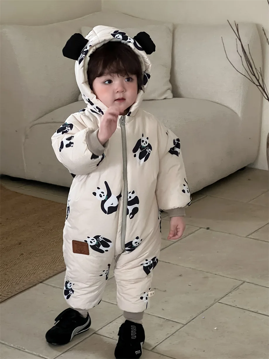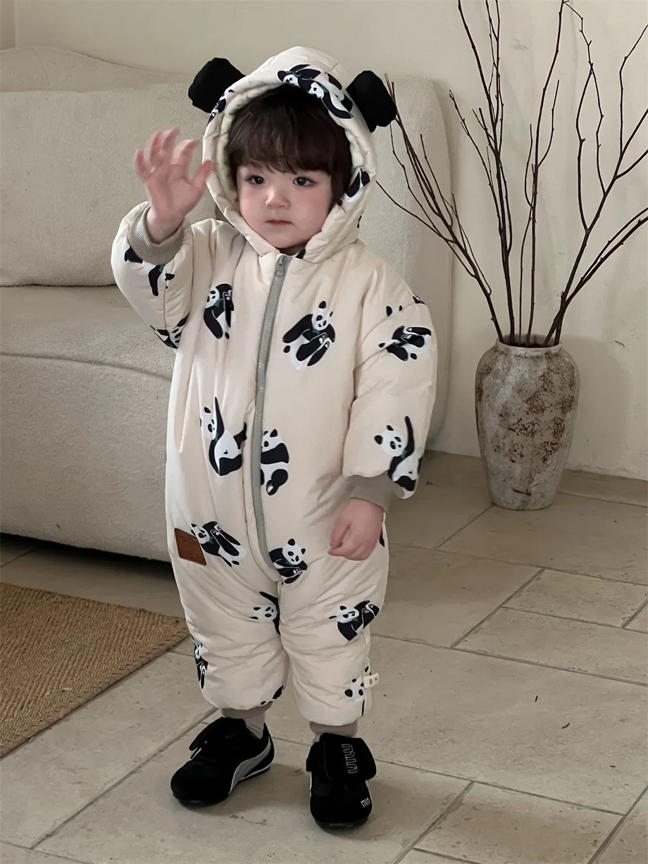 ベビーアウタージャンプスーツ ぱんだプリントキルティング耳付きフーディシンプルジップアップロンパース【mh0007972】