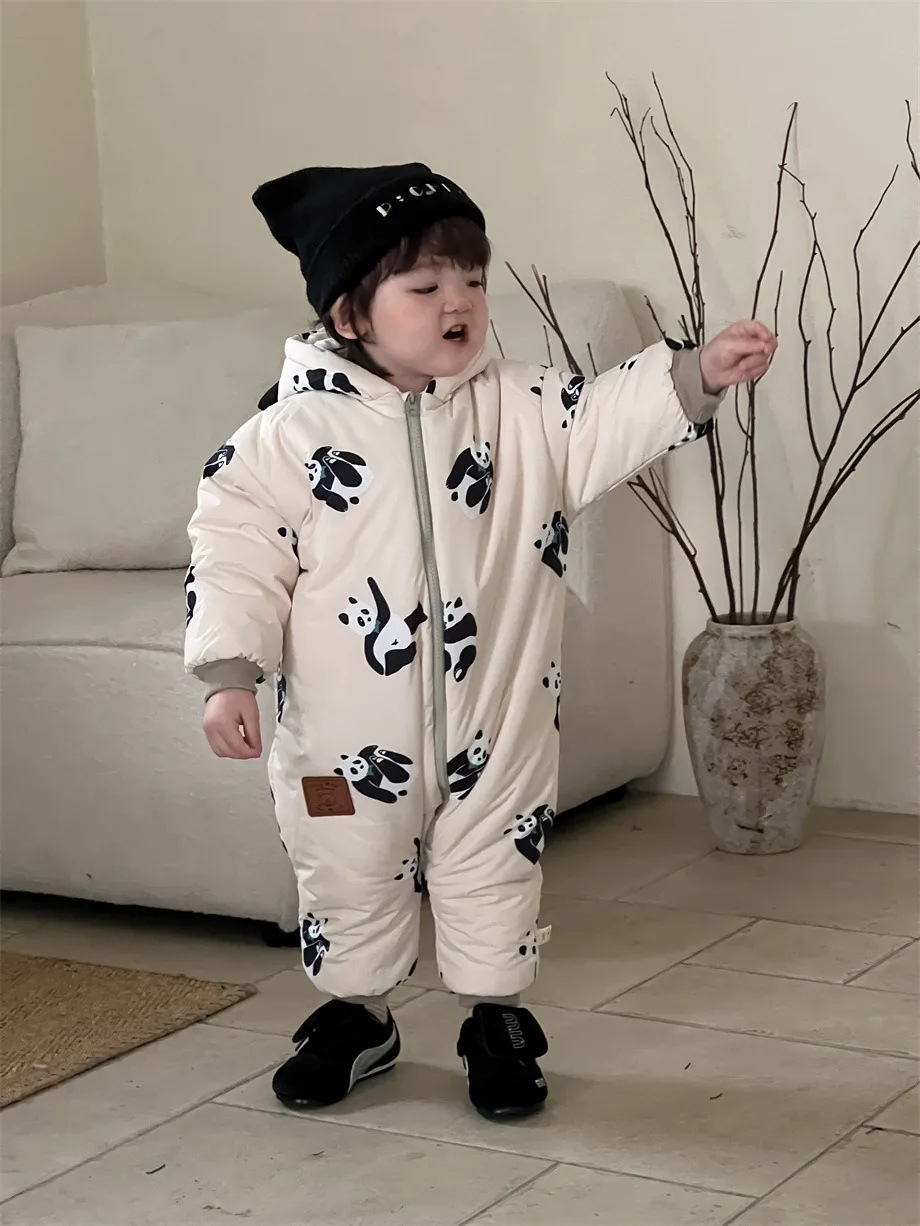 かわいらしいぱんだプリントが特徴的なこのベビーアウタージャンプスーツは、冬の寒さから赤ちゃんを守る完璧なアイテムです。キルティングデザインとフリース素材、さらにプラスヴェルヴェットの厚手パッドで、温かさをしっかりと保ちます。耳付きフーディは、赤ちゃんの頭までしっかり包み込んでくれ、ジップアップ仕様で着脱も簡単です。シンプルながら、ぱんだ柄がアクセントになり、お出かけにもぴったりの可愛らしさを演出します。