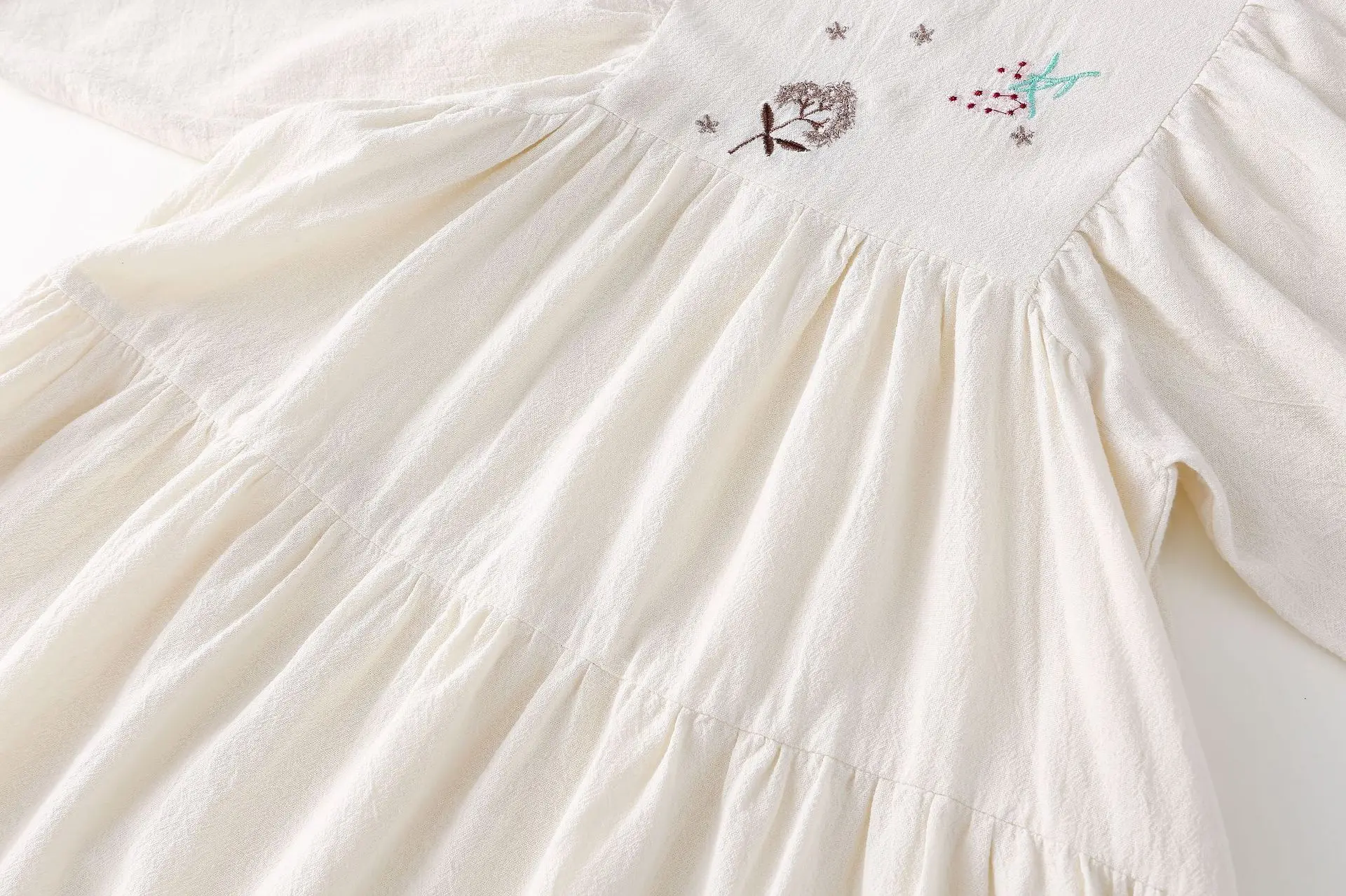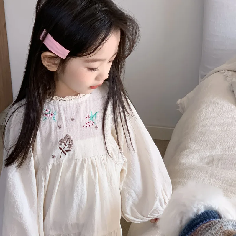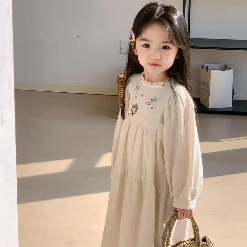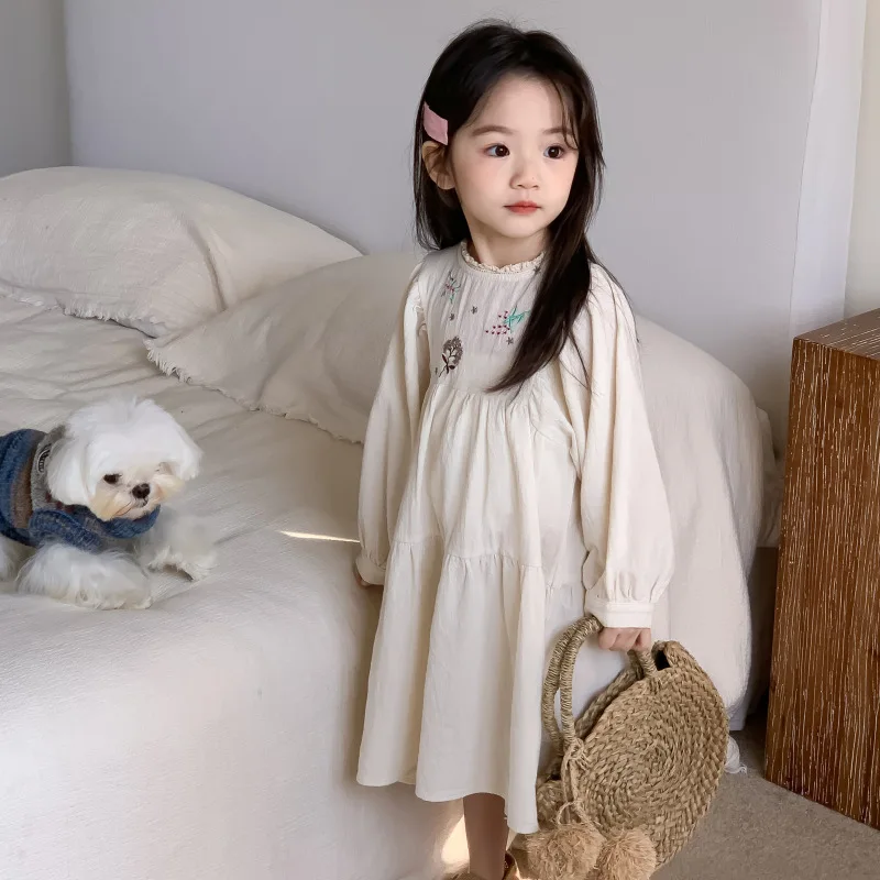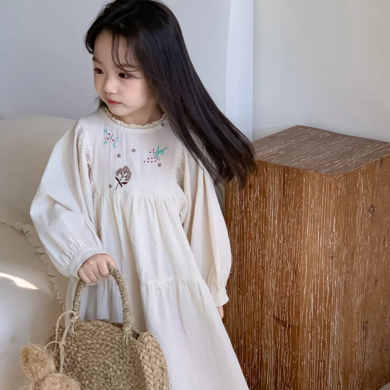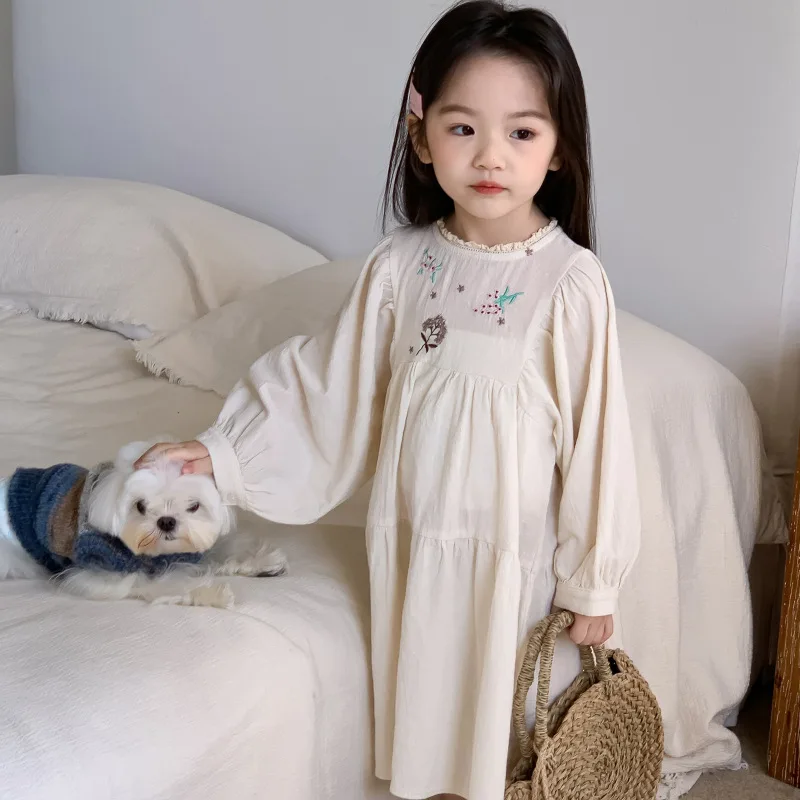 キッズワンピース 刺繍長袖パフスリーブワンピース【mh0008794】