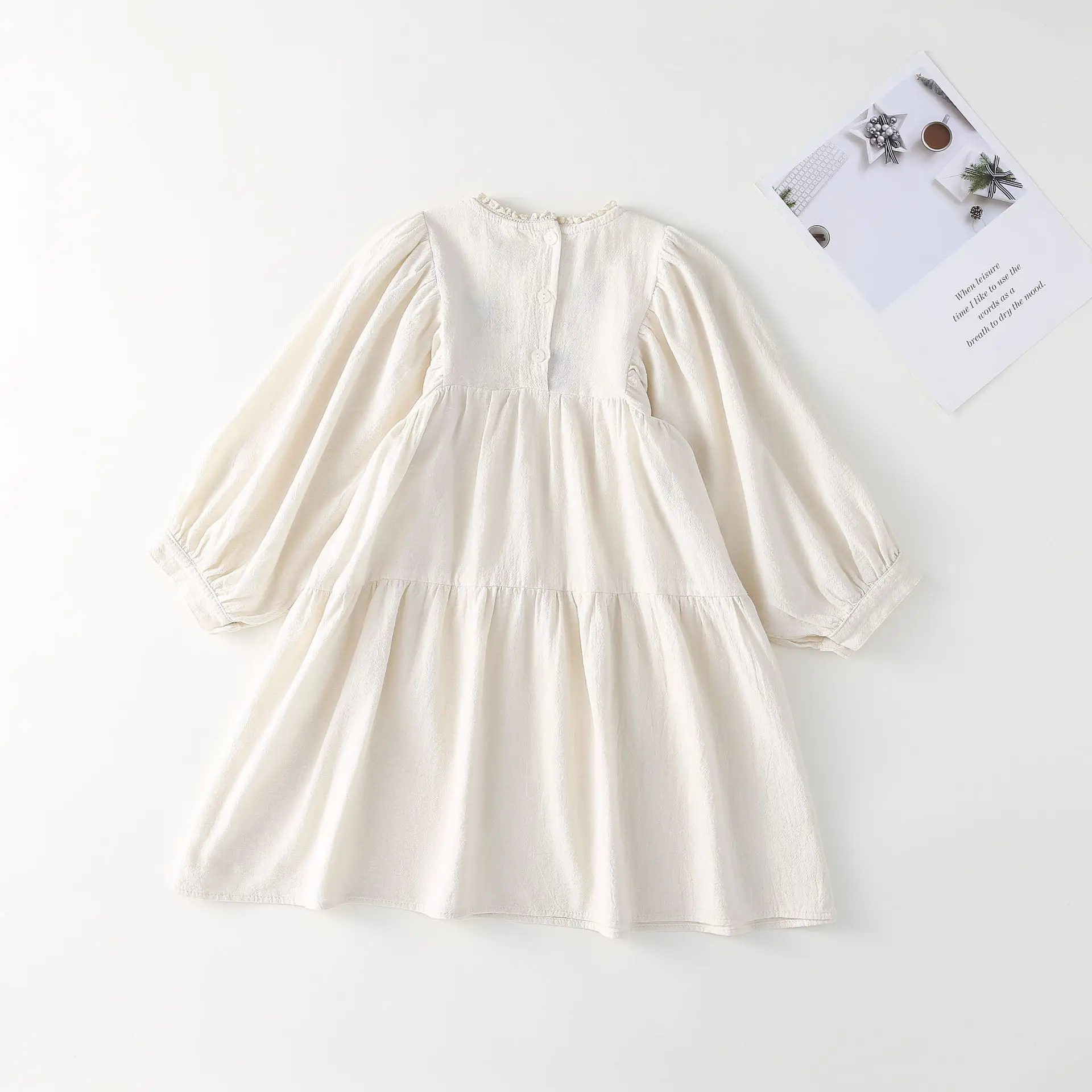 刺繍が施された長袖パフスリーブワンピースです。優雅なデザインが特徴で、特別な日のお出かけやパーティーにぴったりな一着です。柔らかな素材を使用し、着心地も快適で動きやすさも考慮されています。パフスリーブのデザインが可愛らしさを引き立て、エレガントな雰囲気を演出します。長めのスカートは、女の子の可愛らしさを引き立て、さまざまなスタイルに合わせやすいのが魅力です。